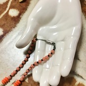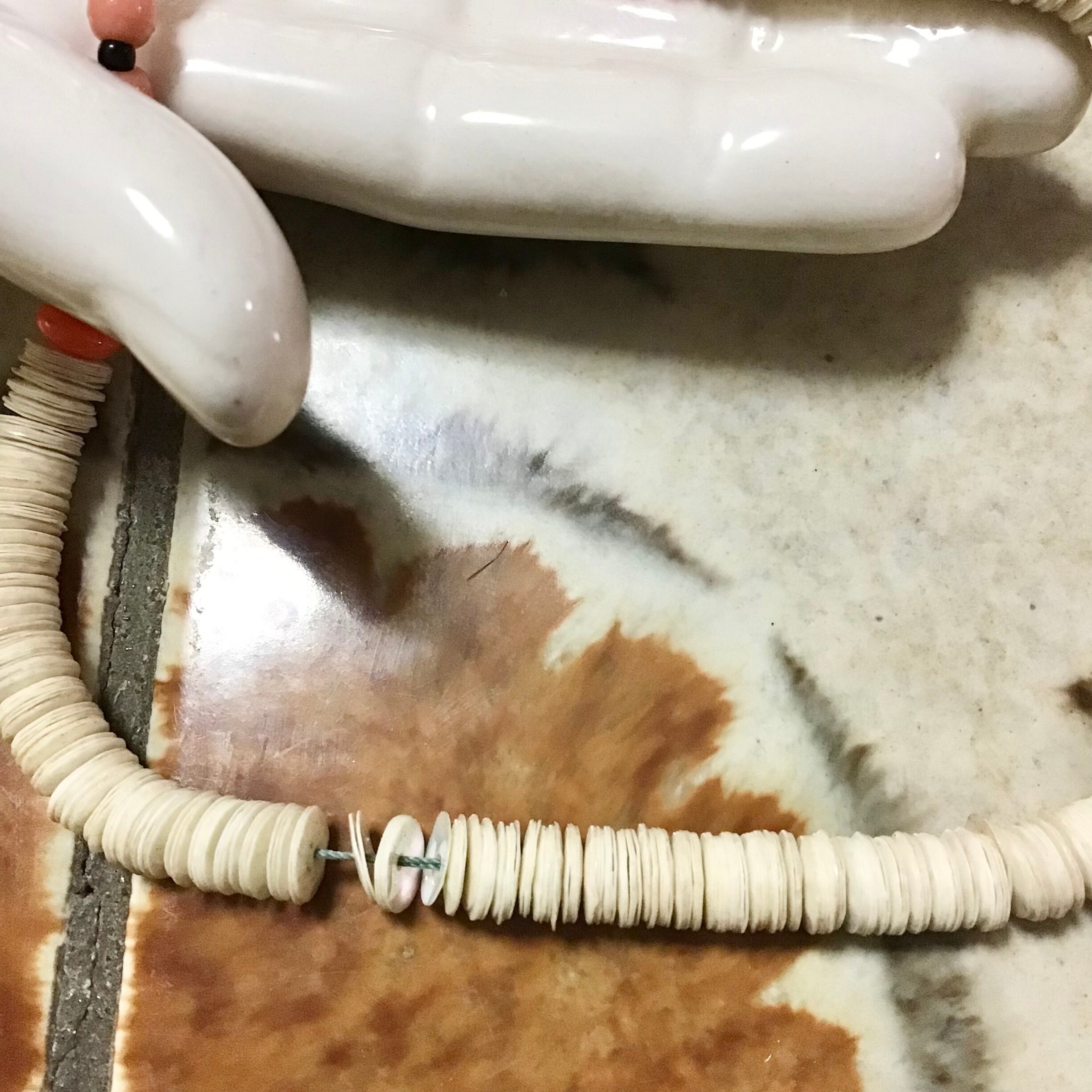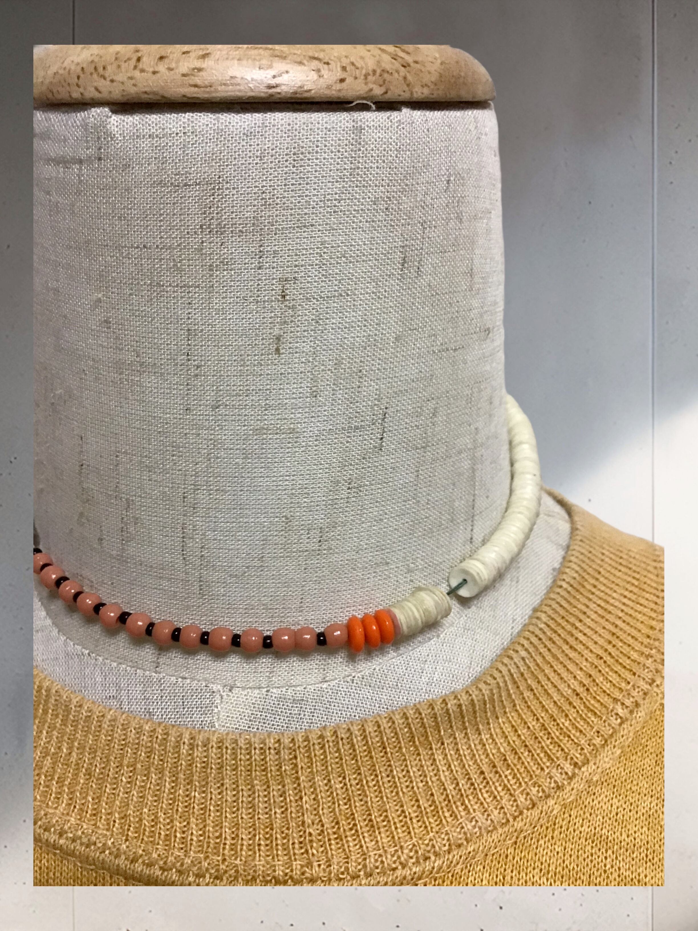 アンティークのネックレス。たくさん重ねられたくすんだ白のスパンコールと、オレンジやピンクのビーズの組み合わせがなんとも言えない可愛いさです♡チョーカーのような長さで重ね着けにもピッタリ◎留め金はねじ式です。自分で留め金を着けるのははかなり大変ですが、ブレスレットとしても可愛いです♡