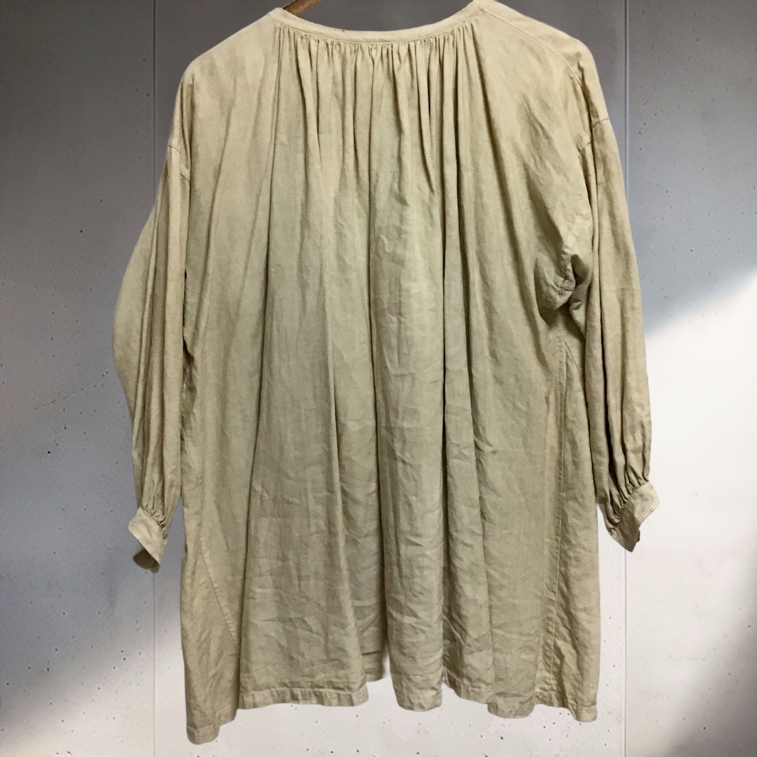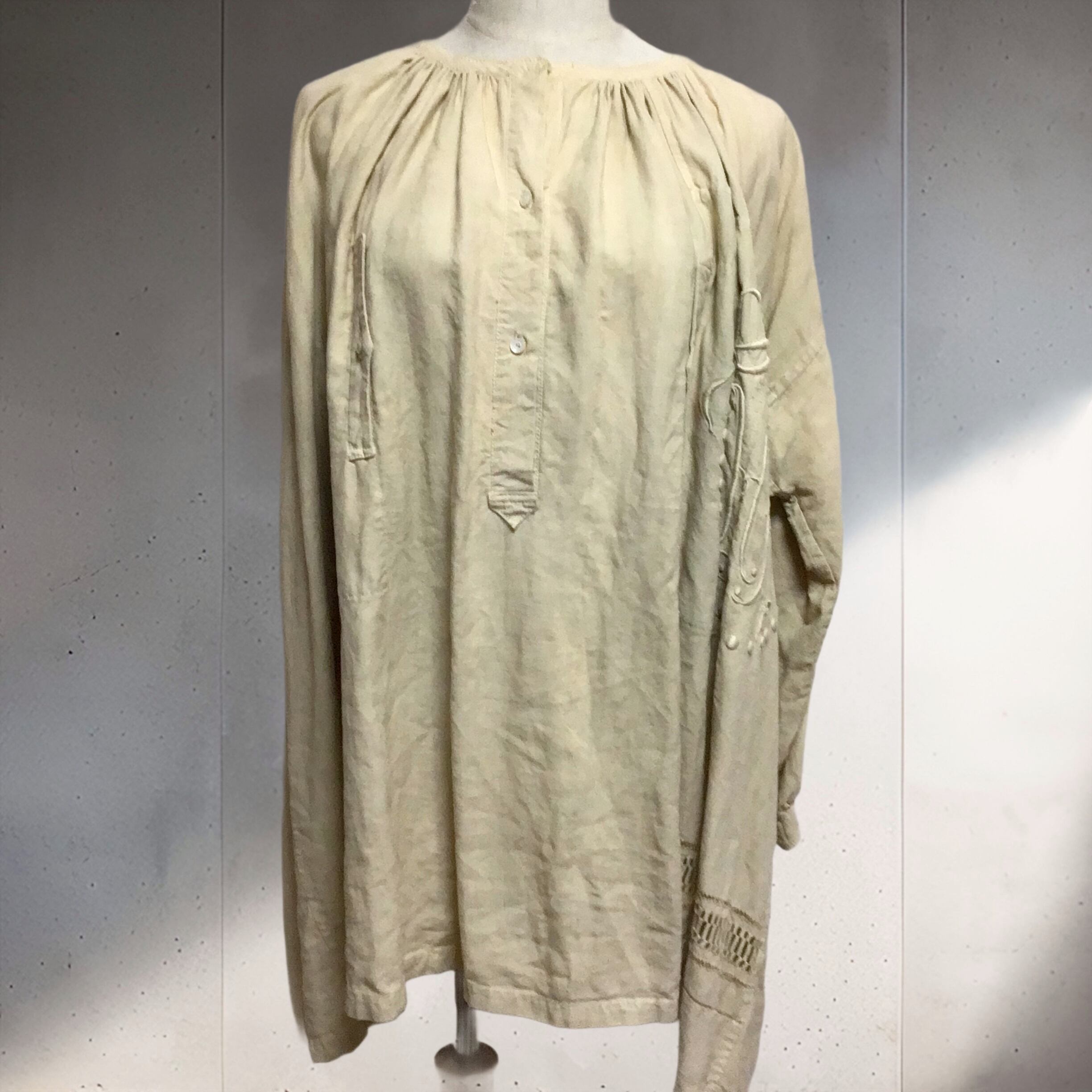 アンティークのリネンシーツをリメイクしたスモック。ベージュの様なお色に染められています。胸の刺繍はとても繊細で立体感もあり本当に素敵です♡染めの色むらか、刺繍左側が薄黒いです。ゆったりと着られるサイズ感で、とろみのあるリネン素材がこれからの季節にぴったりです◎
