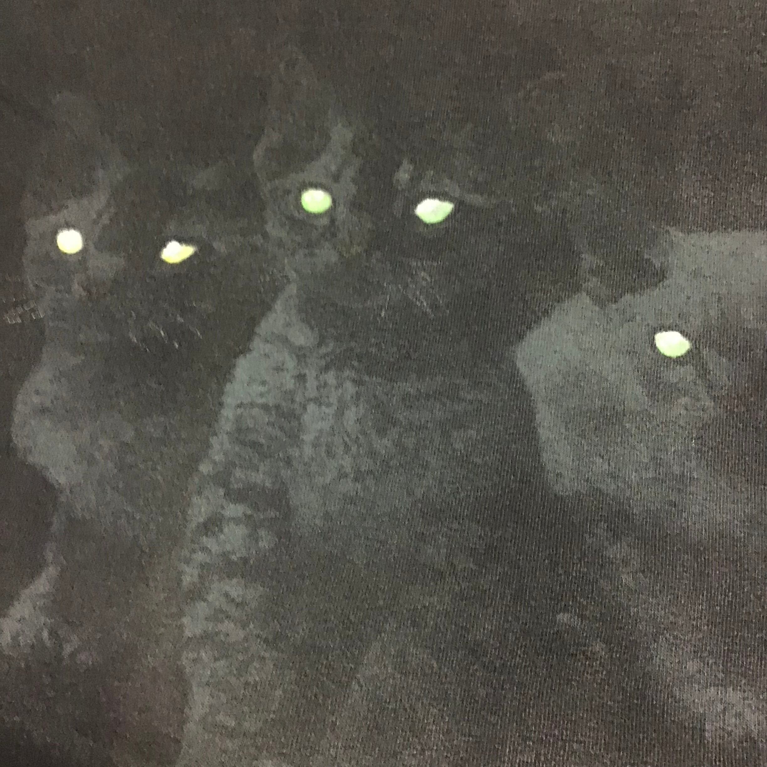 1990年代の後染めTシャツ。猫の瞳に蓄光塗料が塗られ暗闇でとてもうっすらとですが光る仕様です♡染めから薄くと見える猫のプリントがとても良い雰囲気♡染めムラが良いフェード感でチャコールグレーの様なお色です◎ボックスシルエットも今っぽく、袖をロールアップして大ぶりのシルバージュエリーを合わせたいTシャツです!
