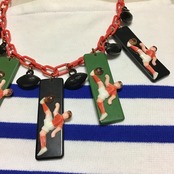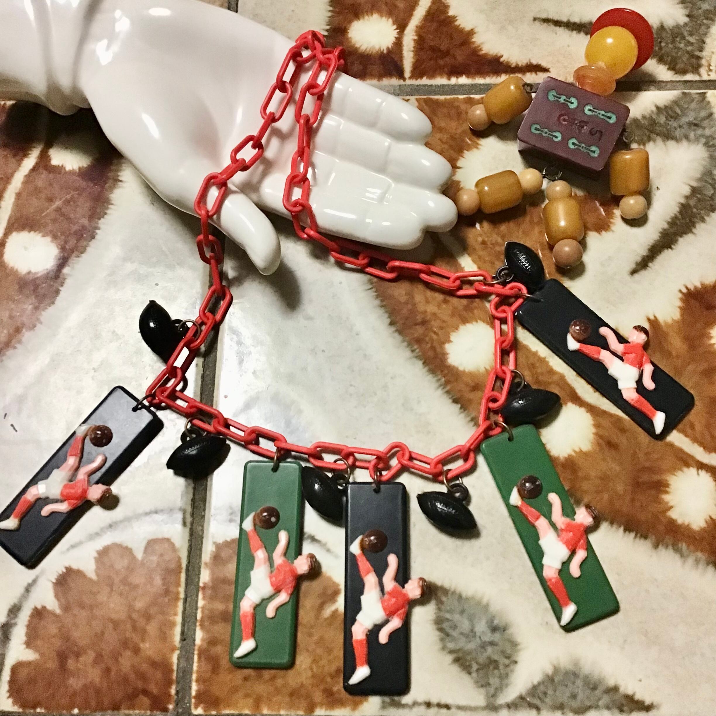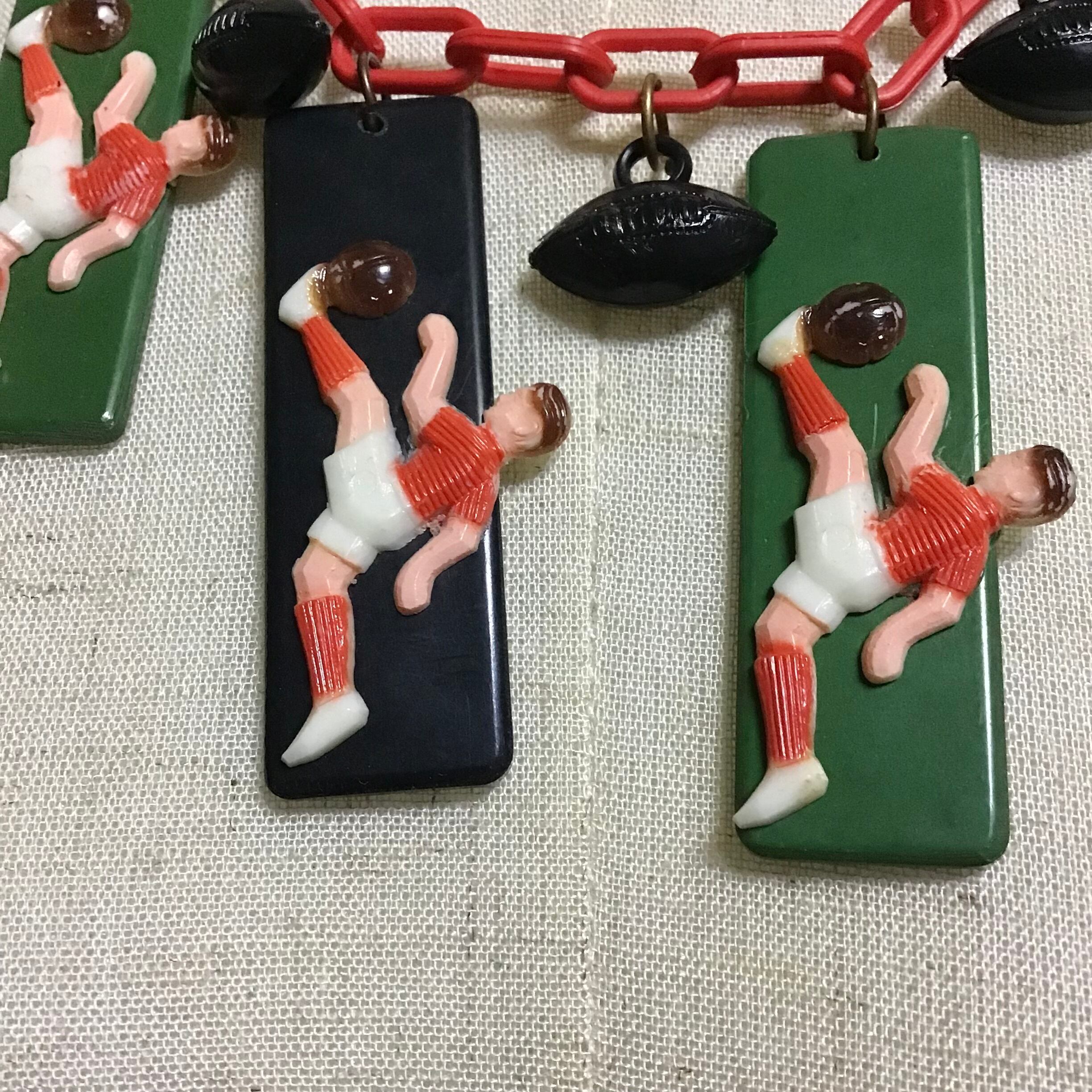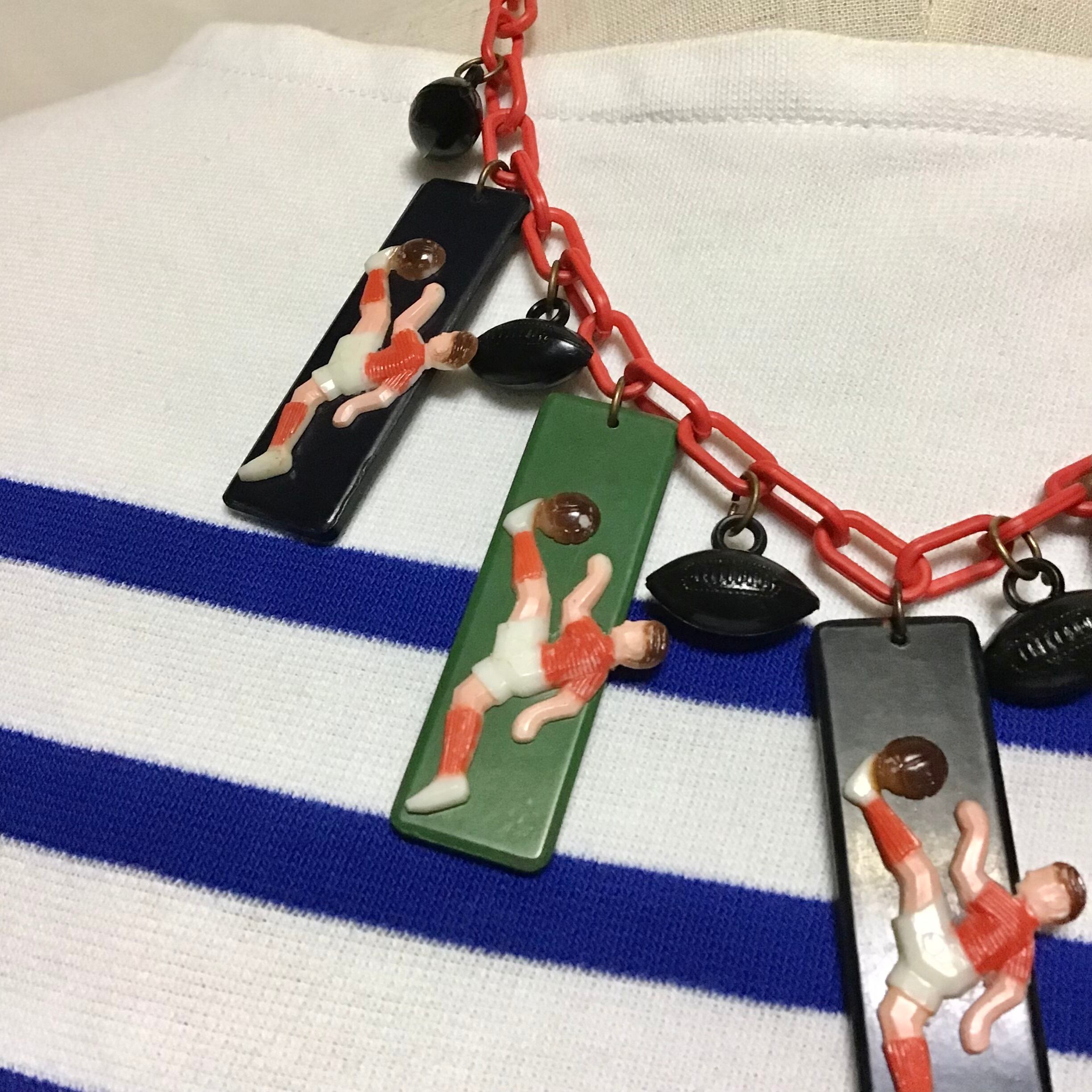 ヴィンテージプラスチックのネックレス。ガラリスと呼ばれるミルクから合成されたプラスチックのプレートにセルロイドのフットボール選手が付いたユニークなデザイン♡カラーリングもカッコ良くコーディネートのポイントになってくれそうです◎シンプルに合わせたり、ボーダーなど柄物とも好相性かと思います♡軽くて着けやすいのも嬉しいポイントです◎