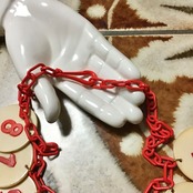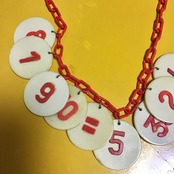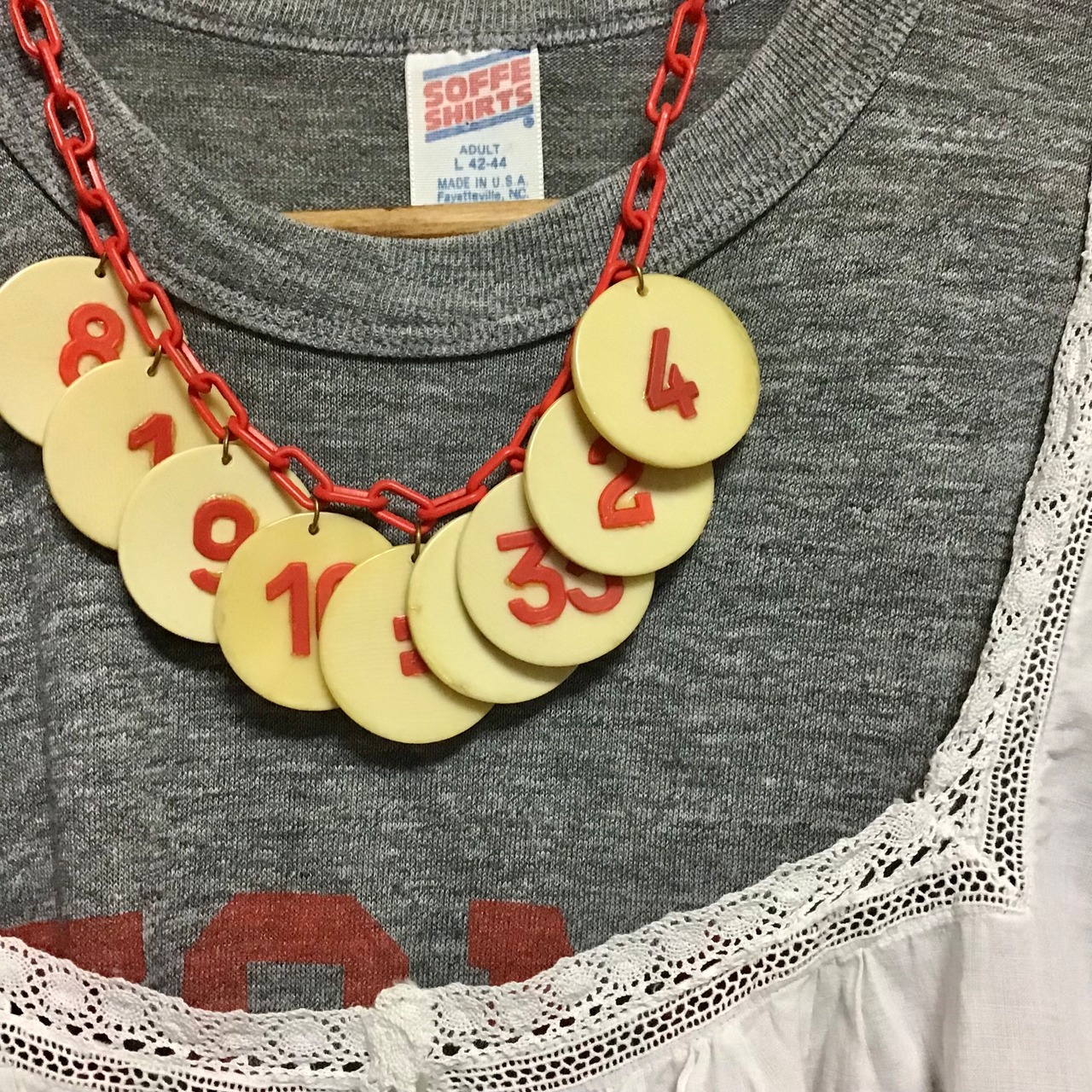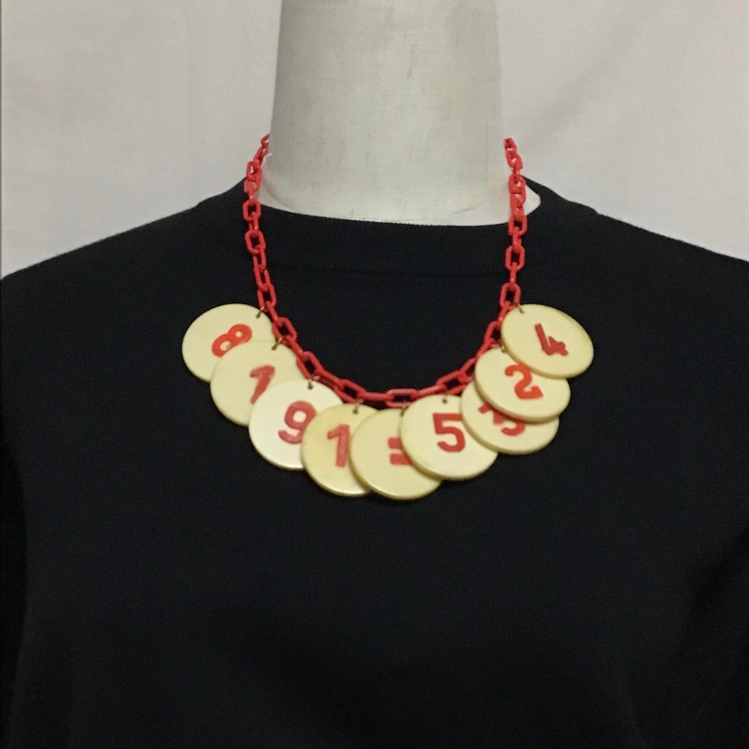 ヴィンテージプラスチックネックレス。様々な数字が入ったプレートが連なるデザイン、カラーも含めポップな雰囲気が良いです♡ヴィンテージのスウェットや、白いタンクトップにヴィンテージデニムなどコーディネートの想像が膨らむ店主です◎