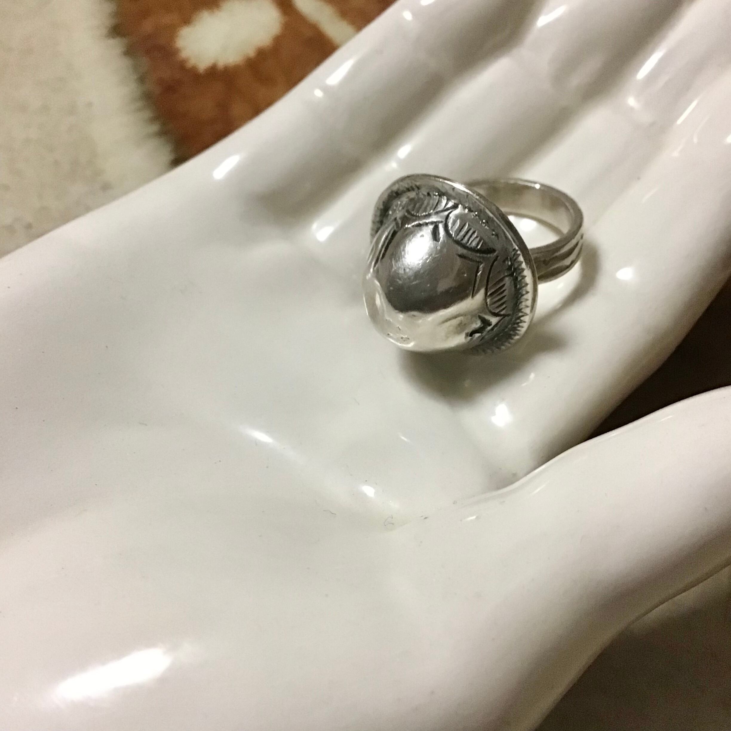 トゥアレグ族のシルバーリング。立体感のあるデザインはめるととても可愛いです♡周りに入った柄もさりげなく良い雰囲気◎凹みはありますがそれもまた味わいとなっています!