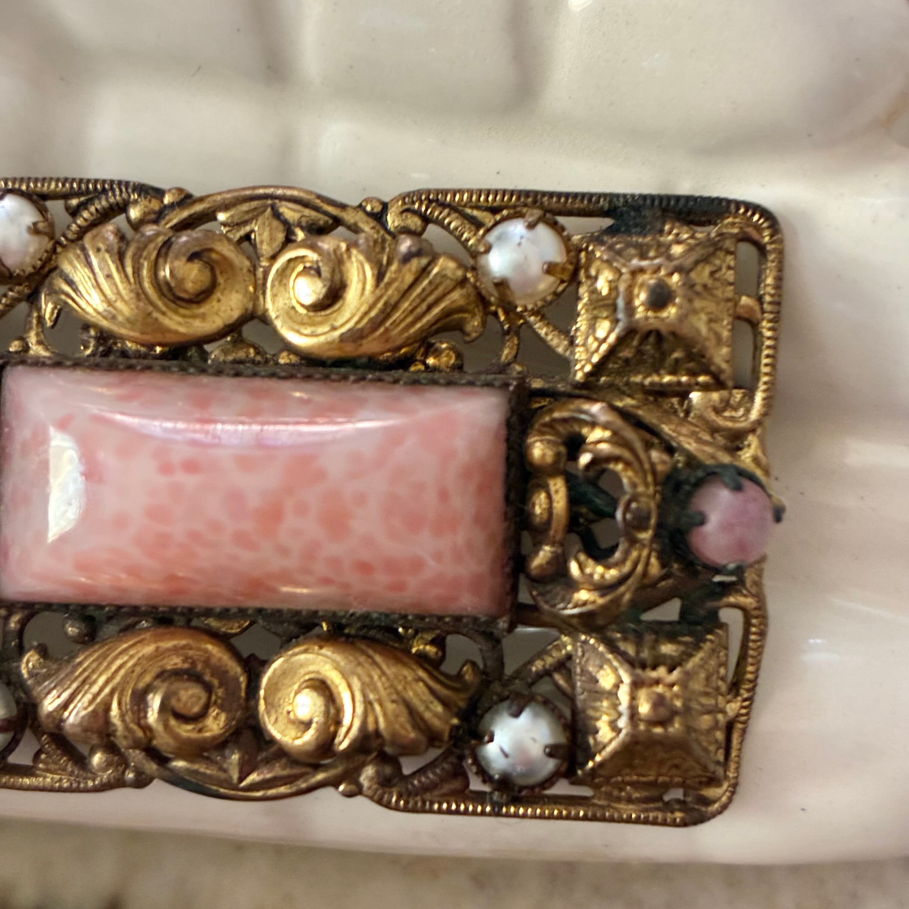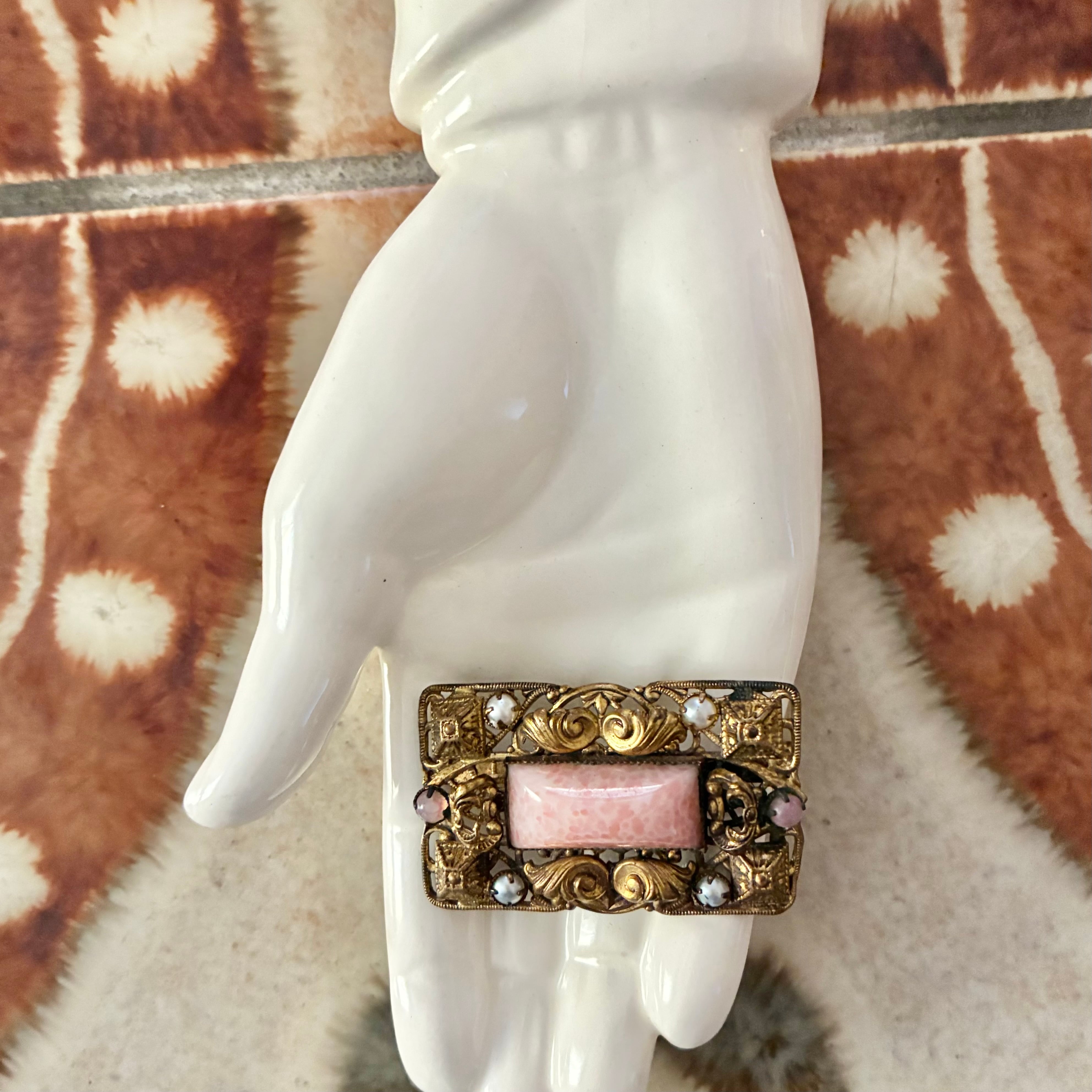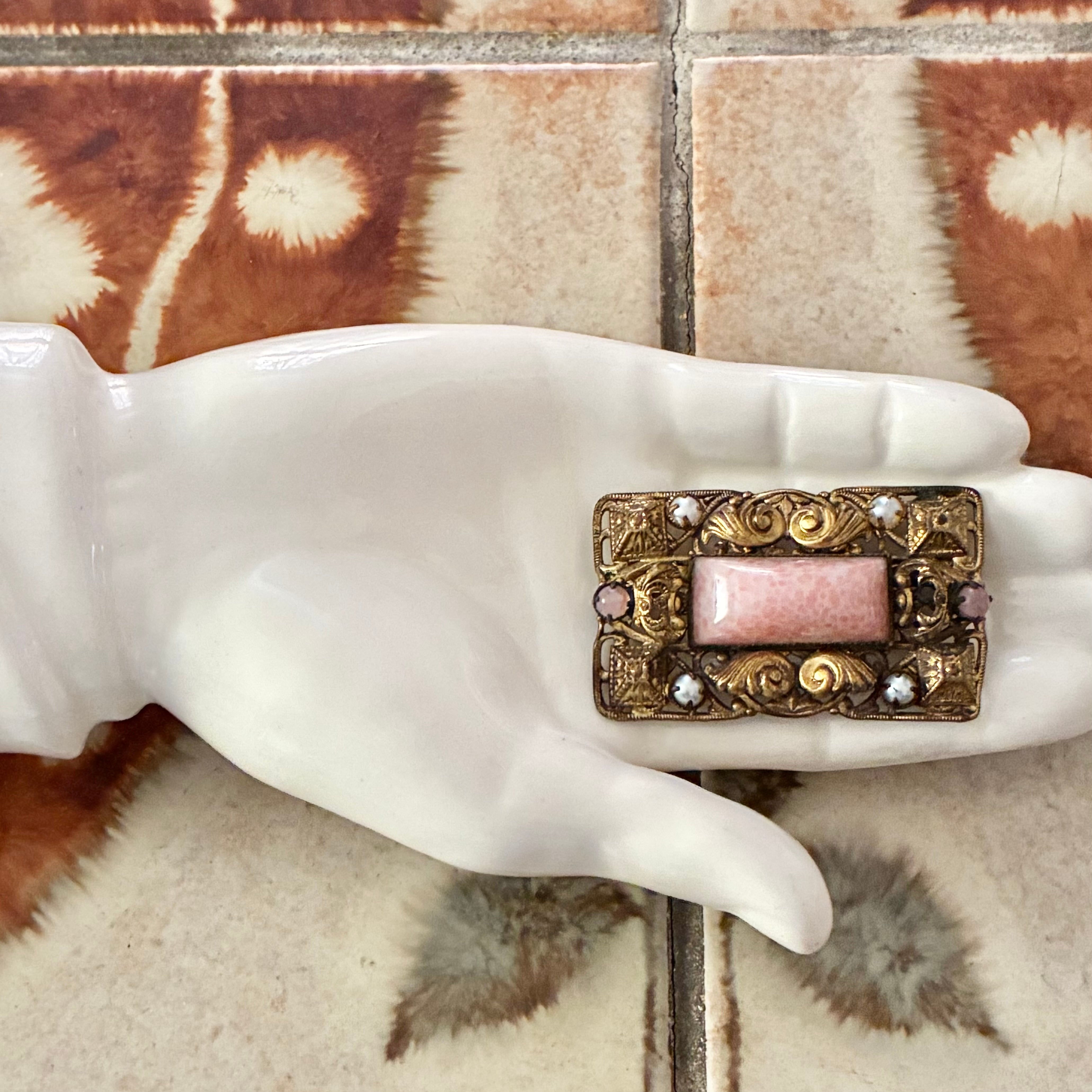 1950年代のブローチ。細かな細工が美しく可憐なデザインです♡サイズも程よく、デニムに白ブラウスやオールブラックなど、ピンクがポイントになるコーディネートに合わせてみてはいかがでしょうか◎