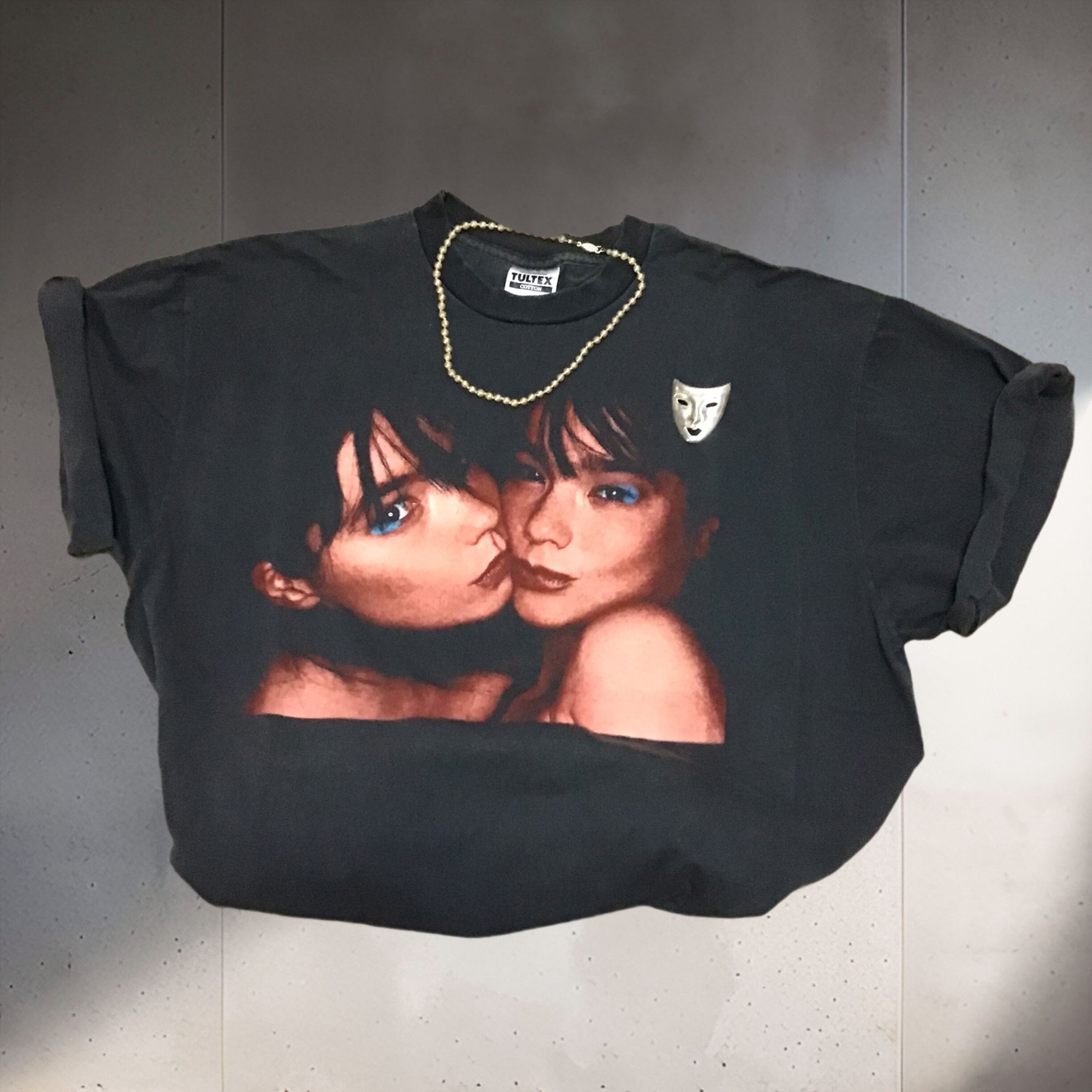 フェードブラックのボディにフォトプリント、背中のロゴもイケてるTシャツです◎近年のもので少し荒目のプリントが雰囲気も良く、何よりこのビョークがとっても可愛いです♡袖をロールアップしてパールやゴージャスなジュエリーを合わせるのが店主おすすめ◎ゆったりサイズなので男性の方がシンプルに着てもとても良いです◎