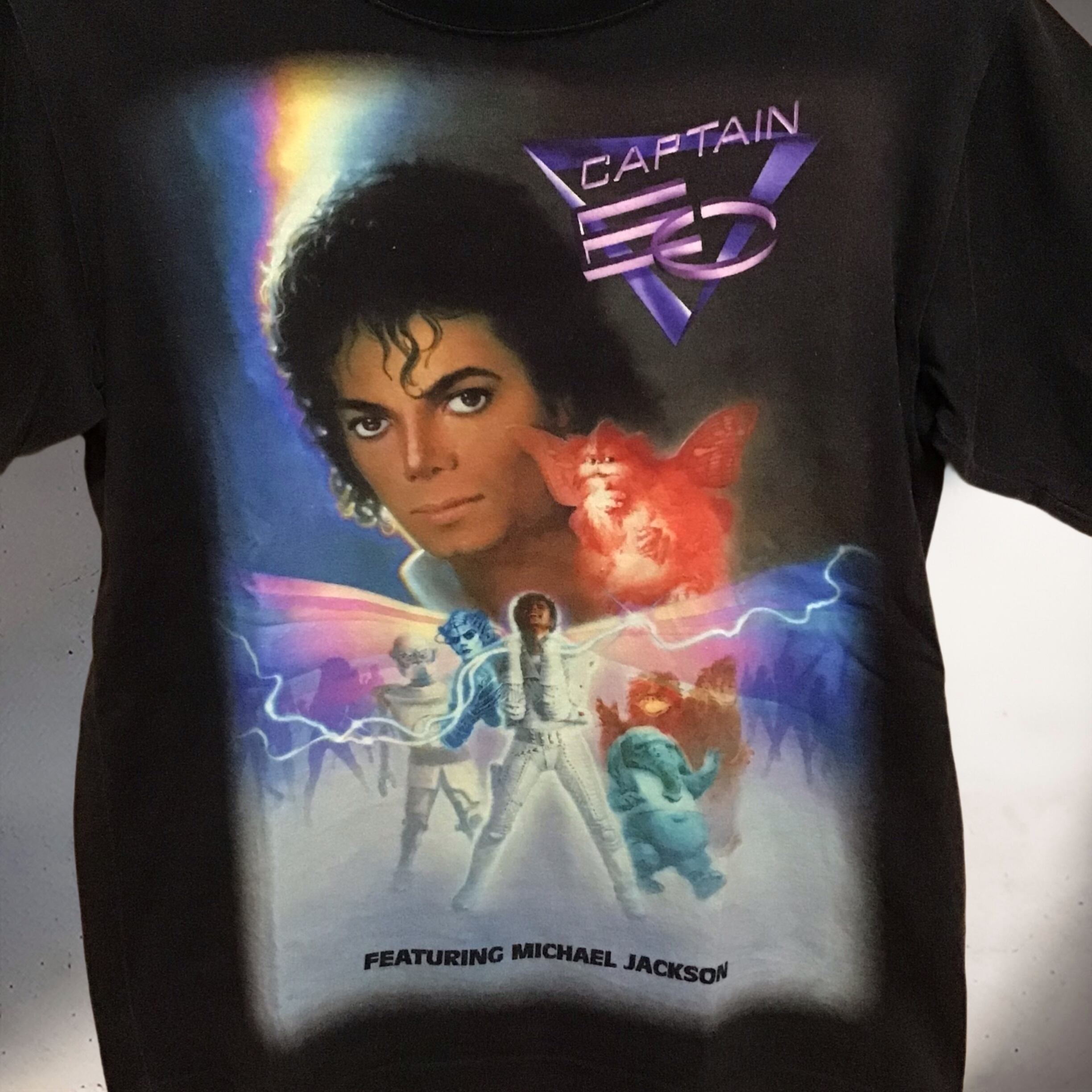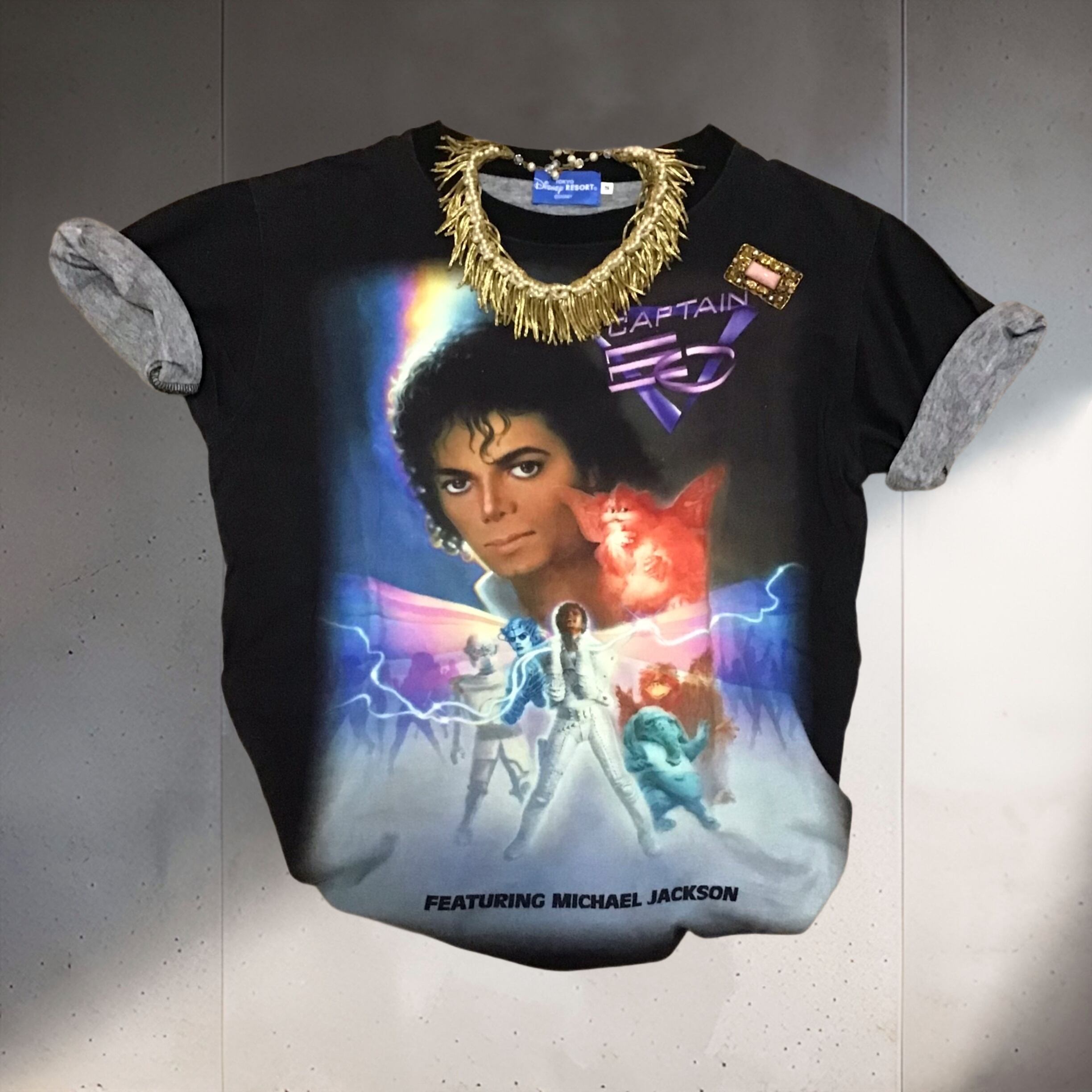 キャプテンEO、マイケルジャクソンTシャツ。東京ディズニーランドのオフィシャルです◎少し色褪せはありますが、スペーシーなデザインや色使いも良く個人的にお気に入りです◎キレイめスラックスにホワイトソックスとレザーシューズでマイケル気分のコーディネートを!