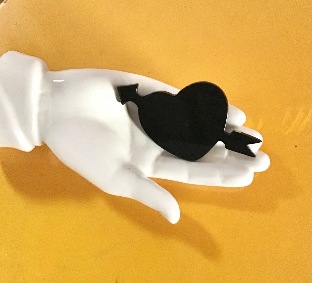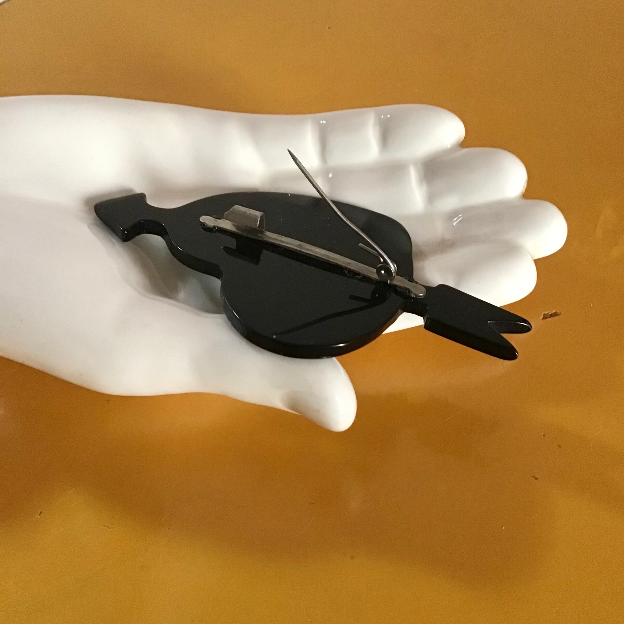 1960年代のプラスチックブローチ。黒一色なのが意外と珍しいシンプルなデザインで、可愛らしくなりすぎずおすすめ♡プラスチックで軽いので、ジャケットはもちろんブラウスやニットなどいろいろアイテムと相性良しです!薄い傷はありますが雰囲気の良いお品です◎