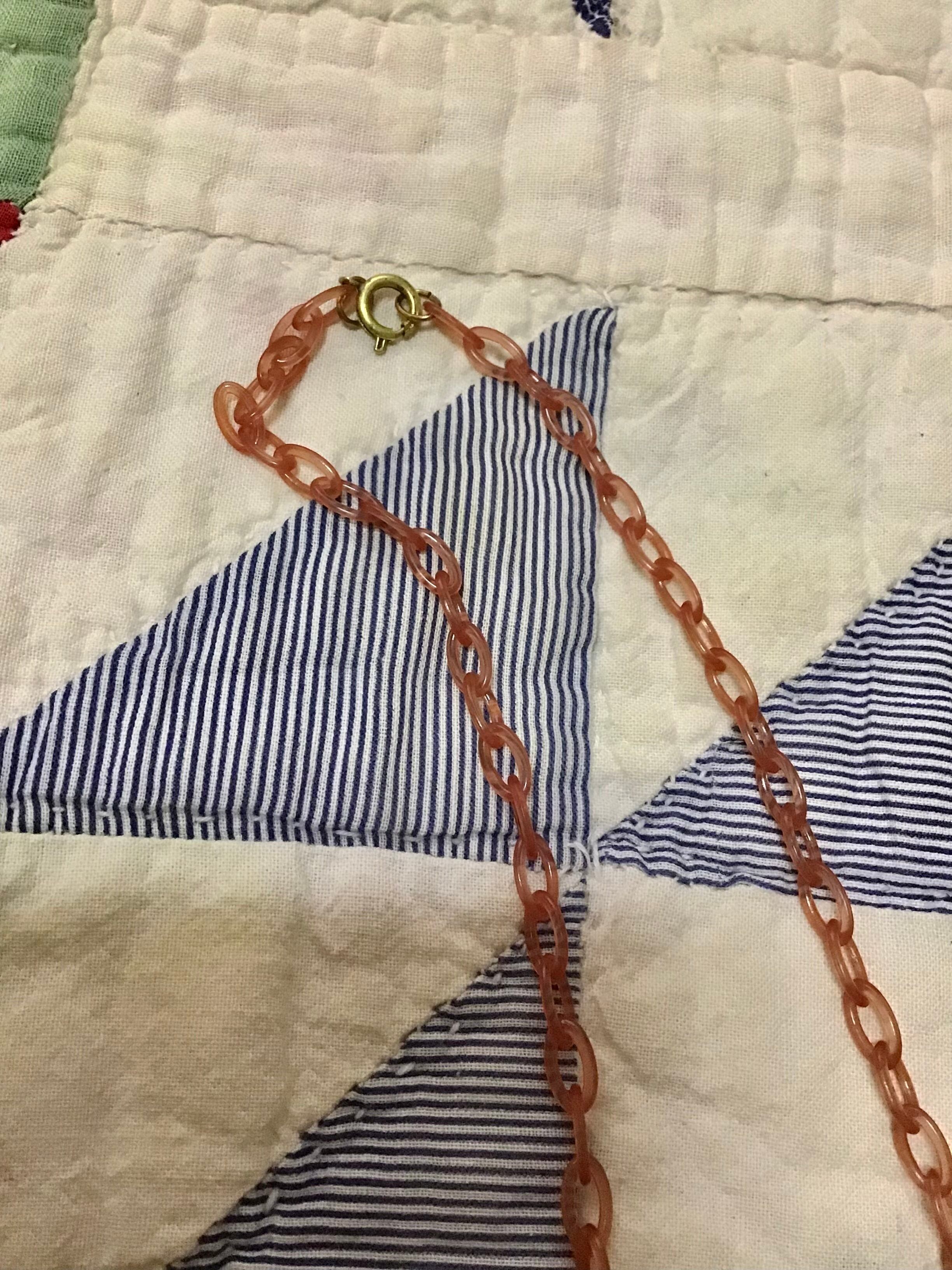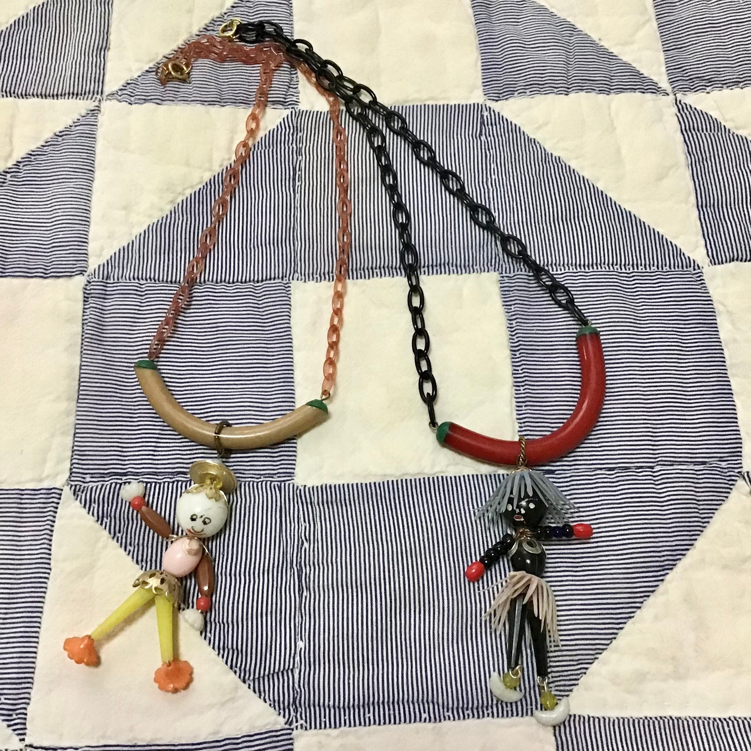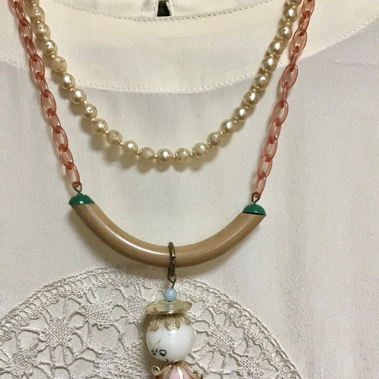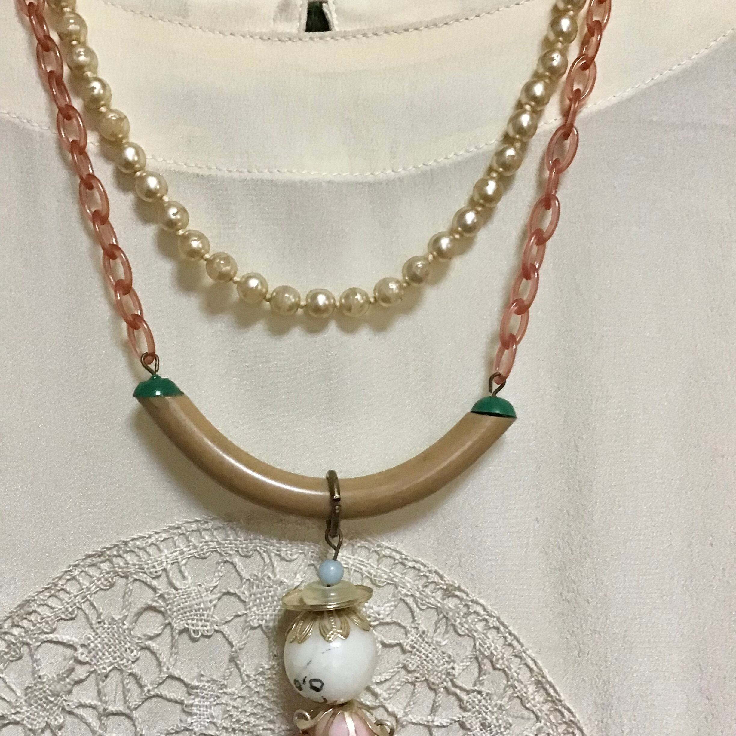 1950年代のパーツを使ったモチーフが可愛いネックレス。それぞれのオールドプラスチックパーツの質感も良く、ピンクベージュのプラスチックチェーンも良い雰囲気です♡ゆらゆら揺れるモチーフがワンピースやレースにぴったり合いそうです♡
