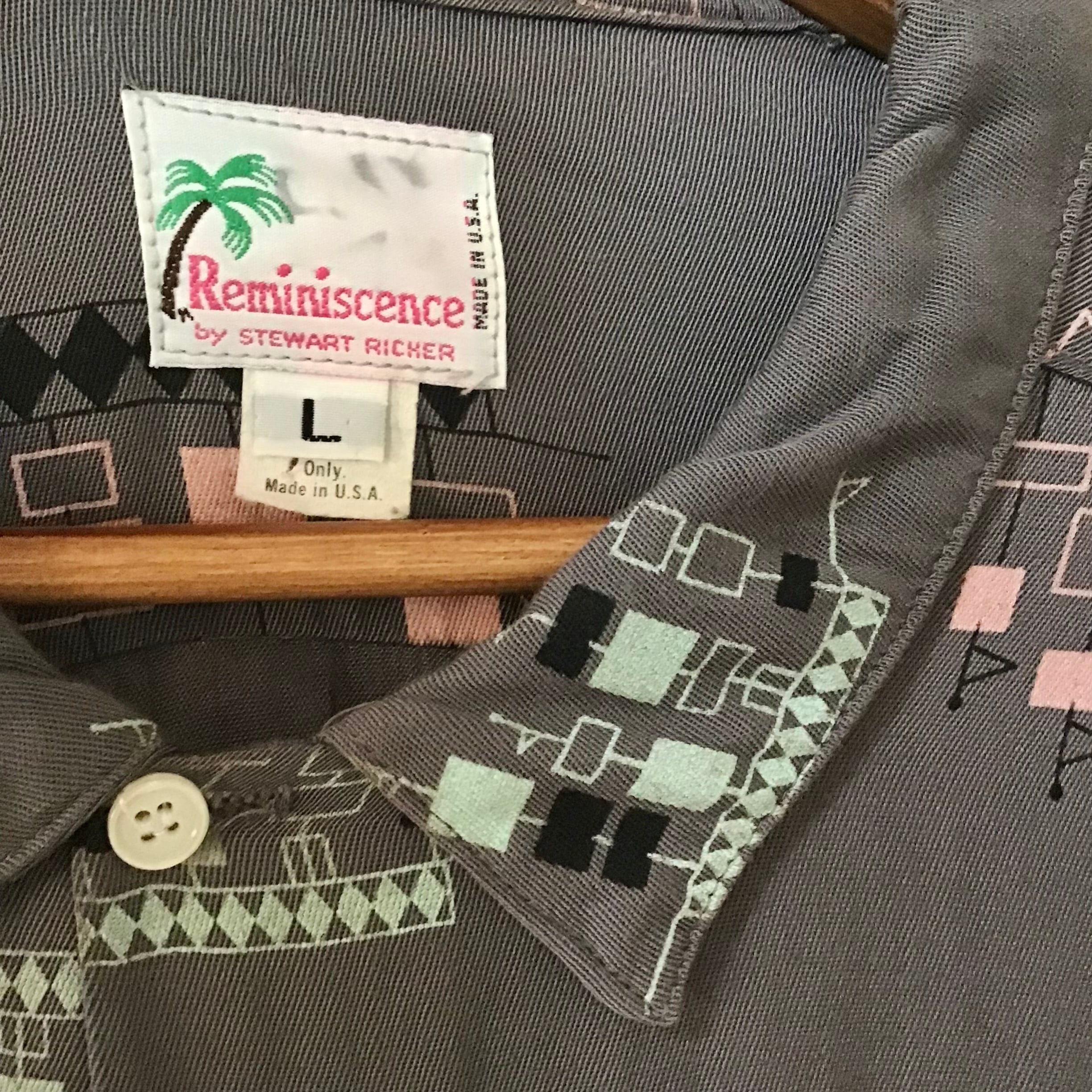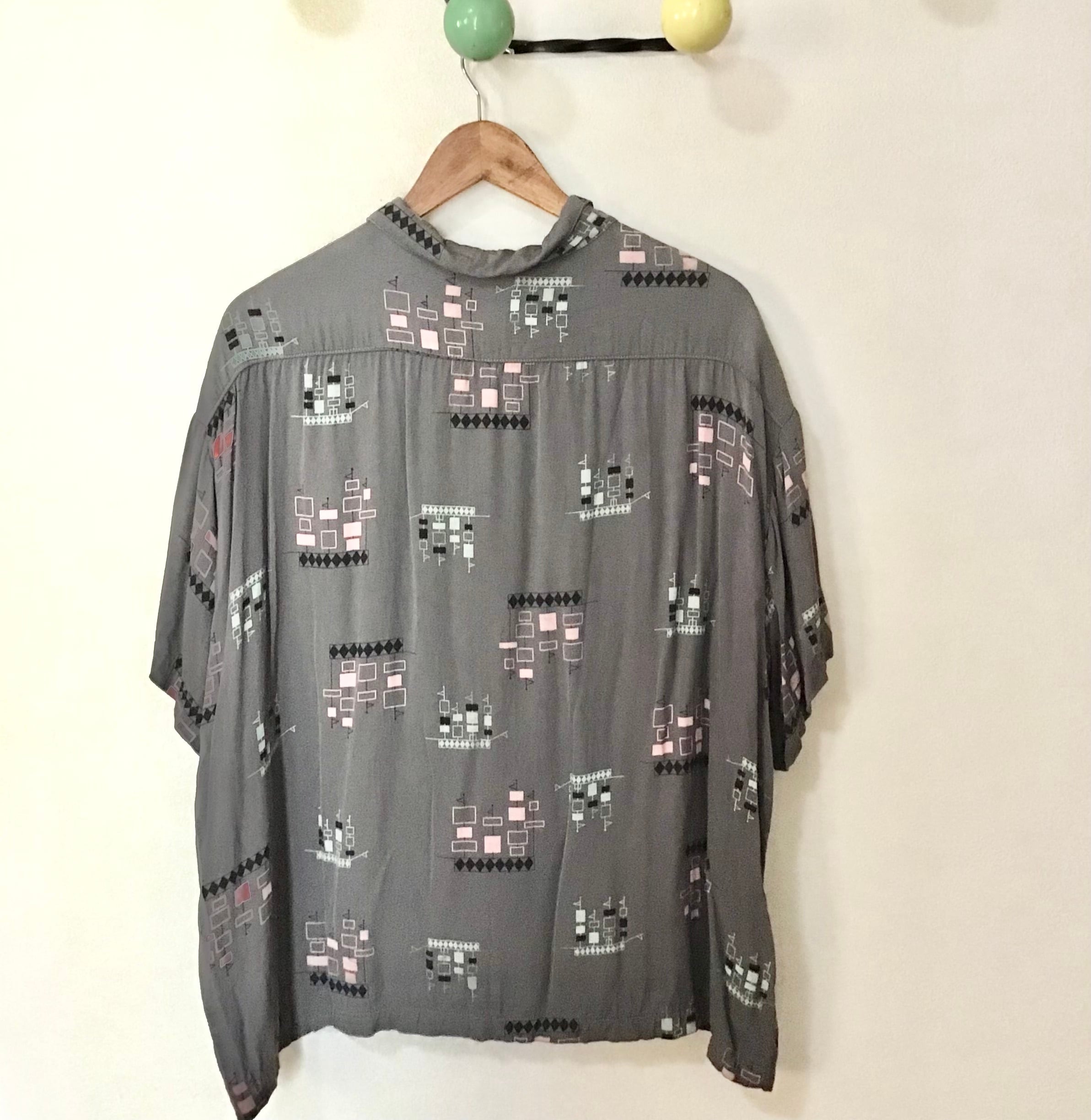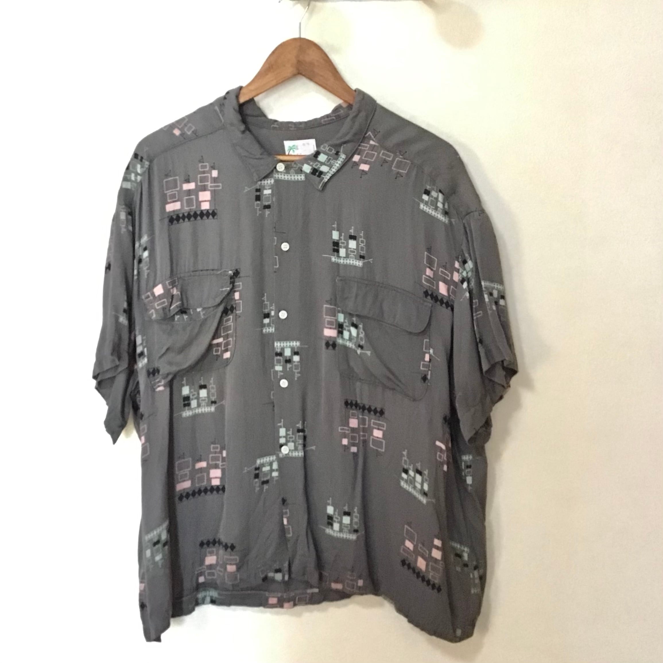 リラックスしたサイズ感のレーヨンシャツ。グレーベースにピンクやグリーンのパステルカラーの船が可愛いナイスプリント♡とろみのあるレーヨン素材がとても良い雰囲気で、女性がゆるっと羽織っても良いですし男性の方にもおすすめです◎左肩付近に傷あり