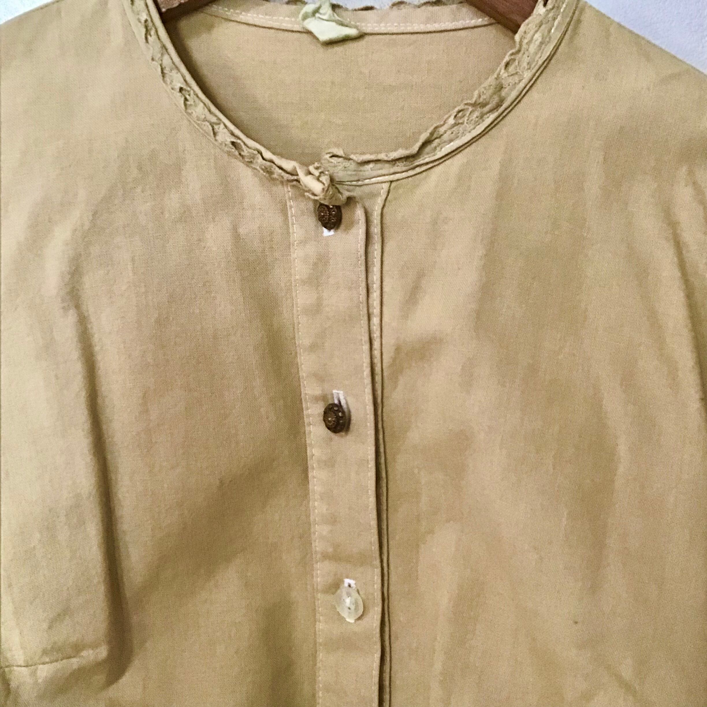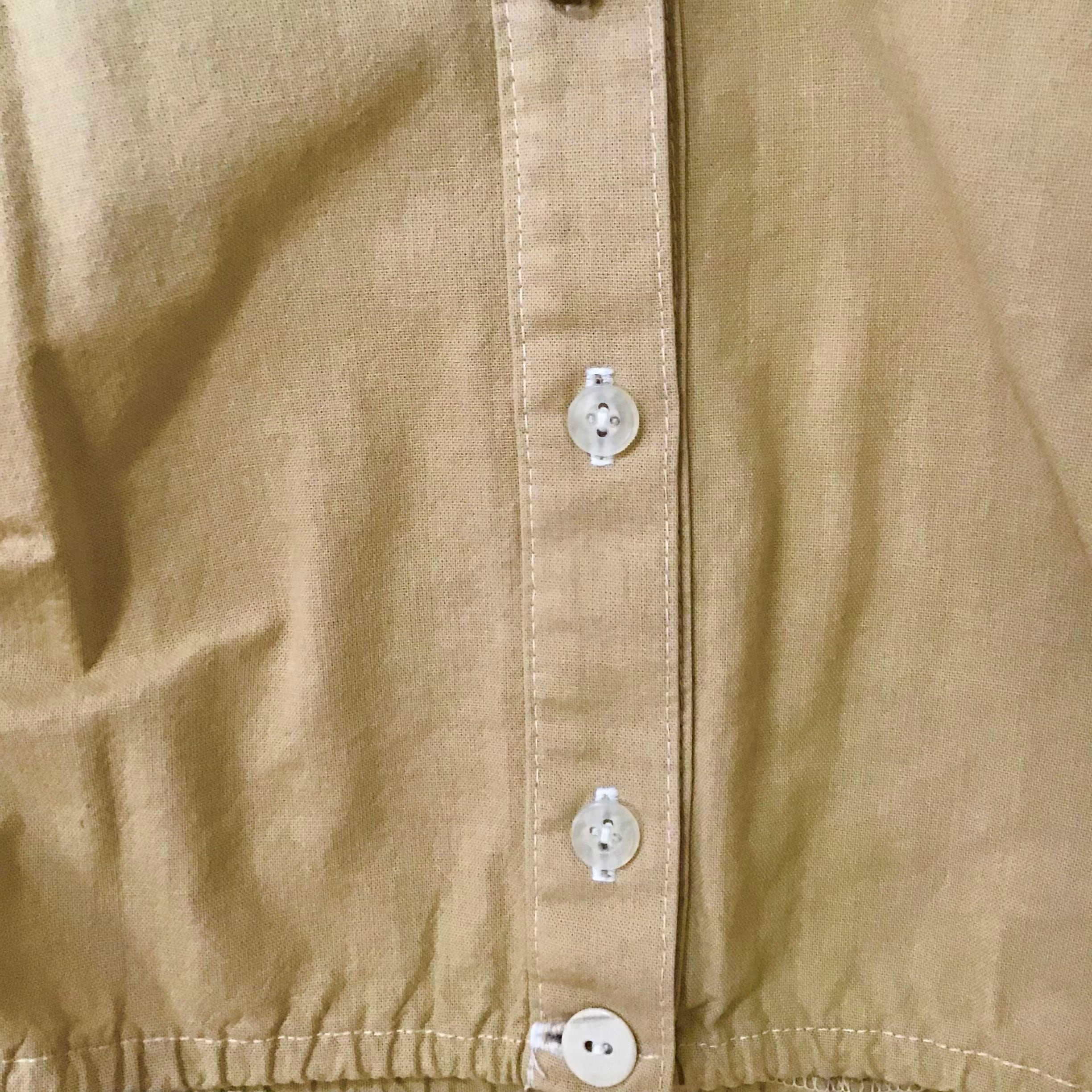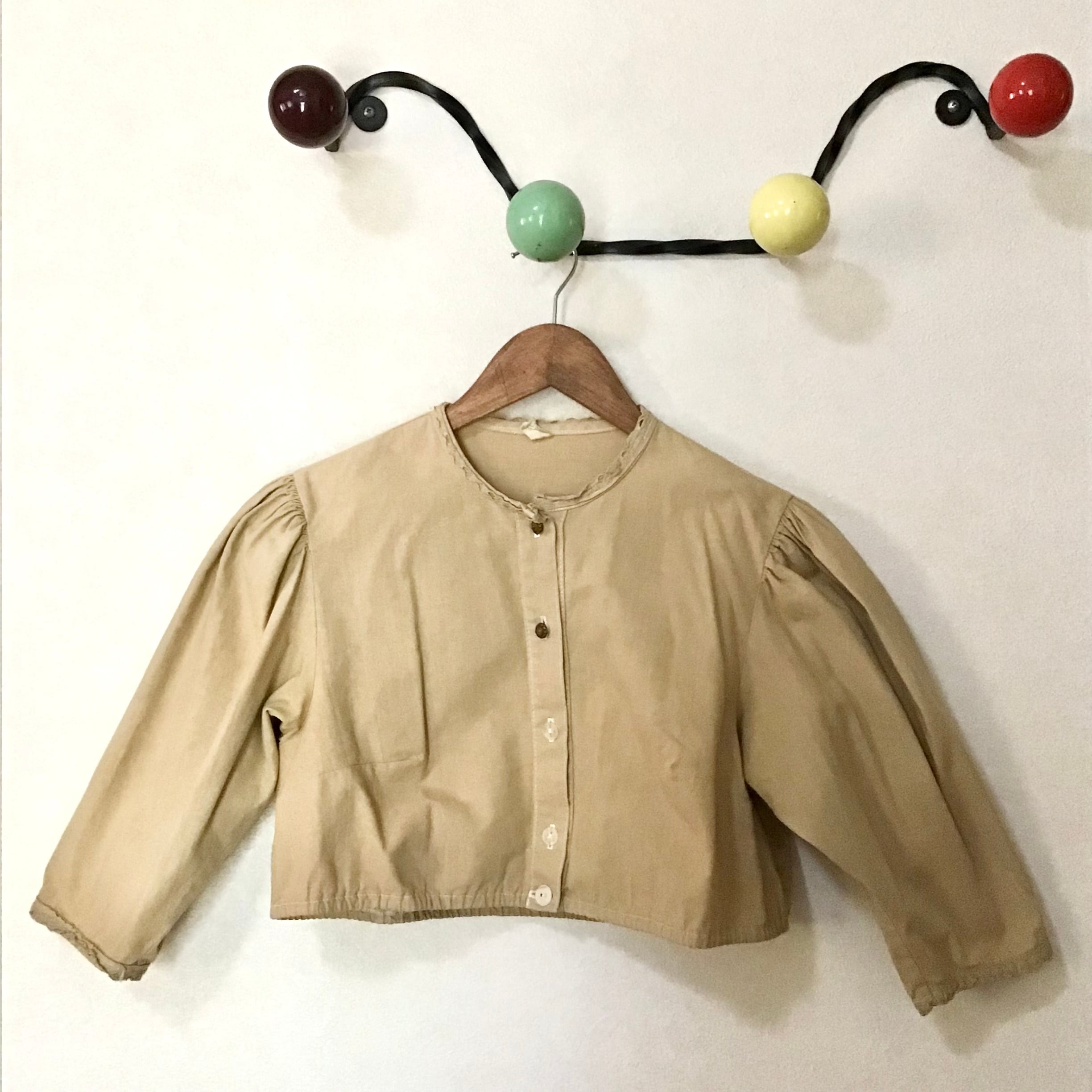 ベージュに後染めされたチロリアンブラウス。比較的しっかりめの生地でボタン下3つは付け替えられています。ショート丈を活かしてハイウエストのワイドパンツに合わせたり、ボレロのように羽織っても可愛いです◎