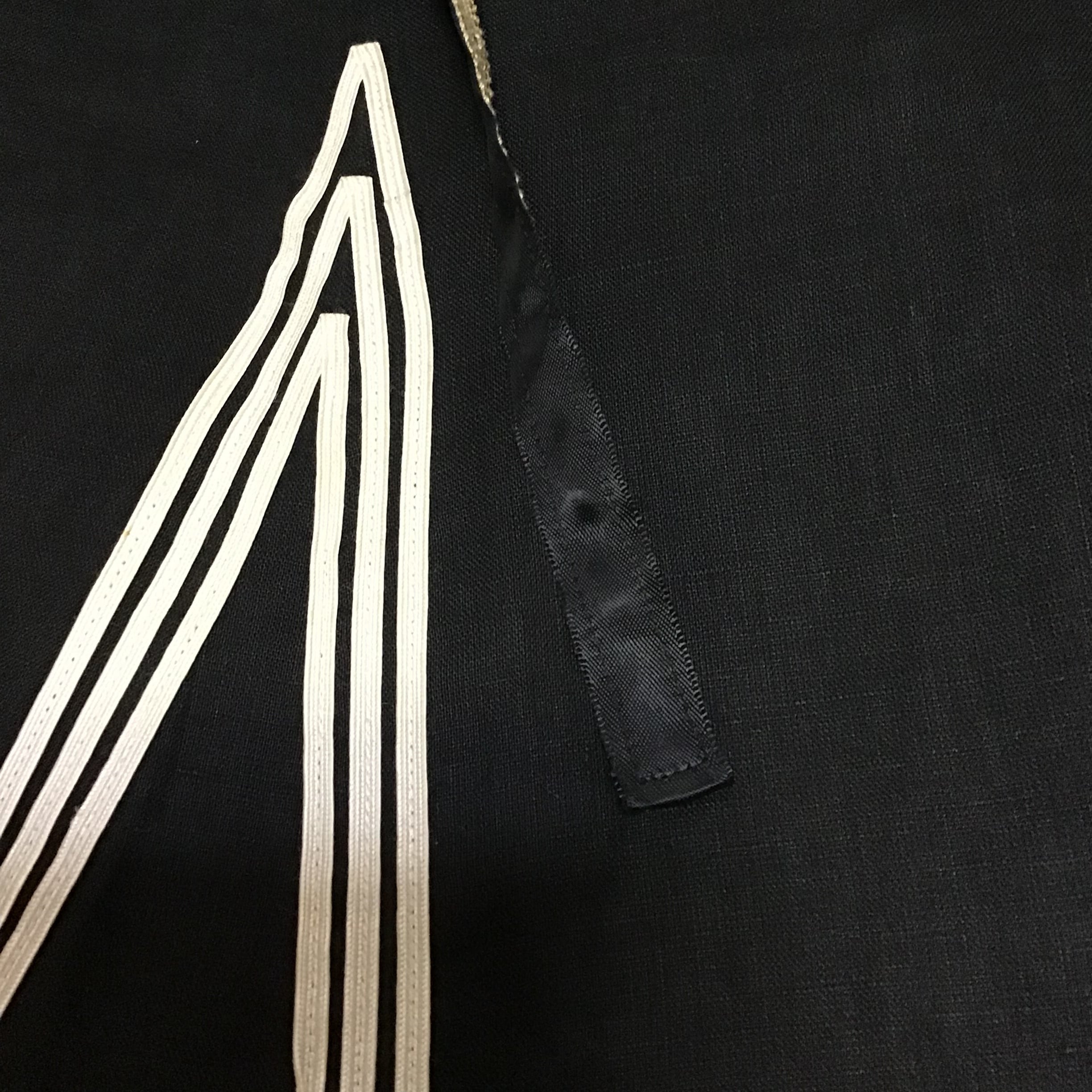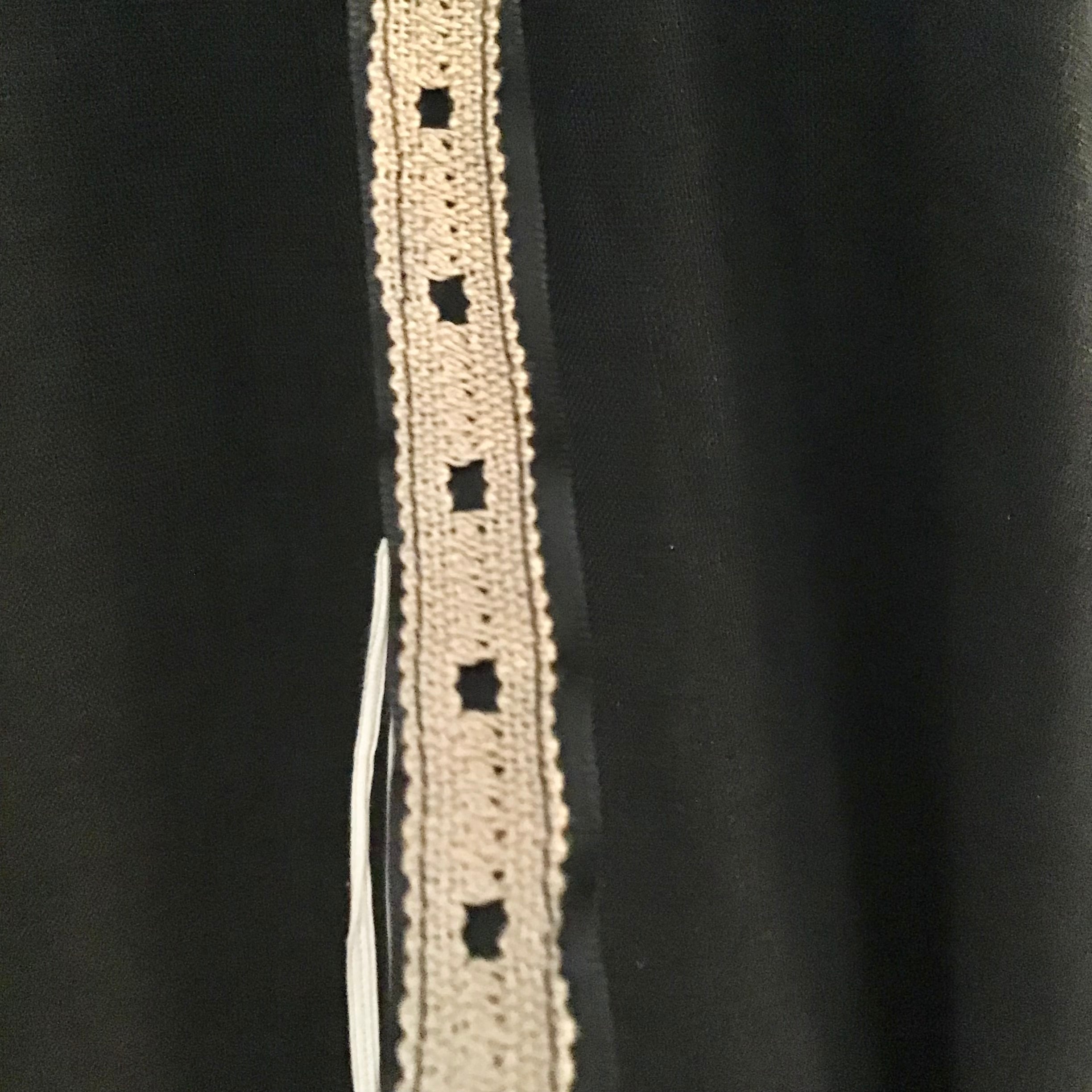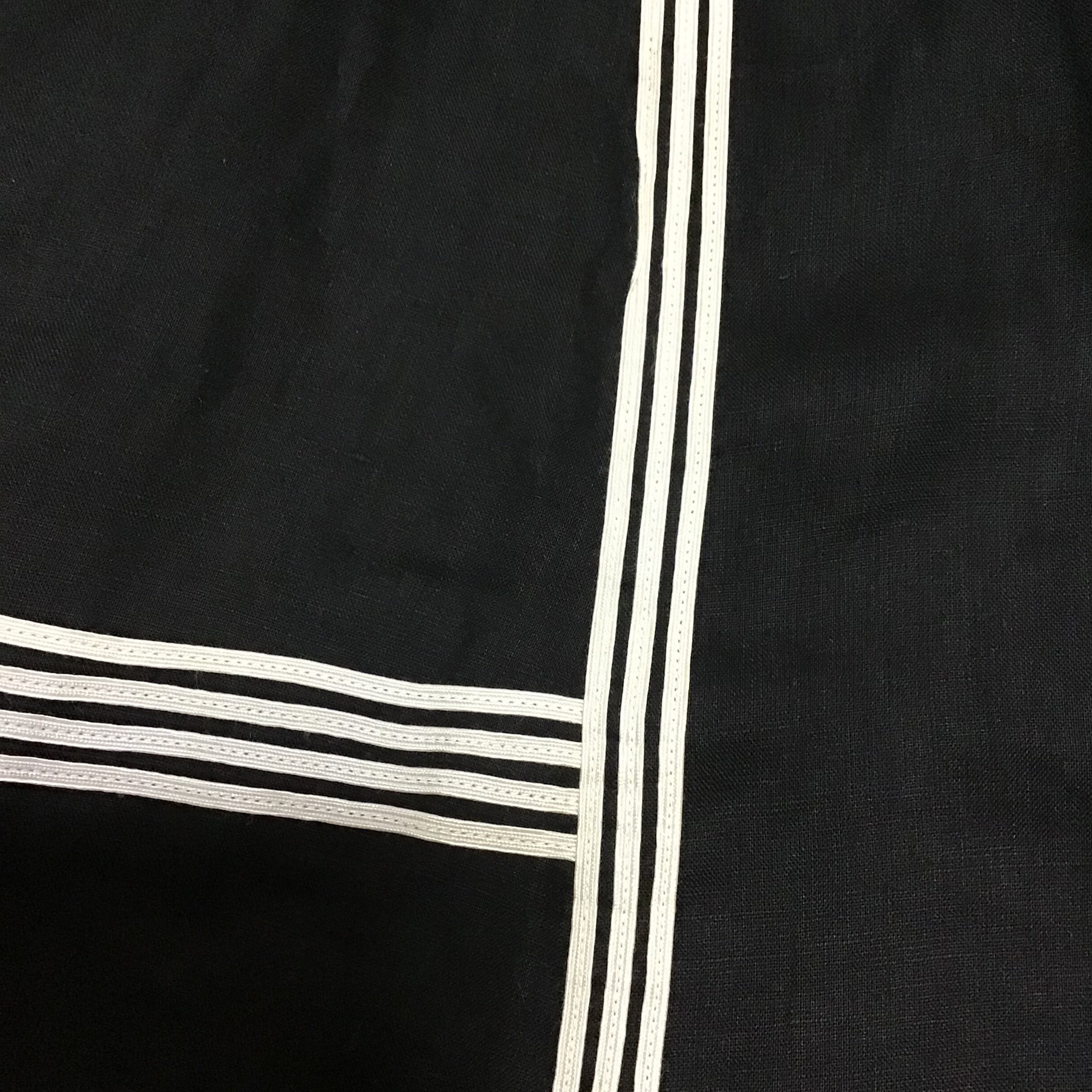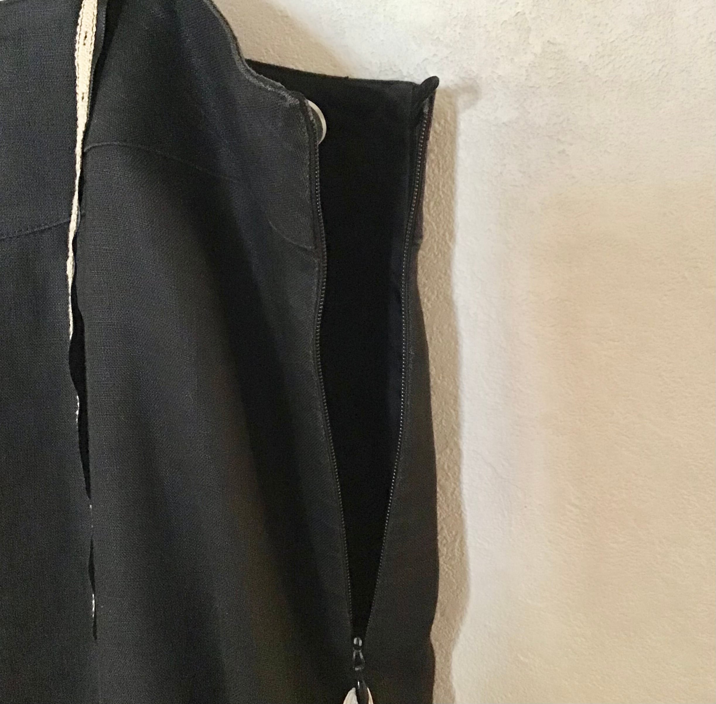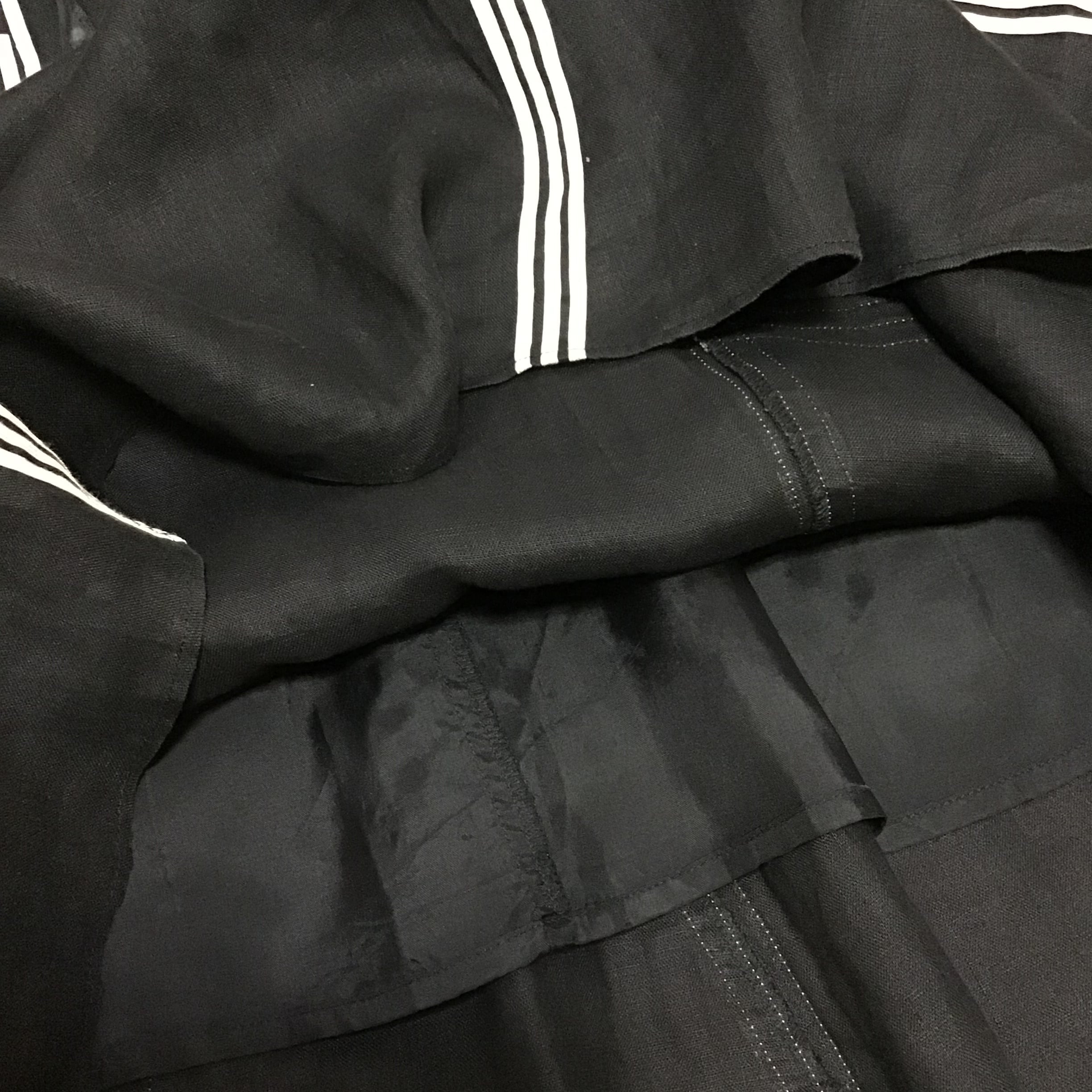 程よいフレアーの黒いリネンに白いテープが映えるナイスデザイン、ストラップは古いリネンのリボンと黒サテンのテープを重ねました◎フロントの輪っかに通して結ぶだけで簡単に長さ調整できます。下にデニムを合わせたり、Tシャツを合わせても可愛いです♡膝位までの裏地あり。