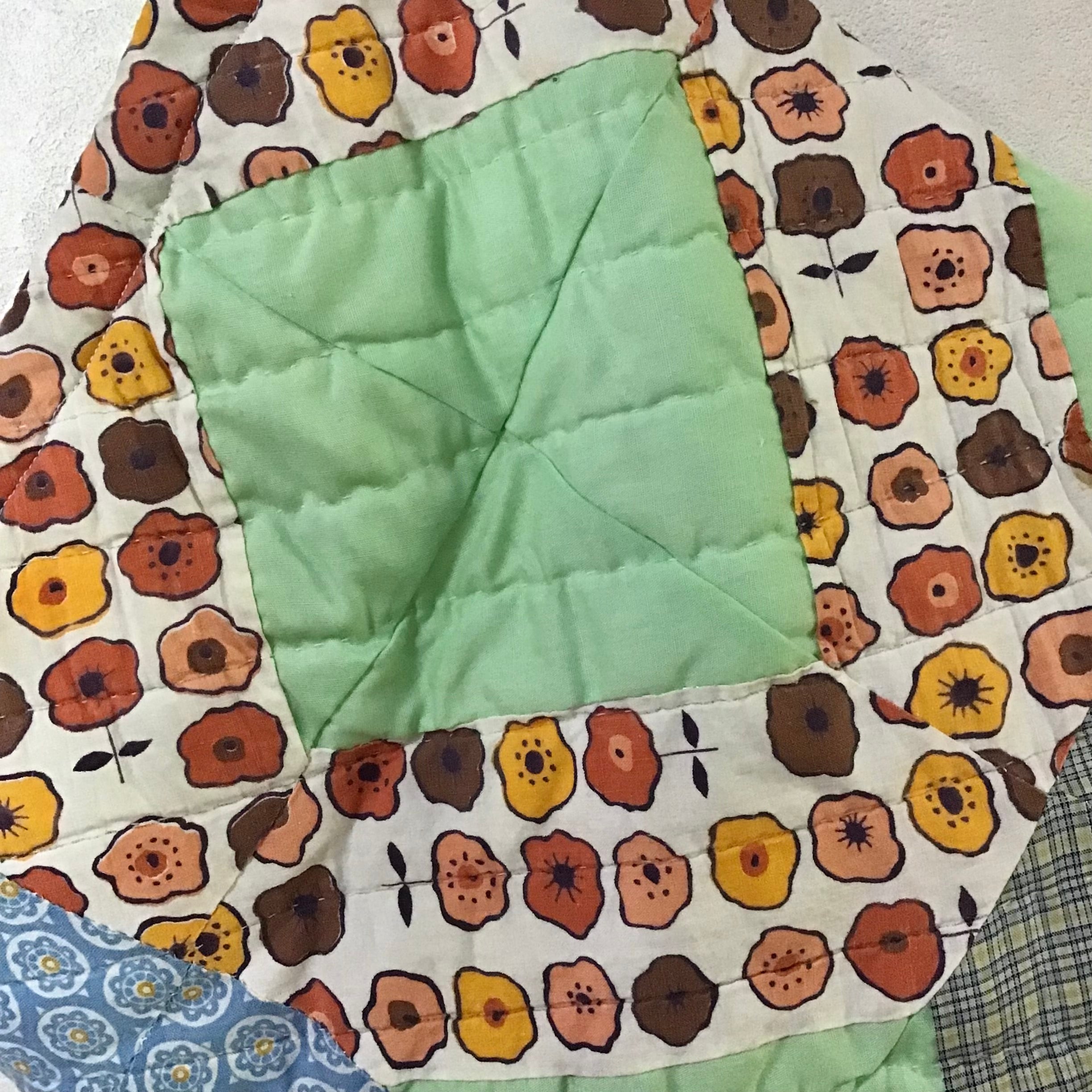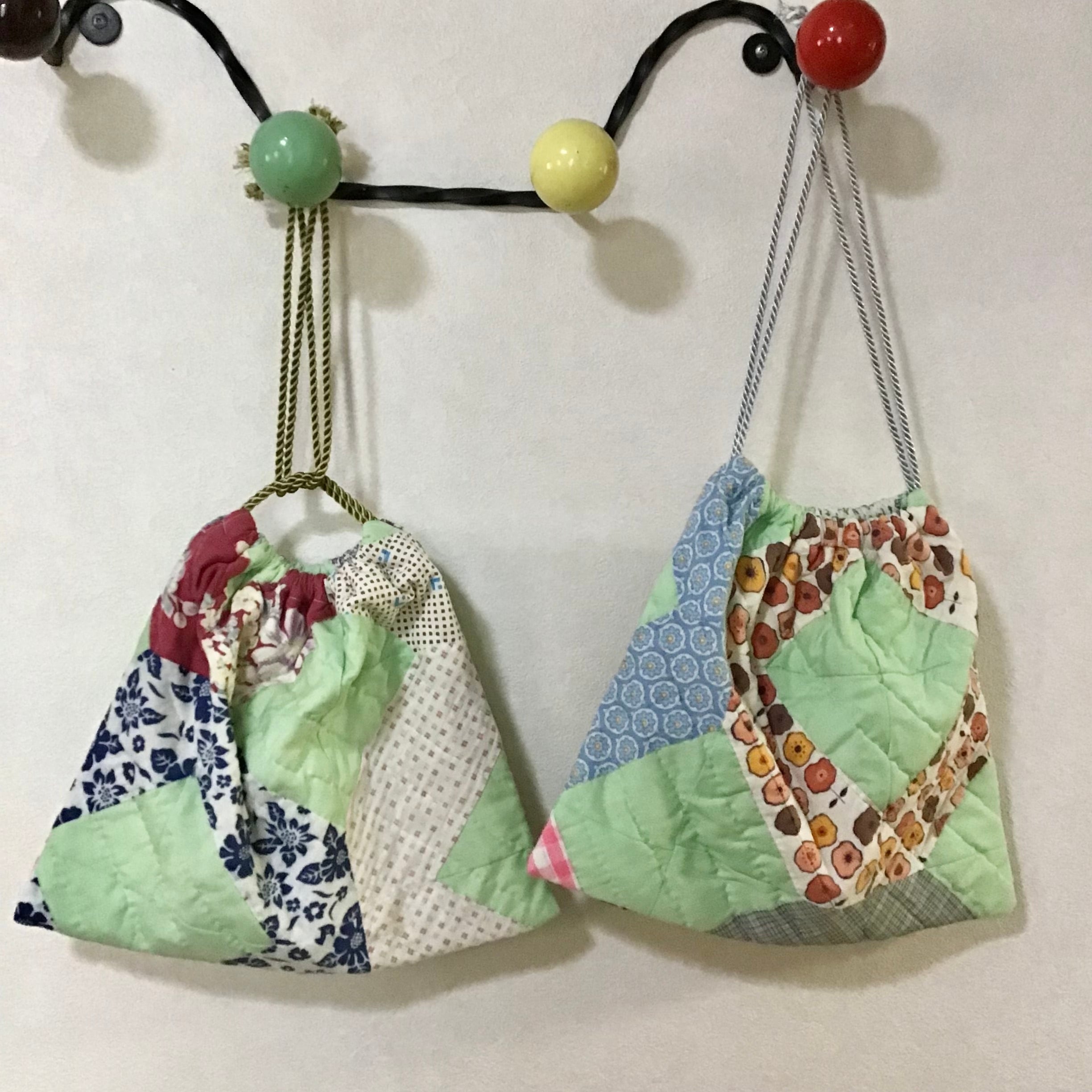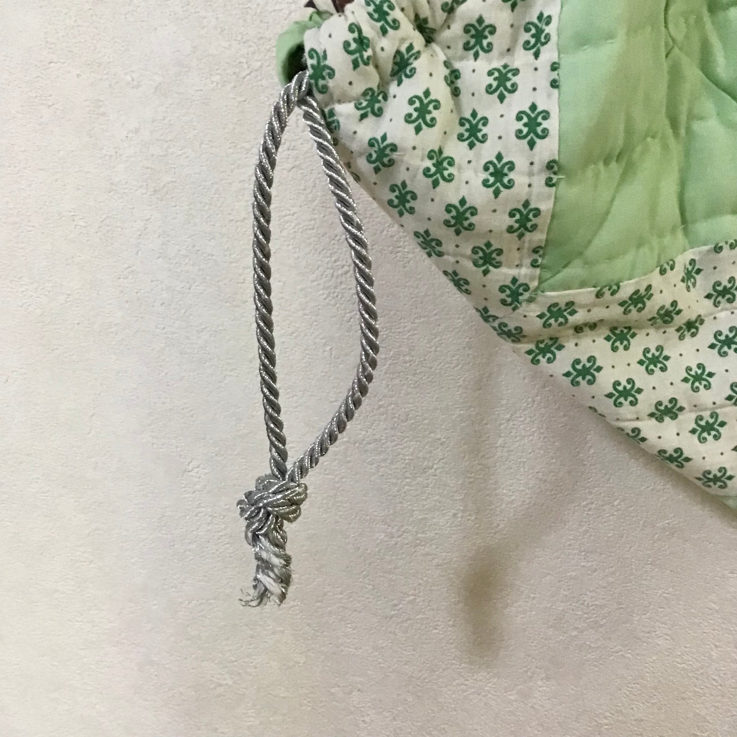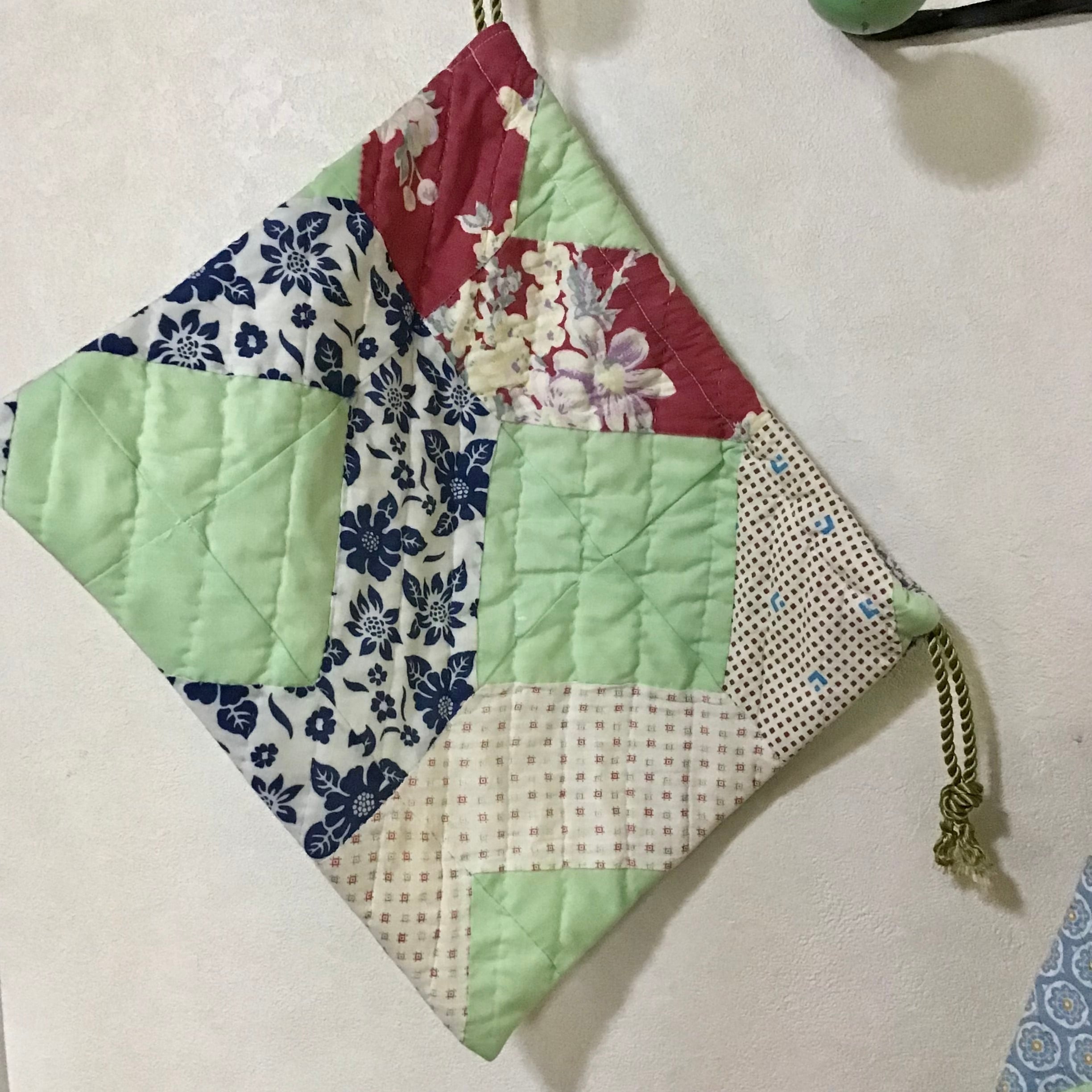 ヴィンテージキルトの巾着バッグ。裏表で柄も違って楽しいです◎ペットボトルや折りたたみの傘も入る使い勝手の良いサイズです◎バッグインバッグにしても可愛いです♡
