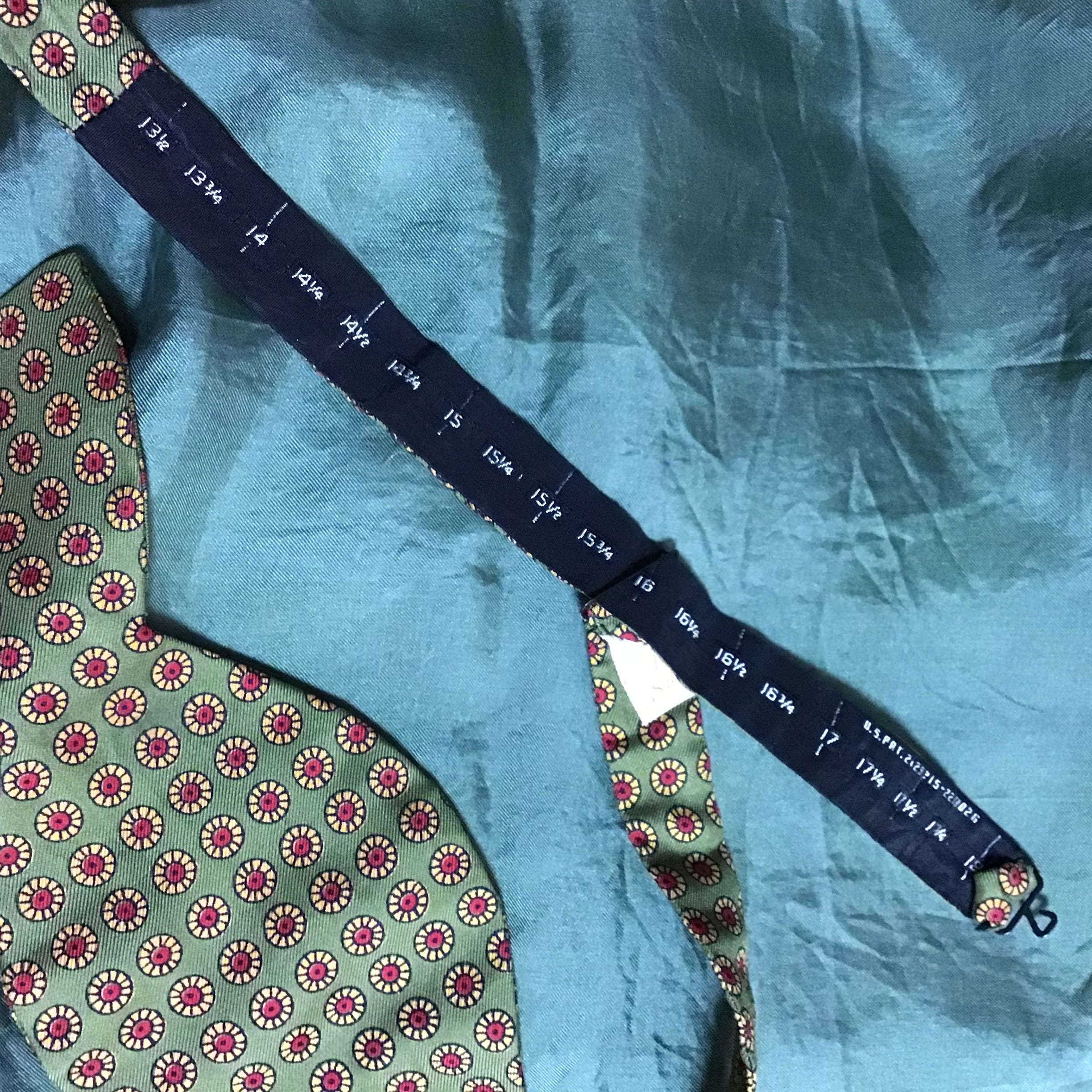 シルクのボウタイ。馴染みの良いカラーと柄、形の面白さもありネックレスと合わせて肩に掛けるだけでも良い感じです♡また、フックを引っ掛けるだけで簡単に長さも調節できるので、写真のようにブローチで留めてベルト代わりにしても可愛いです◎いつものスタイルにプラスしてオリジナルなコーディネートをお楽しみください♡