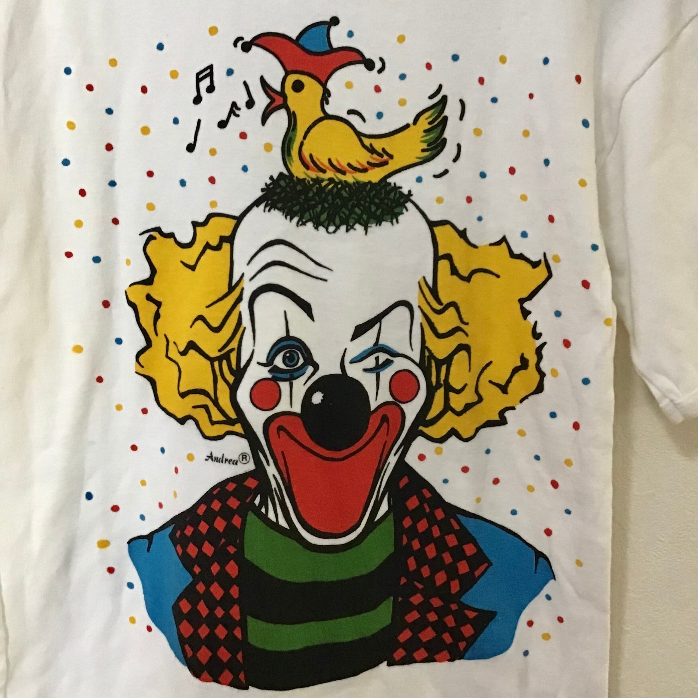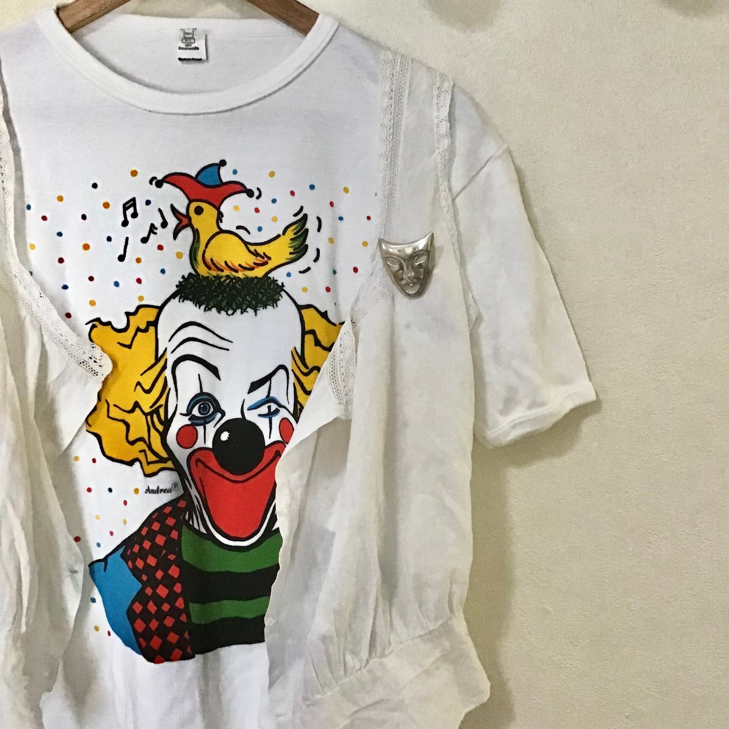 ユーロ物のピエロプリントTシャツ。ご陽気ピエロと頭にはアヒルのハッピーな絵柄、シルクプリントで雰囲気も良い感じです♡カラフルなヴィンテージスカートに合わせたり、白パンツを合わせてオールホワイトのコーディネートも可愛いと思います◎