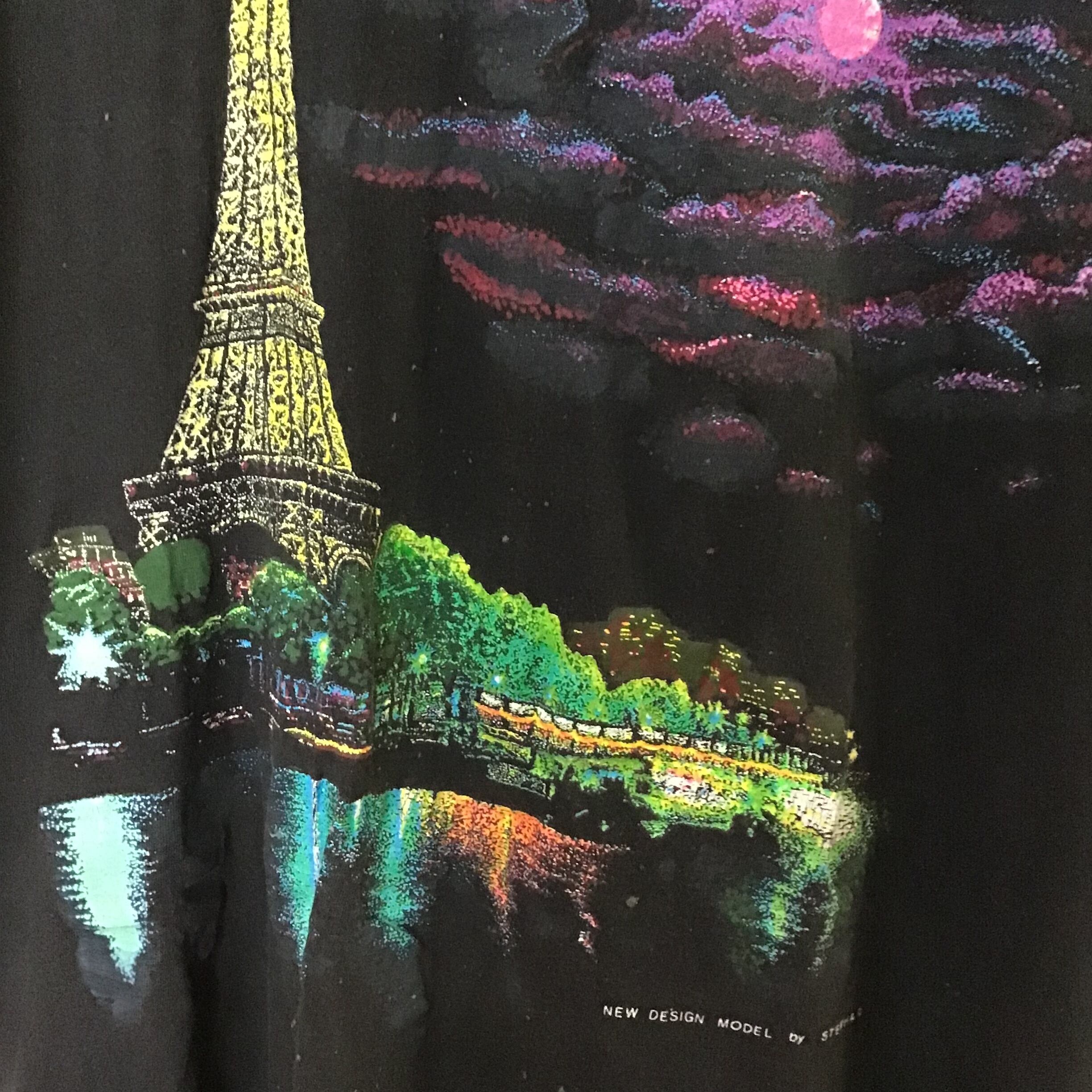 パリのプリントTシャツ。エッフェル塔や街の光が川面に映る風景が色鮮やかに描かれたとても良いプリントです♡フェードしたブラックと薄くなったボディもヴィンテージらしい良い雰囲気です◎お腹下に色抜けがあります。