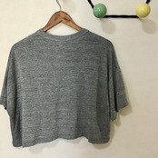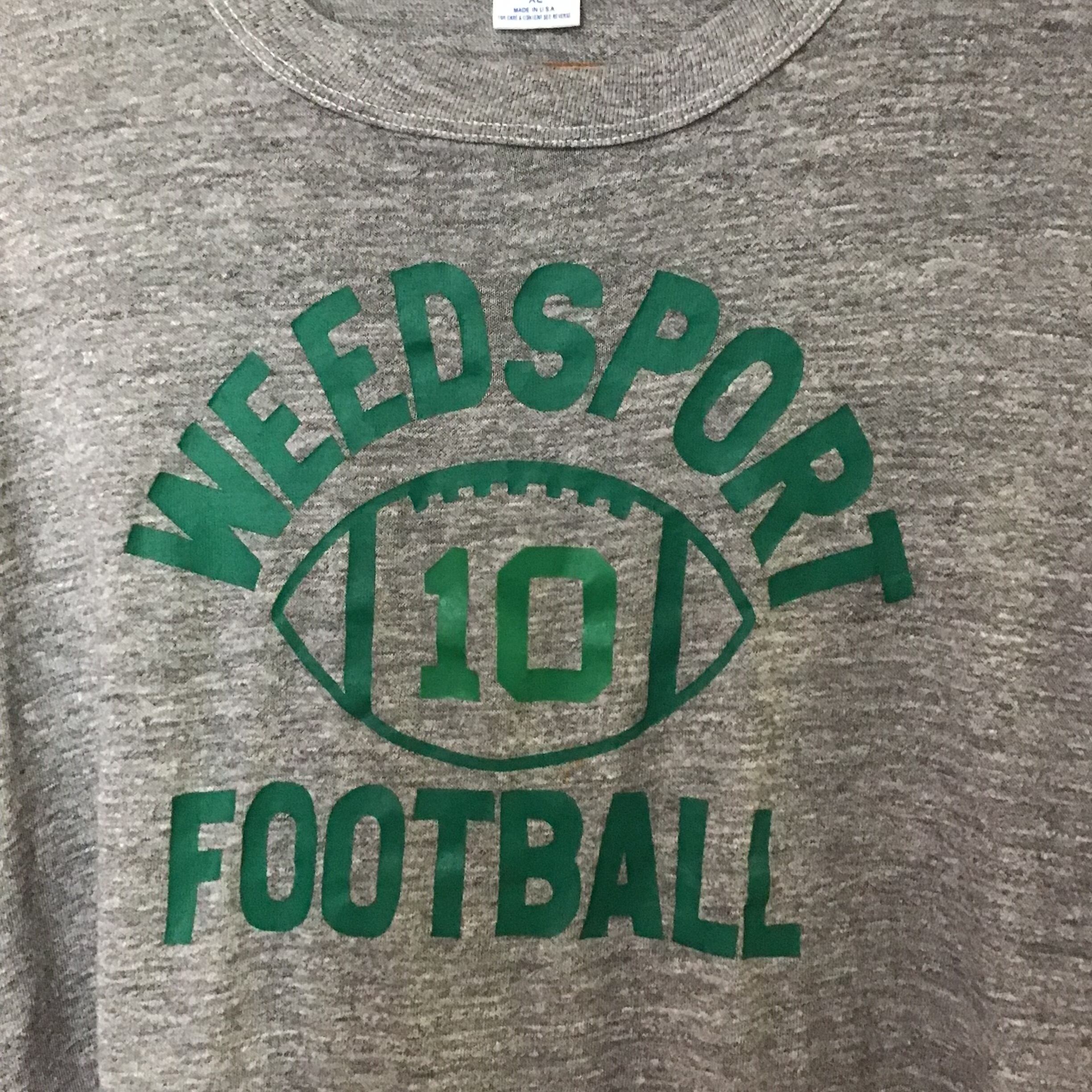 USA製ラッセルのショート丈Tシャツ。杢グレーとグリーンのフットボールプリントが可愛いです♡ショート丈を活かして、ハイウエストのパンツやスカートに合わせて◎