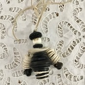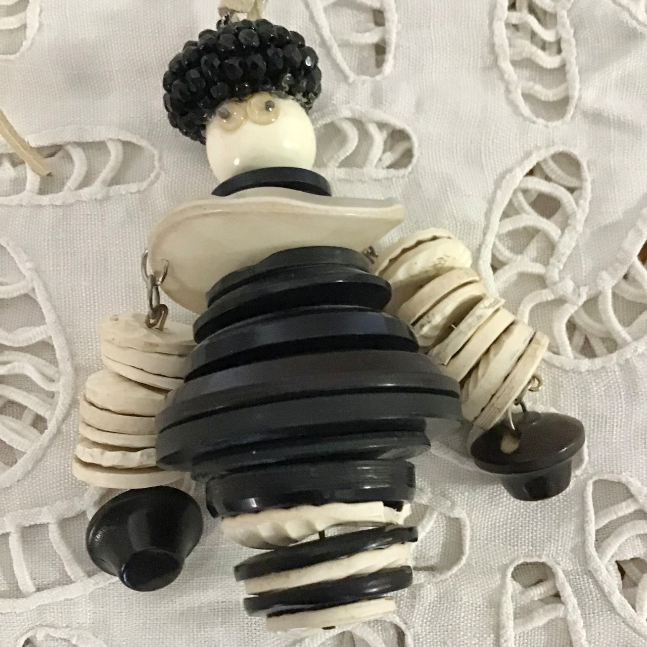 古いプラスチックとボタンで作られたドールネックレス。モコモコした頭につぶらな瞳、モノトーンなのが店主お気に入りポイント♡Tシャツからニットまで、幅広く合わせていただける素敵なお品です◎革紐でお好みの長さで使用できます。