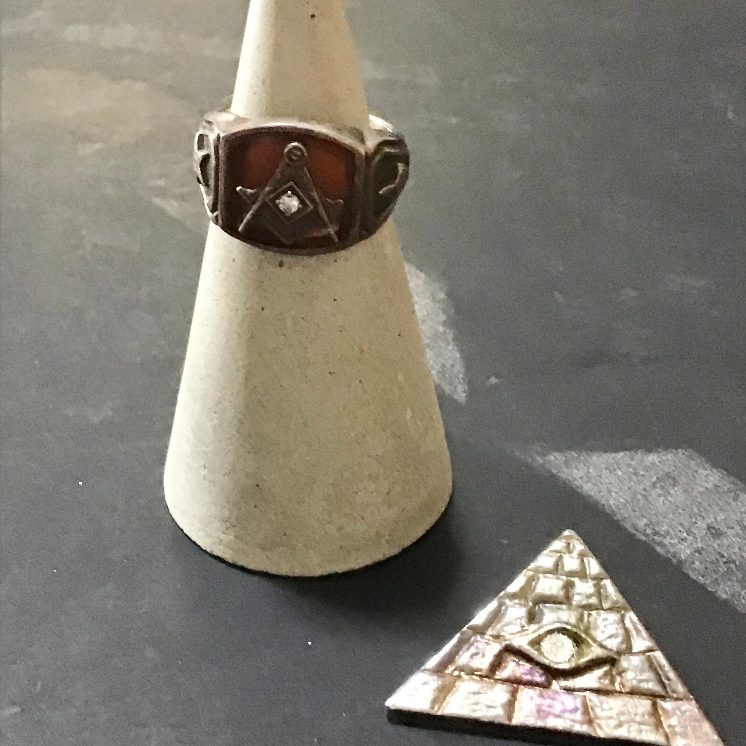 合金製、フリーメイソンのチャーム。中央のラインストーンがポイントになり、シンボリックでわかる人にはわかるデザイン◎お手持ちのチェーンや革紐などに合わせてお使いください♡経年により変色が見られますが良い雰囲気のお品です◎