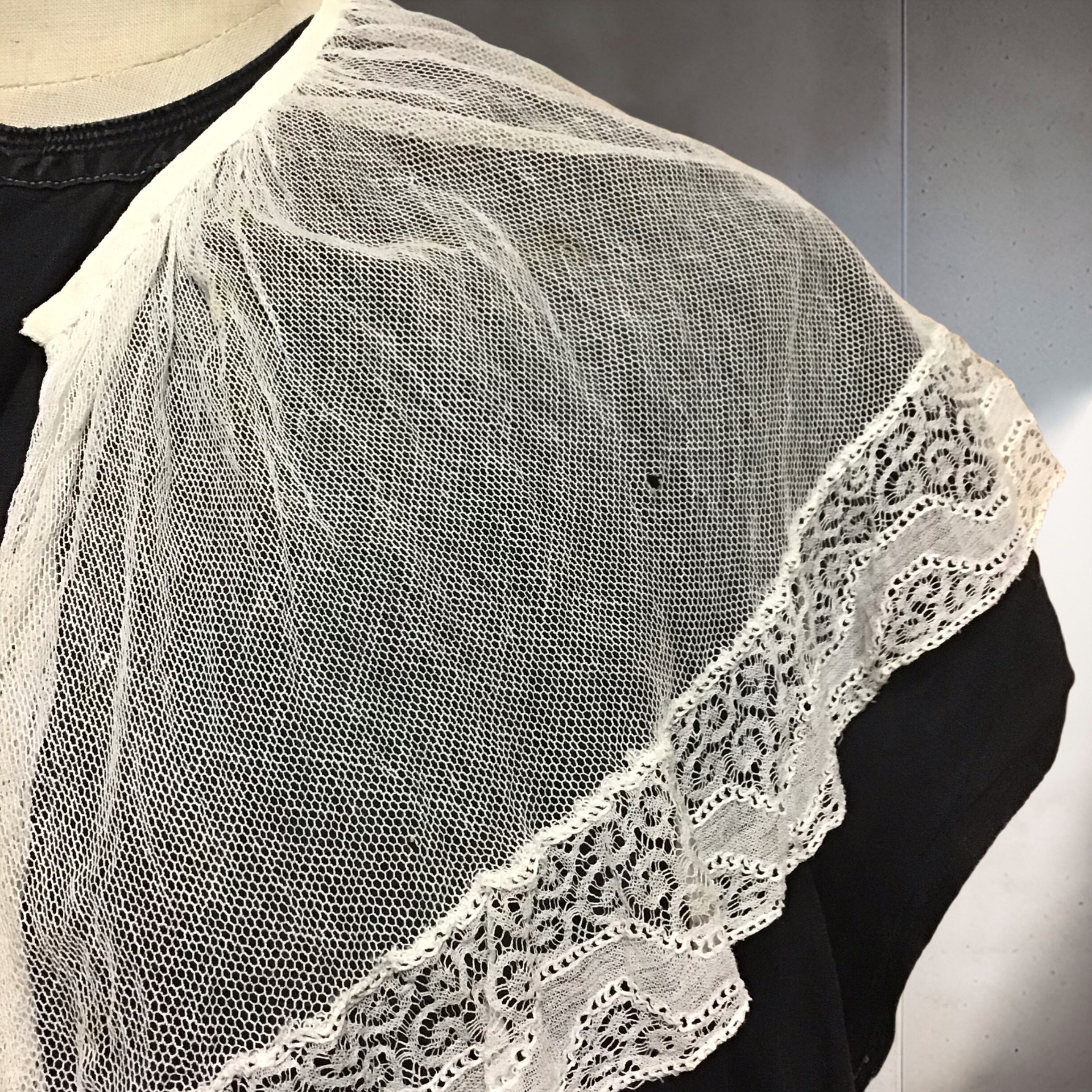 1930年代、アンティークチュールレースの付け襟です。ふんわりと大きめなデザイン、古いチュールの質感や縁取りされたレースの細工も繊細で、経年の傷みはありますがとても良い雰囲気です♡両端にリボンなどを付け、幅を活かしてエプロンやビスチェの様に使うのもおすすめです◎