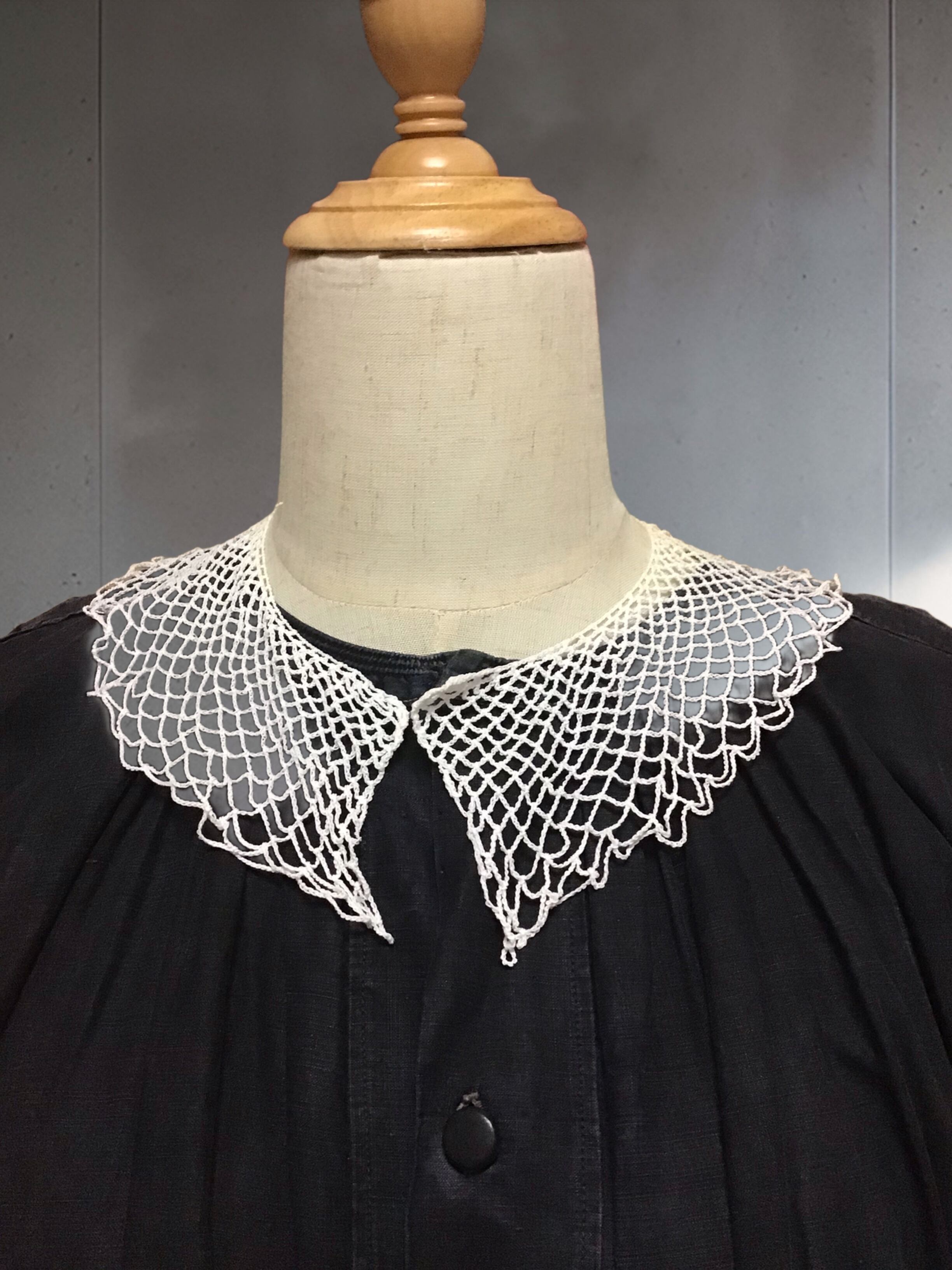 1930年代、アンティークのかぎ編みレースの付け襟です。シンプルなデザインですが、とても細かなかぎ編みが繊細で軽やかさもあり可愛いらしいお品です♡小ぶりでさりげなく合わせて頂けます◎首元に経年の黄ばみはありますが、着けるとそこまでは気にならないと思います。