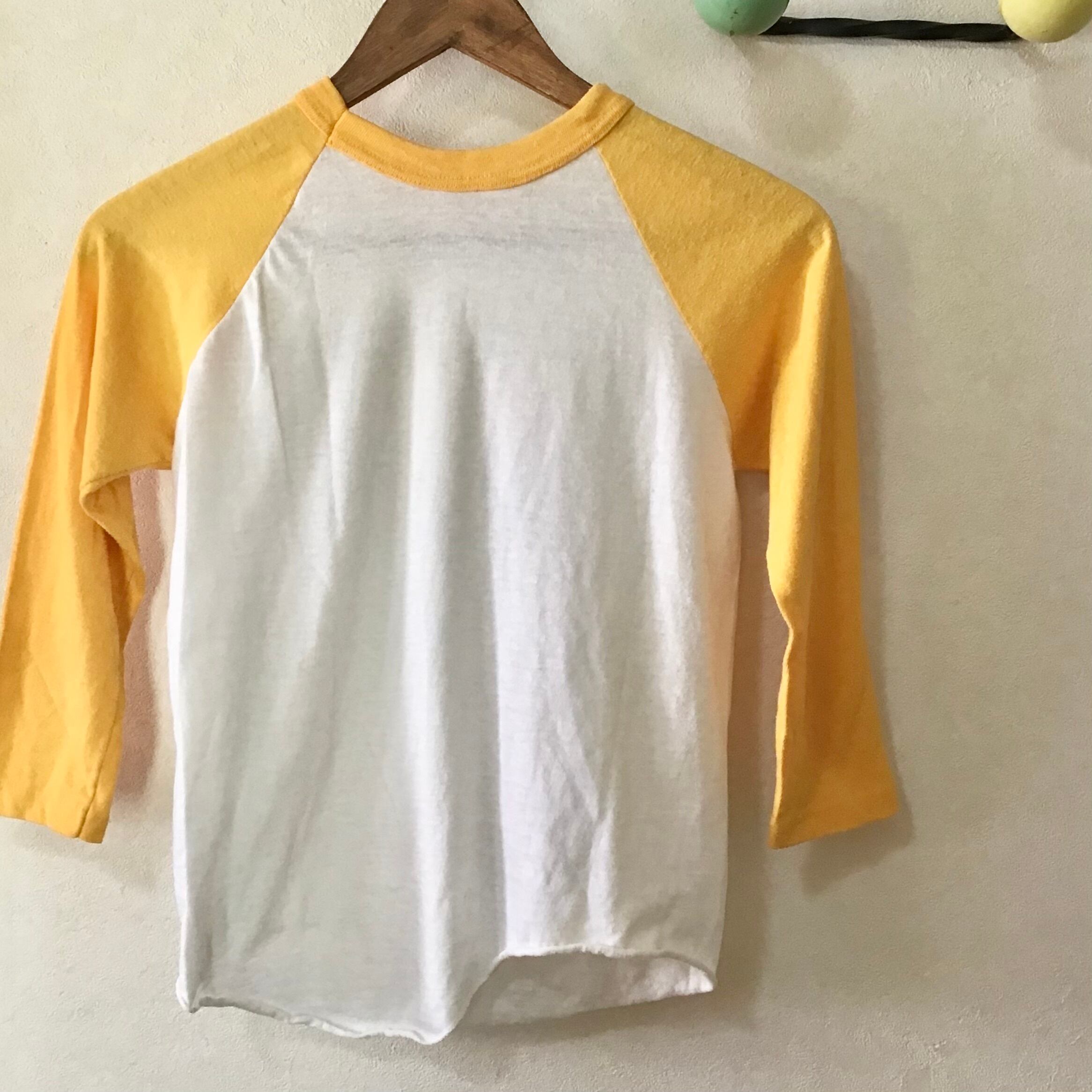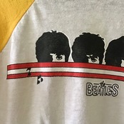 1980年代、ビートルズプリントのラグランTシャツ。メンバーがチラリと覗くデザインに、ヴィンテージらしい発色の良いイエローが良い雰囲気です♡経年によりボディにねじれが出ており裾はズレています。コンパクトなサイズでボリュームのあるボトムとの相性が良さそうです◎店主はビートルズの「Revolver」というアルバムが好きです♡