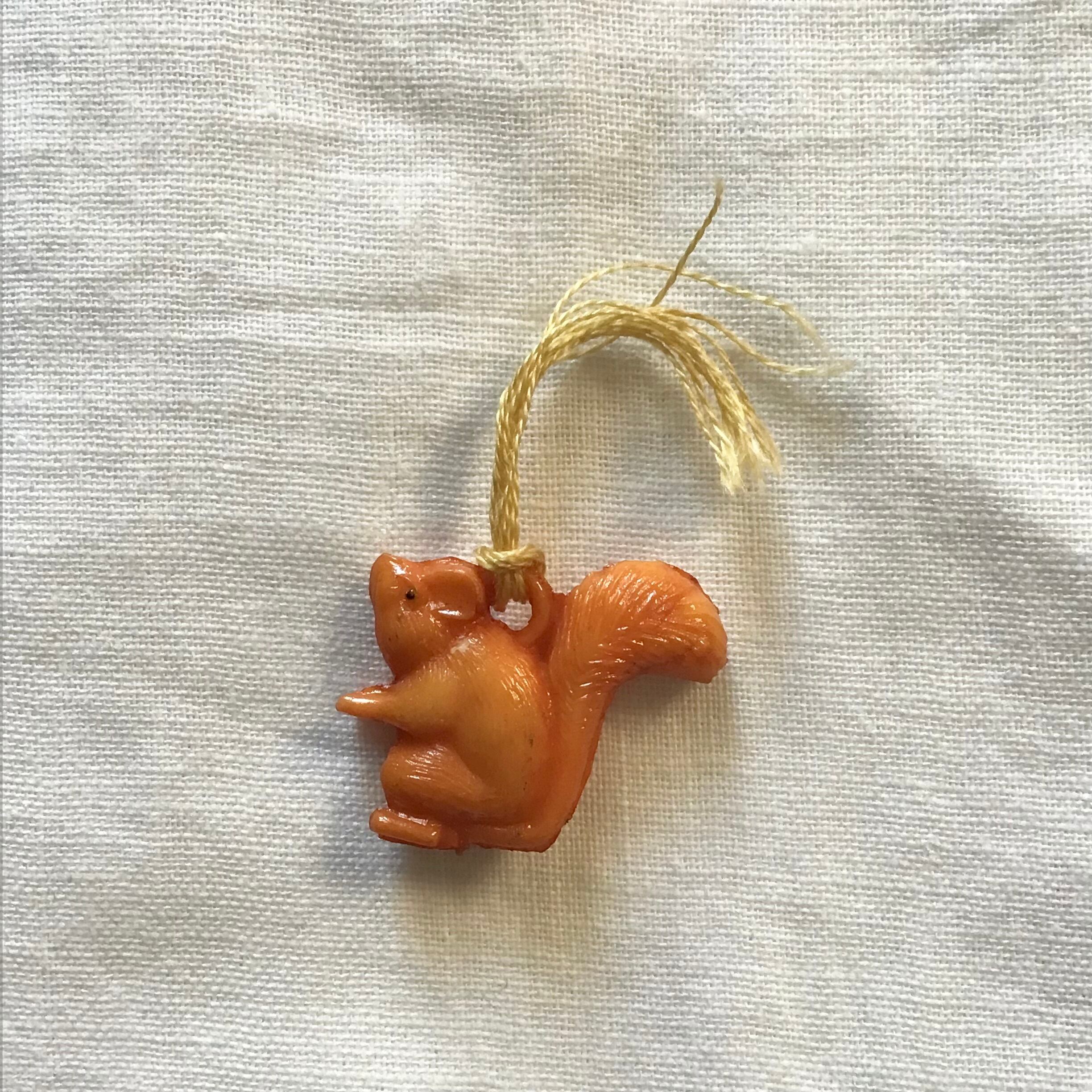 1950年代のガムボールのおまけチャーム、小さなリスです。当時の紐がそのまま付いており、ブローチやネックレスにしたり、襟の先やお気に入りのポーチに縫い付けても可愛いです♡ボールチェーンをお付けしますので必要に応じてお使いください◎