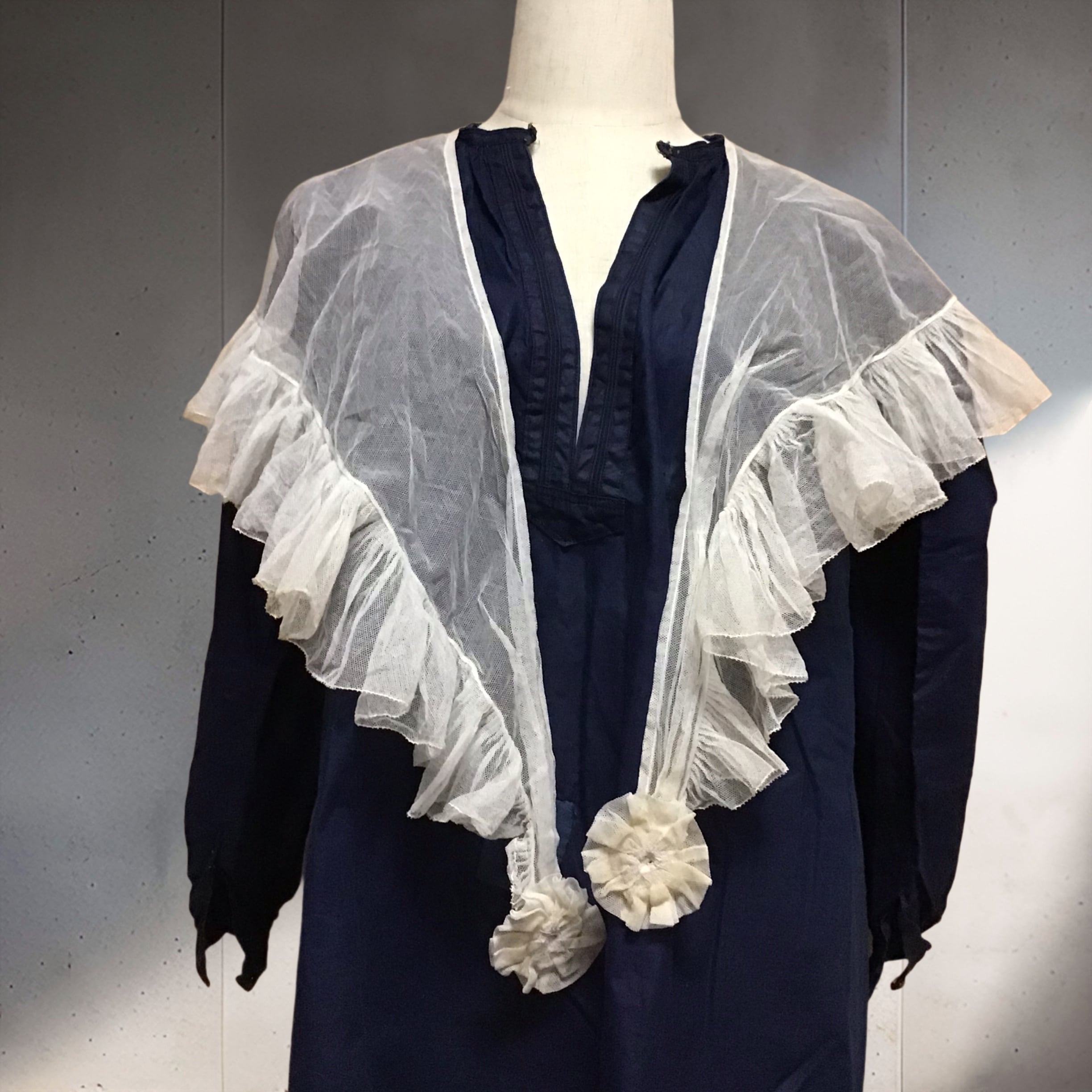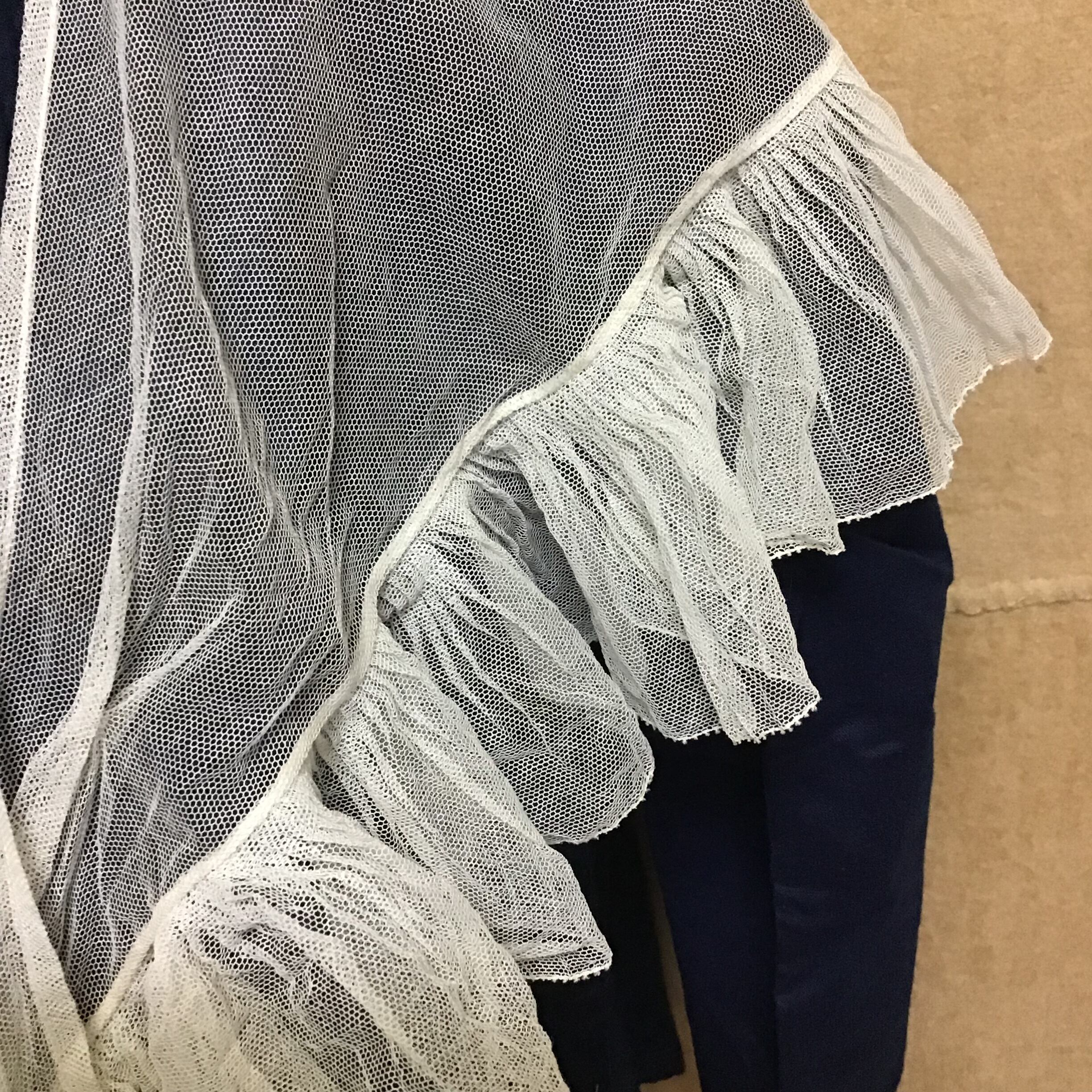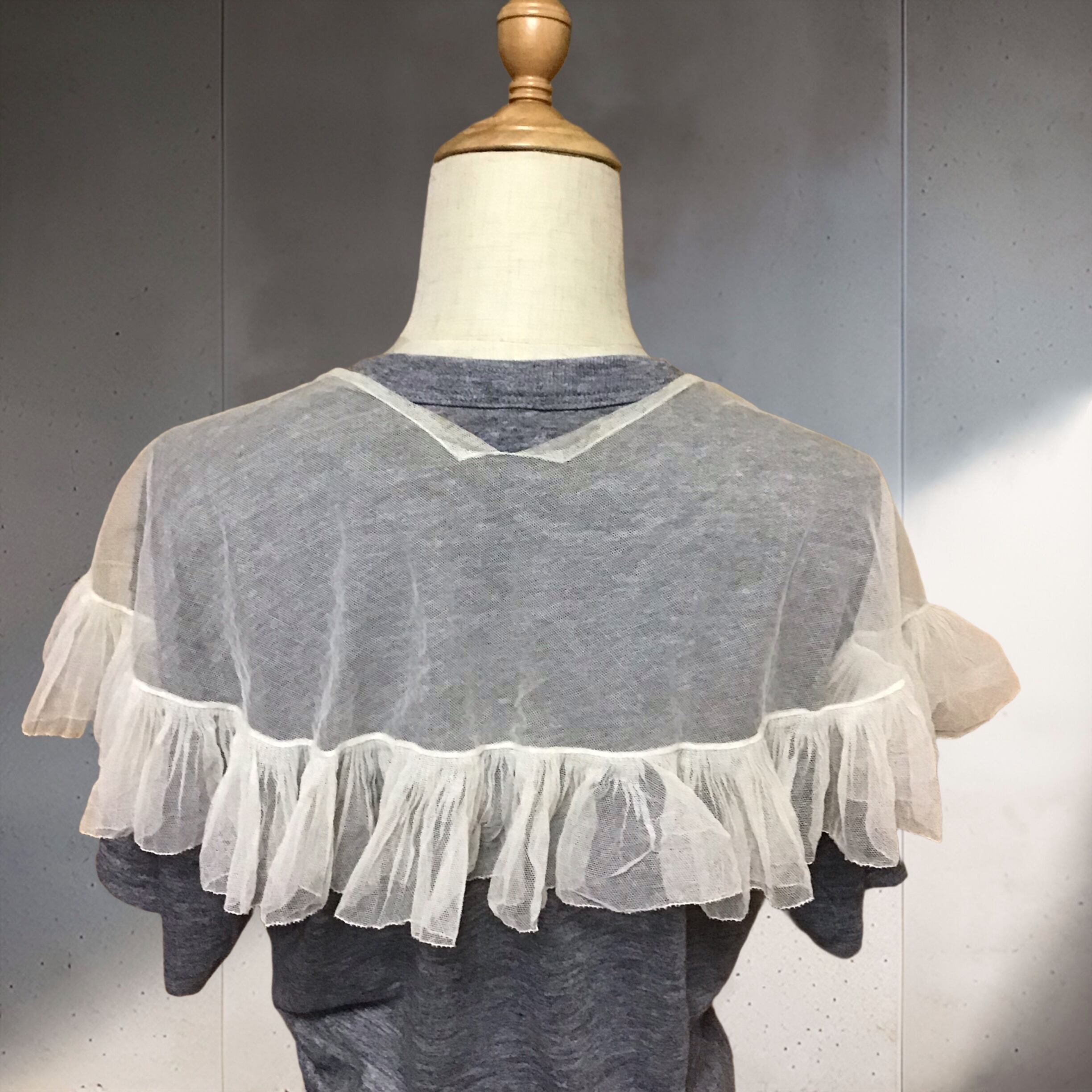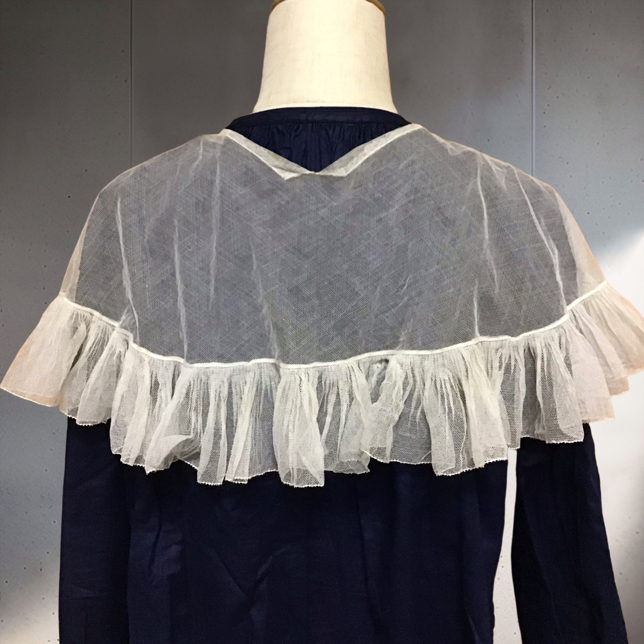 1920年代のアンティークチュールメッシュショール。オフホワイトのチュール素材、細かなギャザーや先についた花の様な飾りなど、どこを取っても素敵なアンティークです♡Tシャツからブラウス、ニットなどどんなアイテムに合わせて頂いても本当に様になる店主もお気に入りのお品です◎目立ったダメージも無く、良いコンディションでおすすめです◎