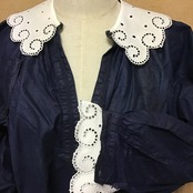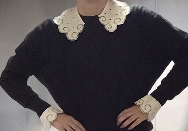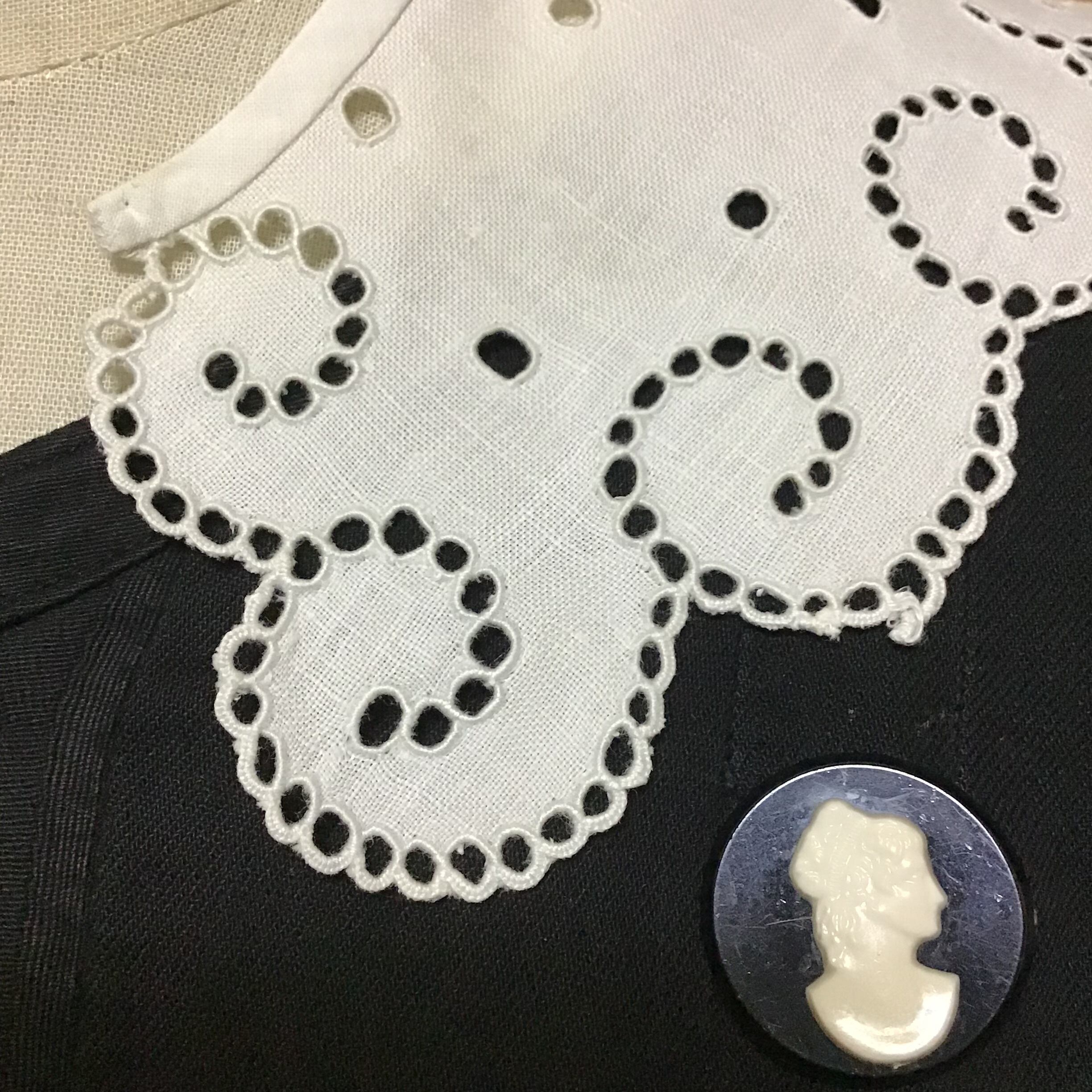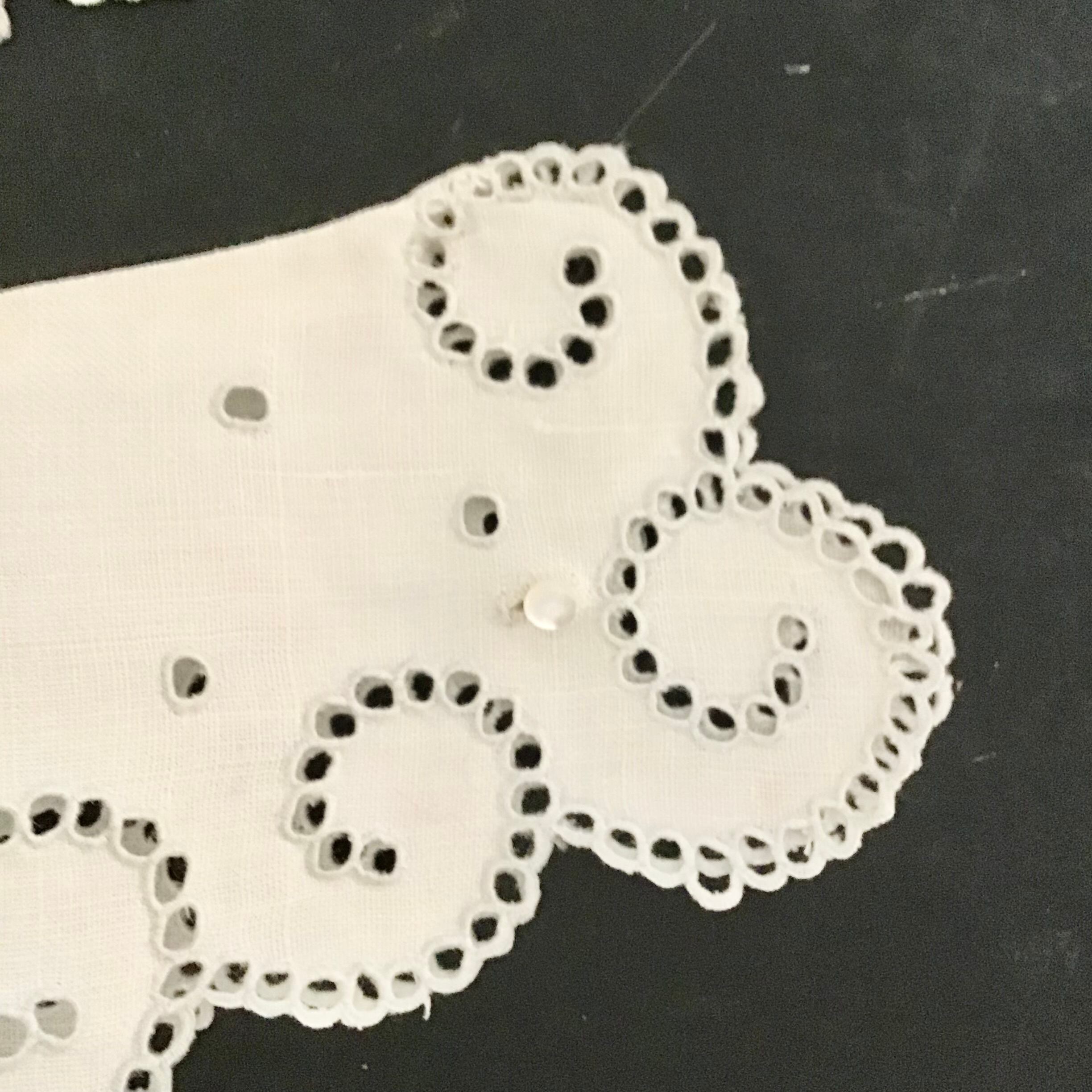 1950年代のコットンアイレットレースの付け襟とカフスのセット。くるくるとしたデザインがとても可愛いらしく、張りのあるコットン素材が良い雰囲気です♡カフスはスナップボタンと小さなボタンの両方で留められるので外れる心配は無いと思います◎何に合わせも可愛いので、コーディネートを考えるのも楽しめました♡
