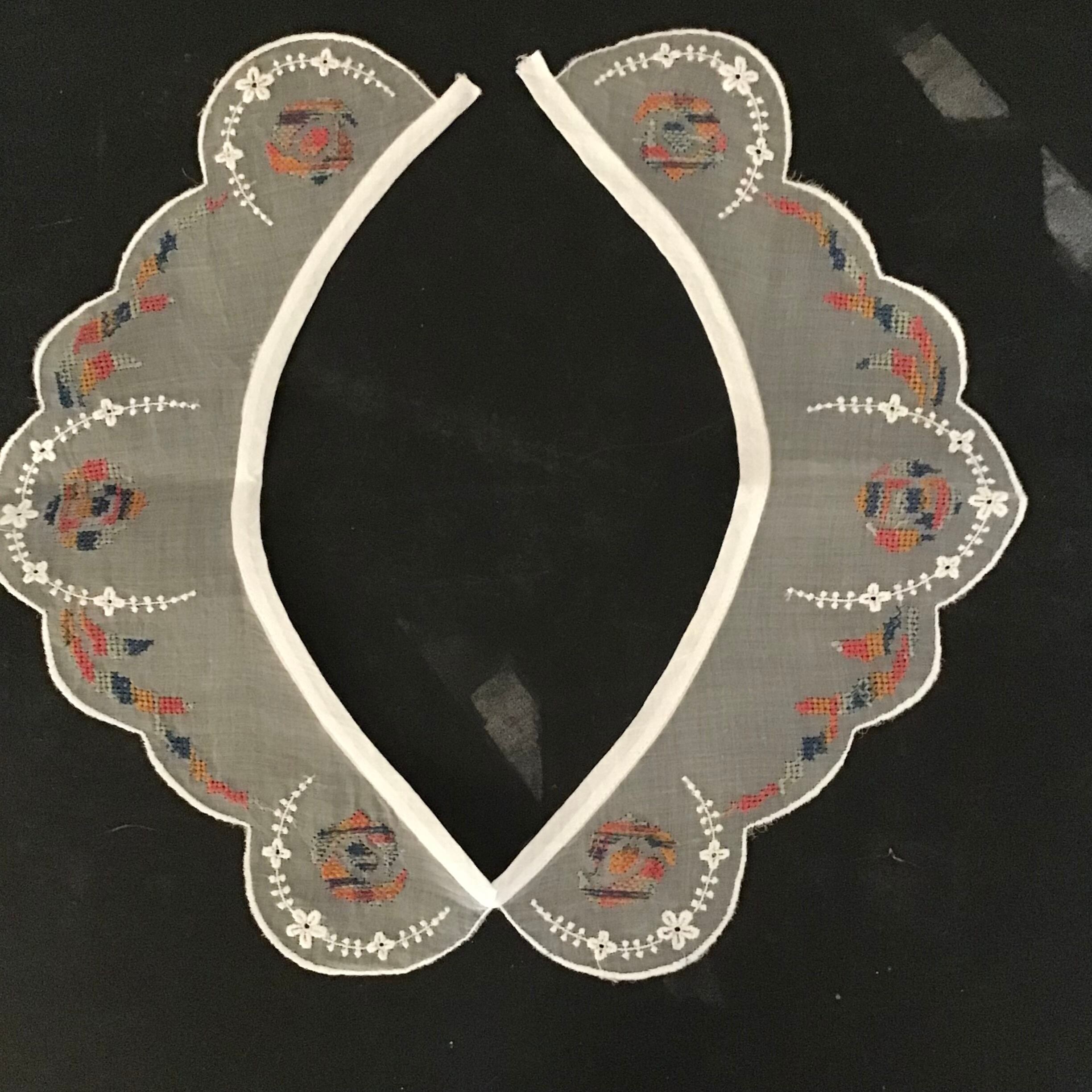 1950年代、コットンシアーボイル素材の付け襟です。細かなニードルポイント刺繍がポイントになり、スカラップのデザインと透け感がある素材が可憐で爽やかな印象です♡軽やかにTシャツやブラウスはもちろん、ざっくりニットに合わせて素材のコントラストを楽しんで頂けるコーディネートもおすすめです◎