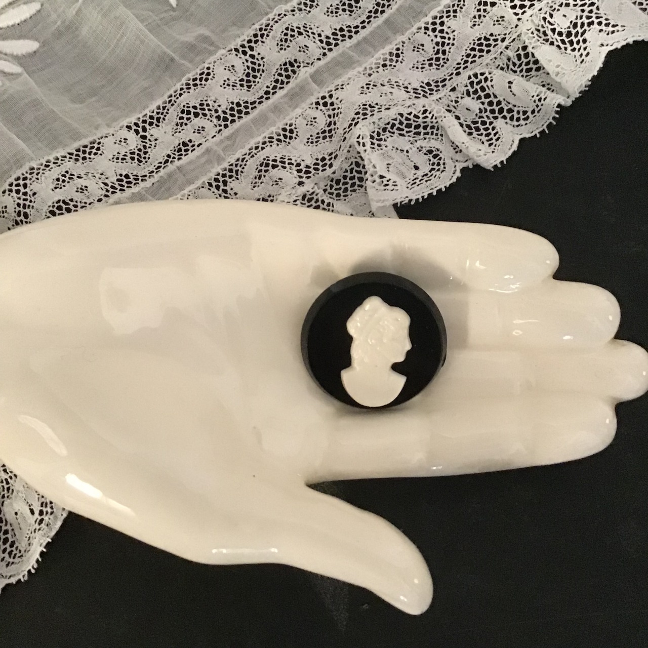 1940年代のルーサイトブローチ。小ぶりなカメオがとても可愛いらしく、カメオ好きの店主は一目惚れしました♡シンプルに襟元を飾るのも良いですし、あえて缶バッジと合わせてジャンクな雰囲気で楽しんで頂くのもおすすめです◎