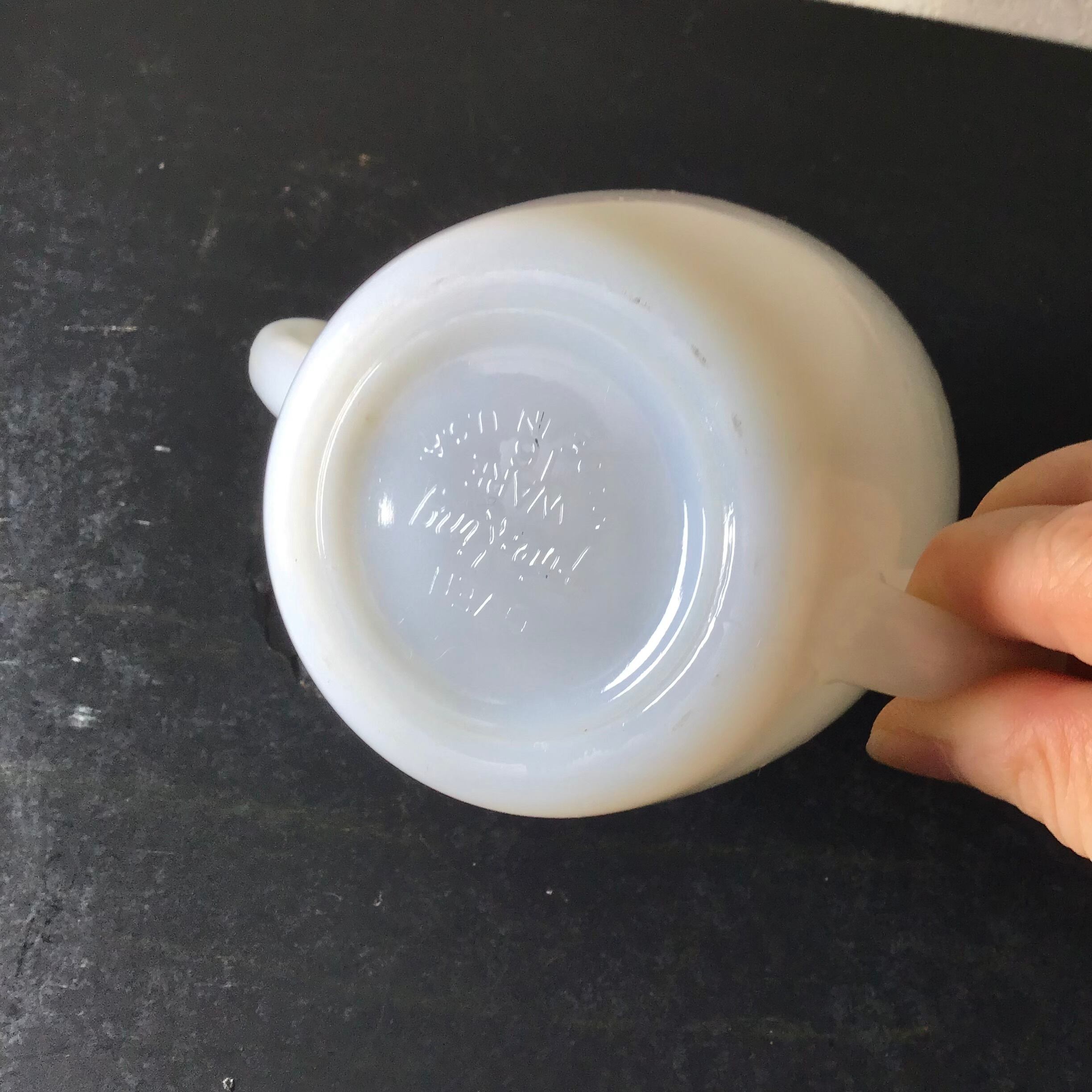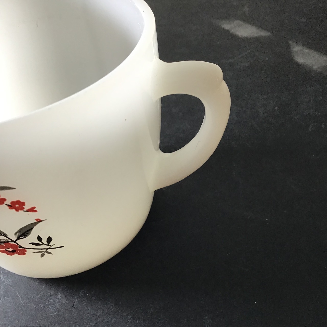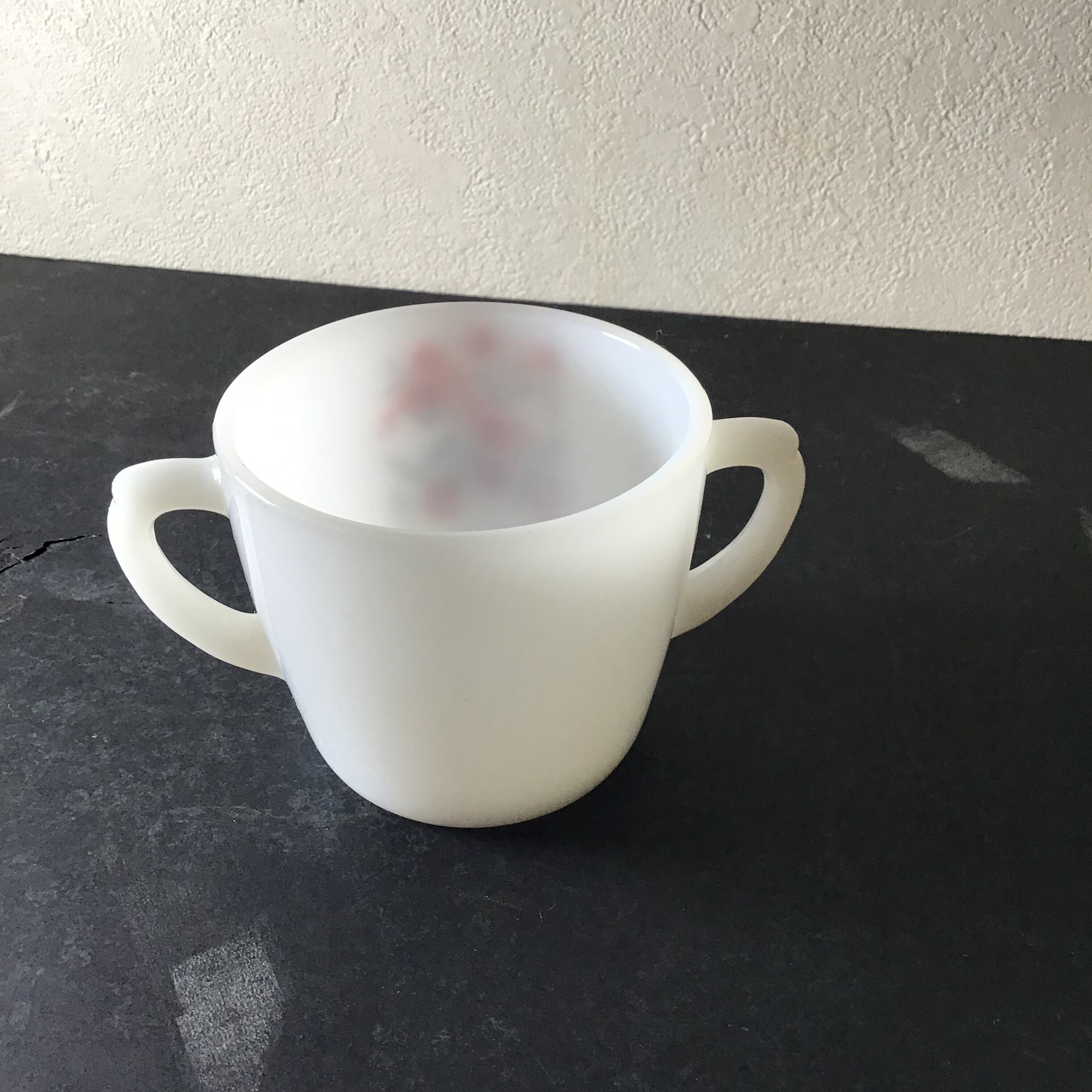 1950年代のファイヤーキング。ピンクと赤の花が可憐で可愛らしいデザインです◎シュガーポットですが小ぶりなマグカップとして使ったり、ブラシなどのメイク道具を入れても気分が上がりそうです♡プリントの剥げ、傷や欠けもないグッドコンディションです◎