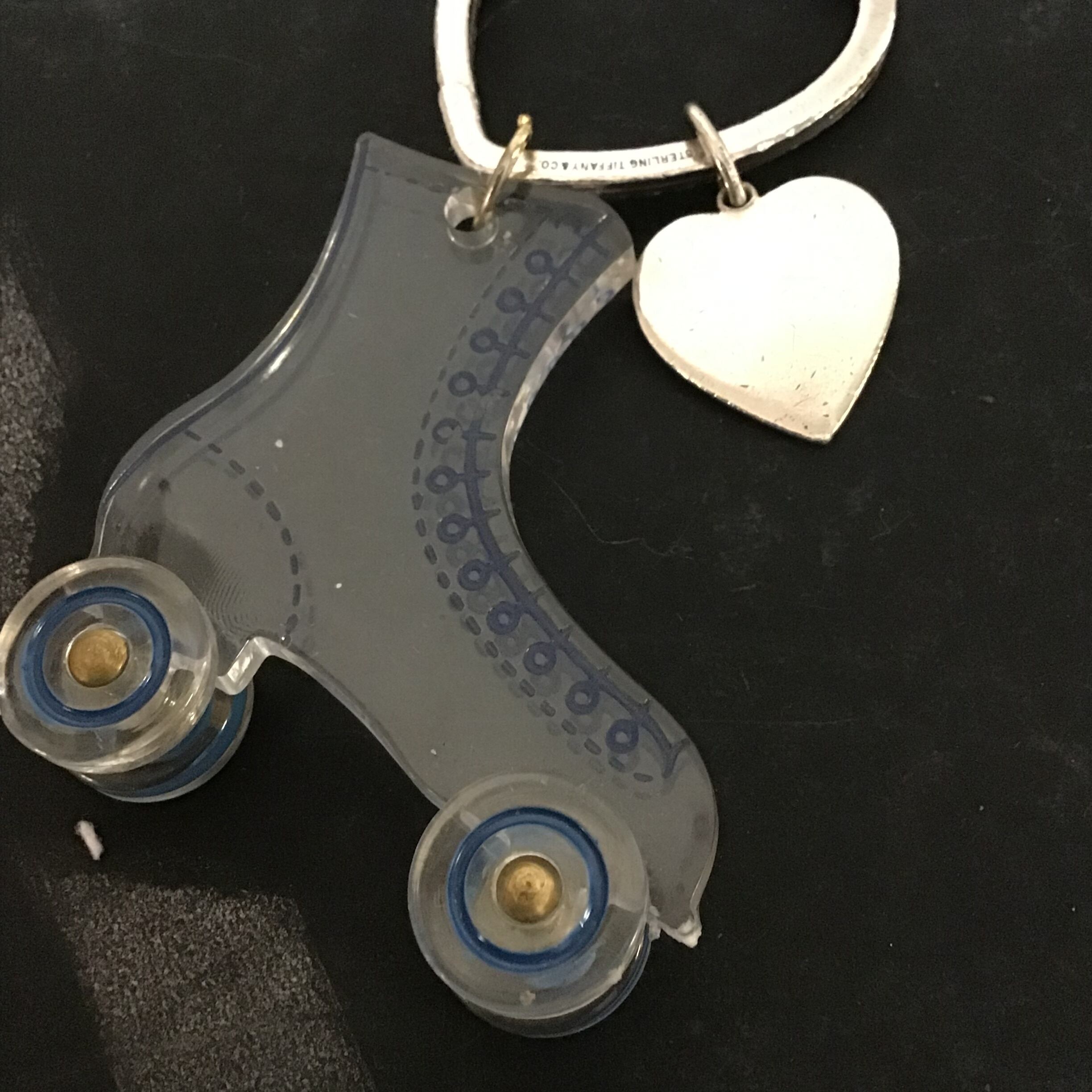 ティファニーのハートシルバーキーリング。ユニークなプラスチックのローラースケートがセットになっています♡ハートのプレートにはイニシャルの刻印が入っています。バッグに付けたり、さらにチャームを足しても楽しいです♡