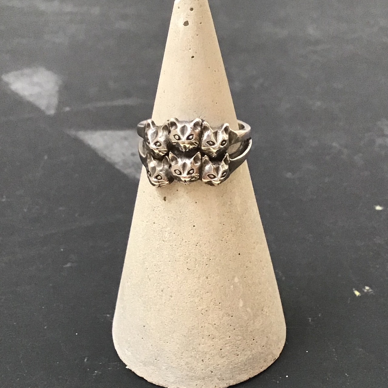 6匹の仔猫が並んだシルバーリング。ニャーニャーと鳴き声が聞こえてきそうな可愛さ♡あまり見かけないデザインで、軽く指にも馴染みやすい毎日つけたくなるリングです◎猫好きさんのギフトにもおすすめです!ランダムで猫のポストカードお贈りします♡