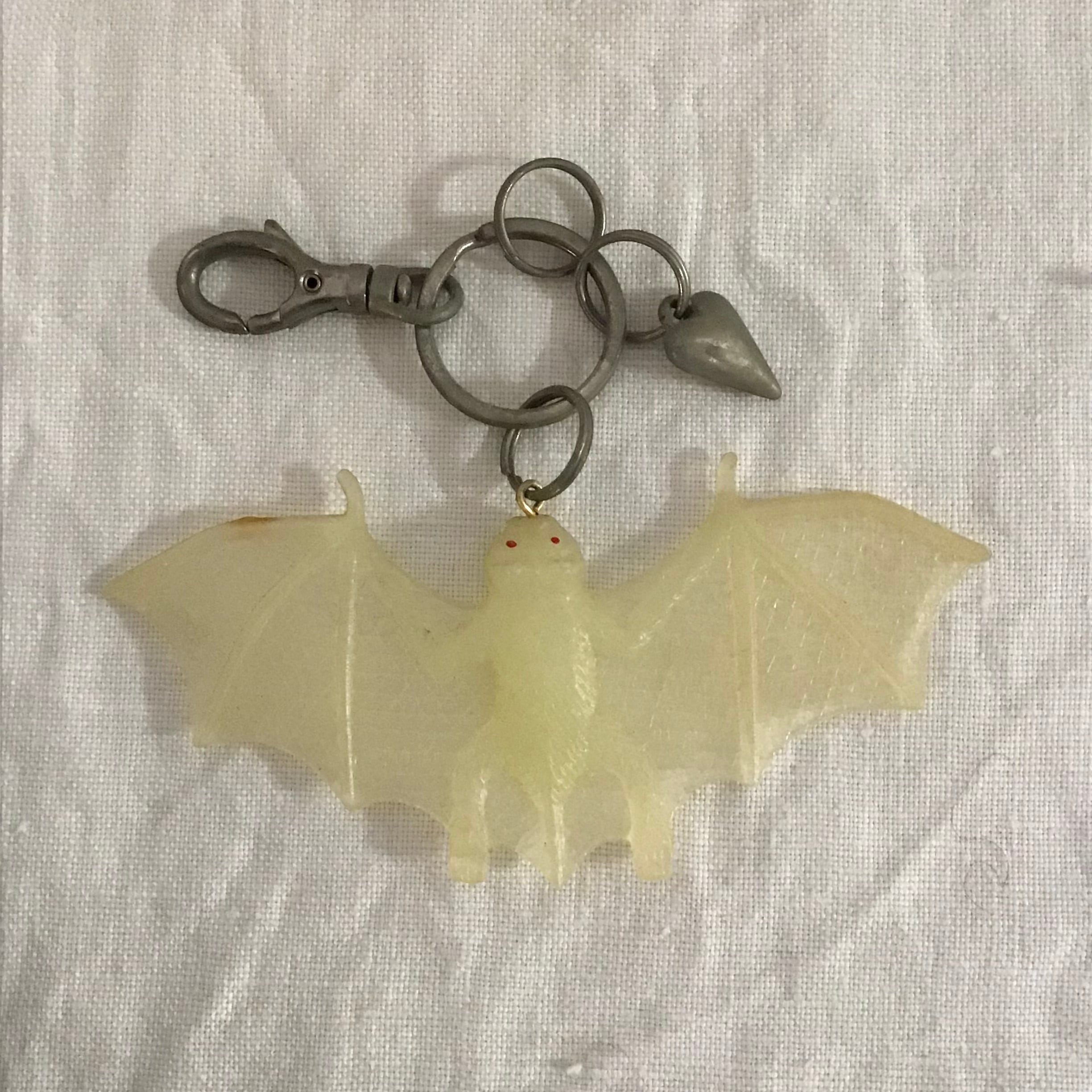 コウモリのキーリング。蓄光素材なので暗闇でうっすら光ります♡ヴィンテージらしいユニークなキーリングで、お気に入りのバッグを自分らしくカスタムしてみてはいかがでしょうか◎金属部分に経年のくすみはありますが、全体的に良い雰囲気です!