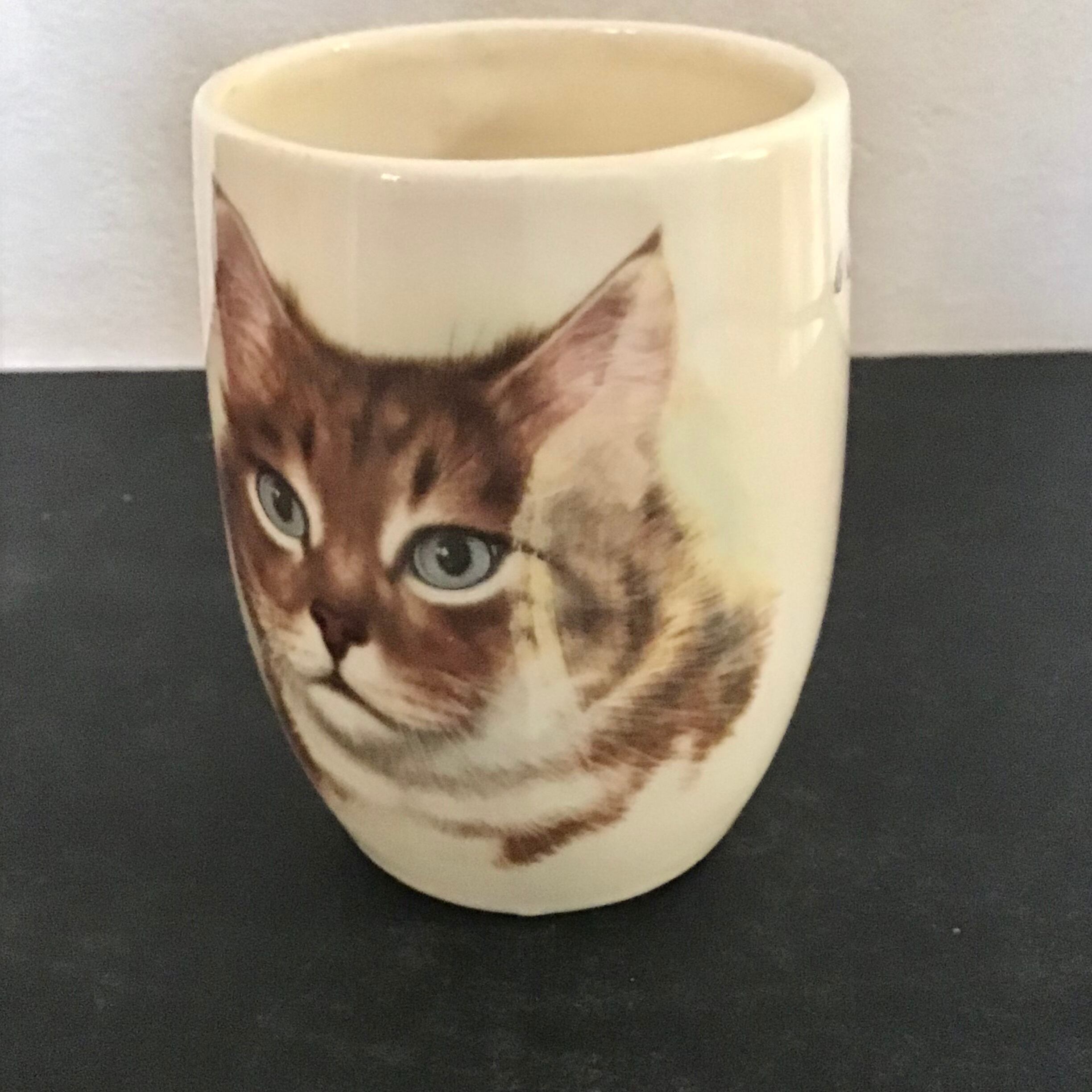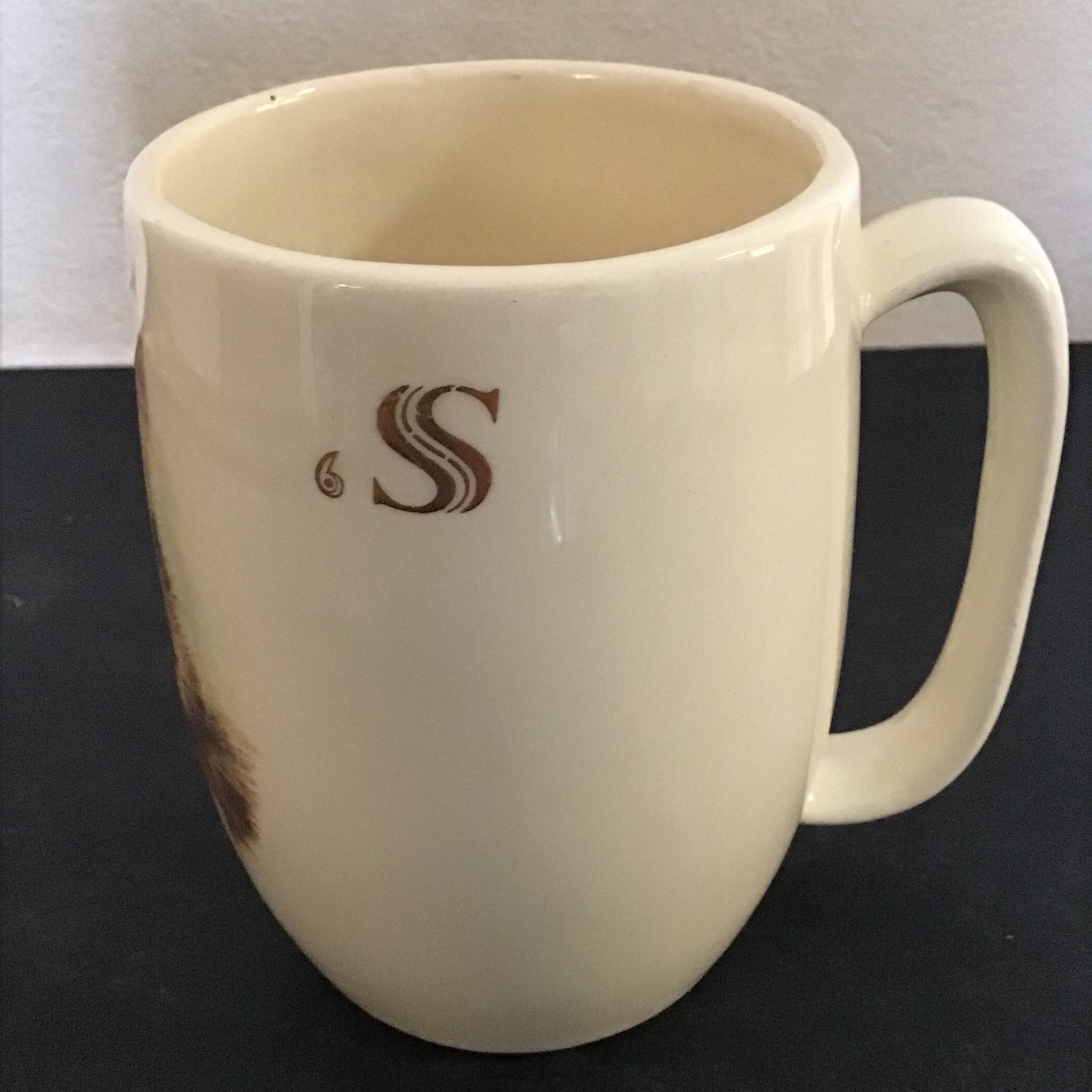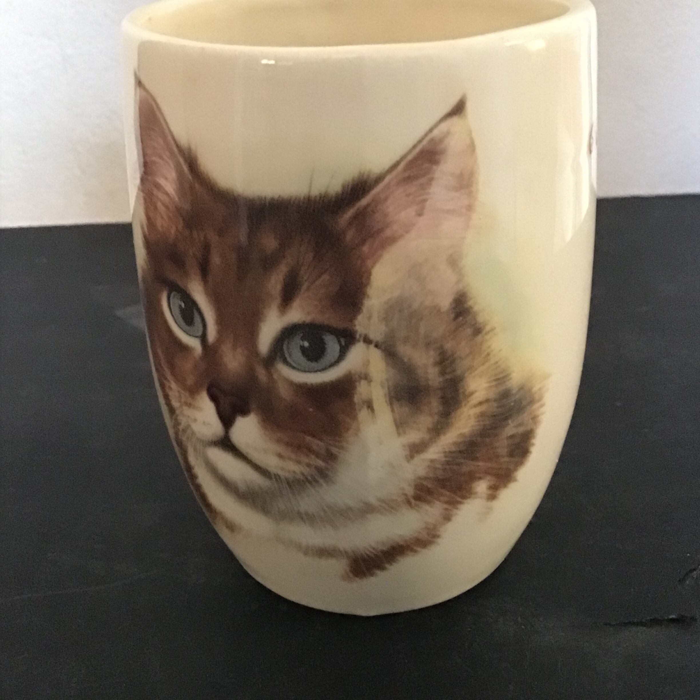 猫柄のマグカップ。とても良いタッチの猫ちゃんと”S”のイニシャルがプリントされています♡プリントに剥げがありますが、中もきれいでマグカップとして使って頂けるかと思います。もちろんペン立てなどとしてインテリアにもおすすめです◎ ランダムで猫のポストカードお贈りします♡