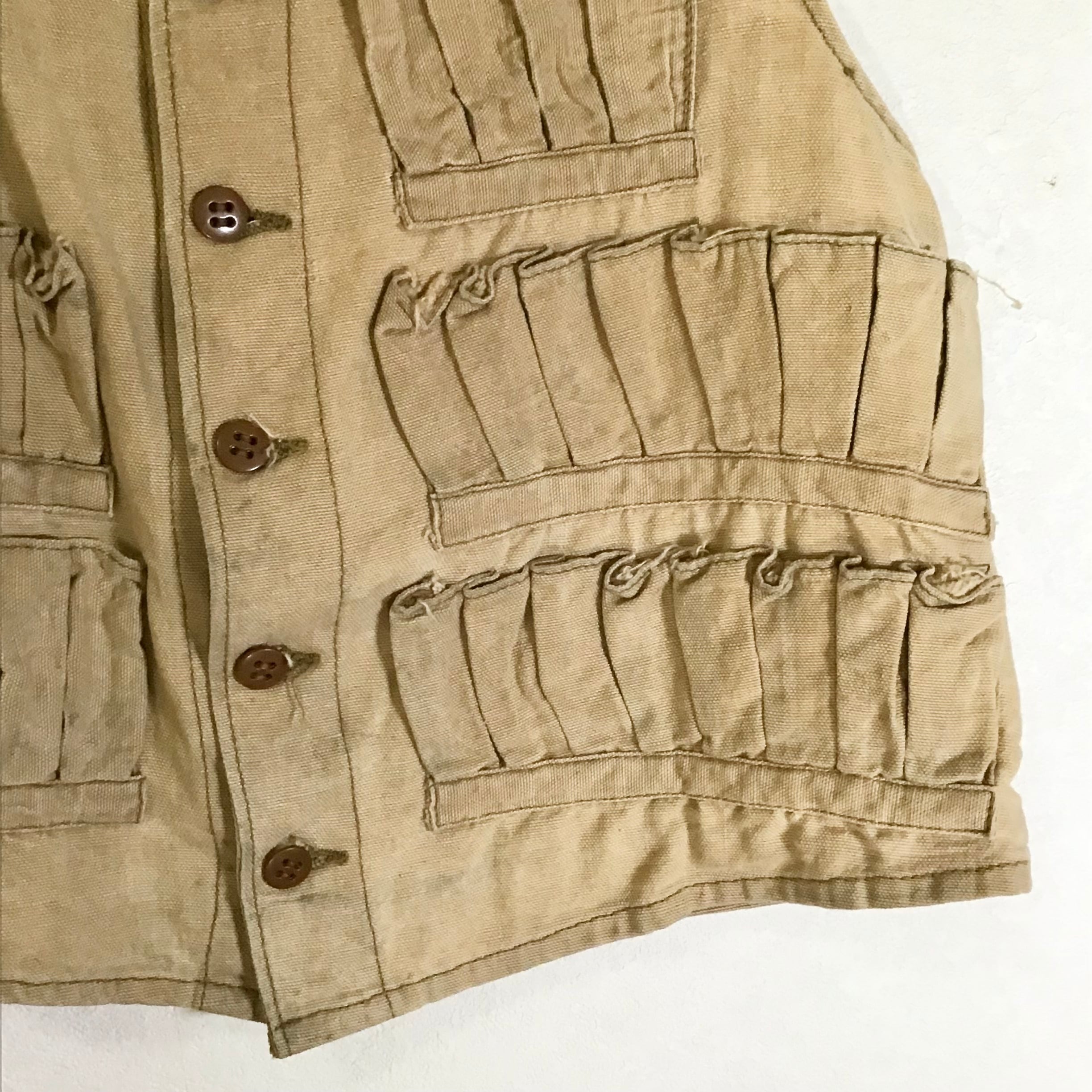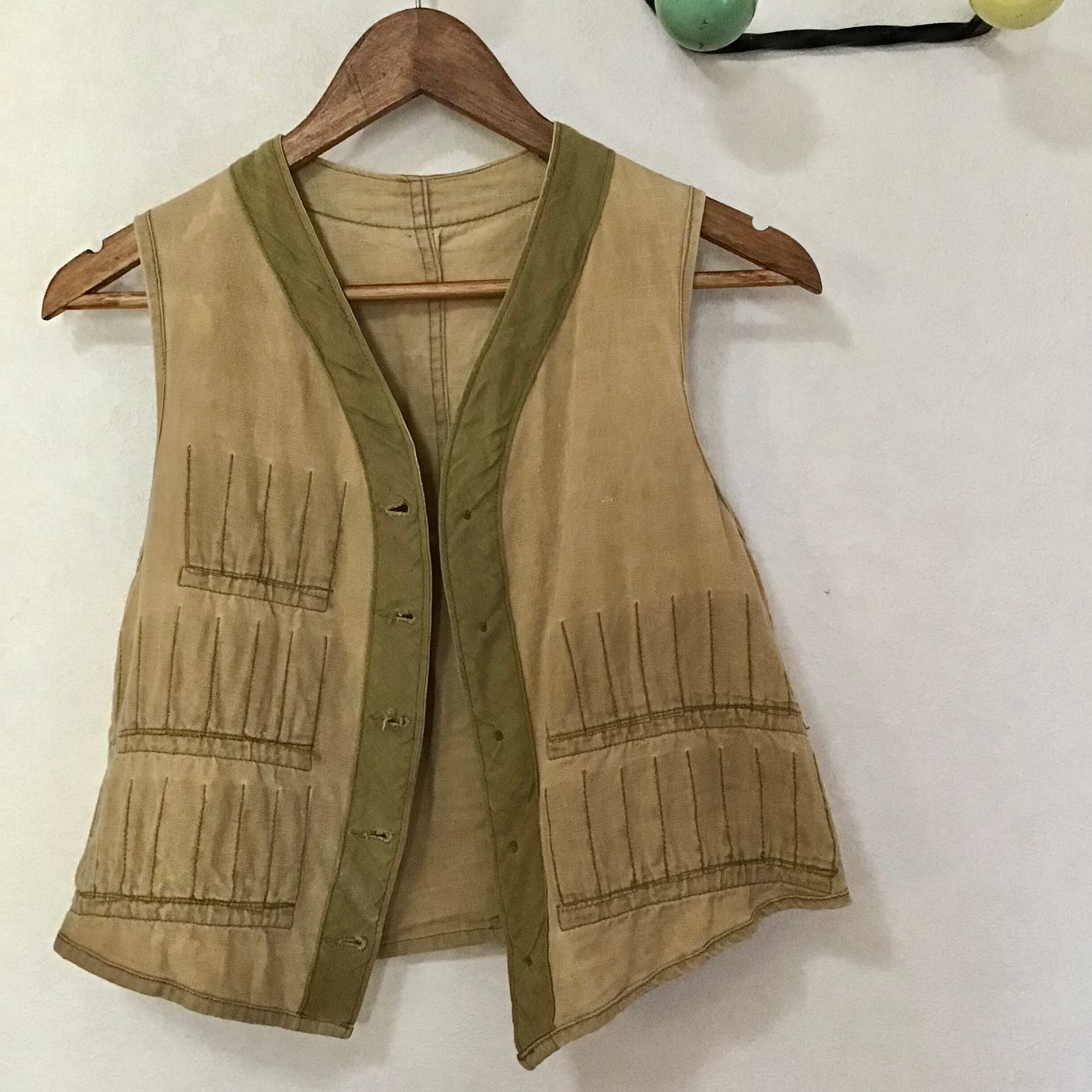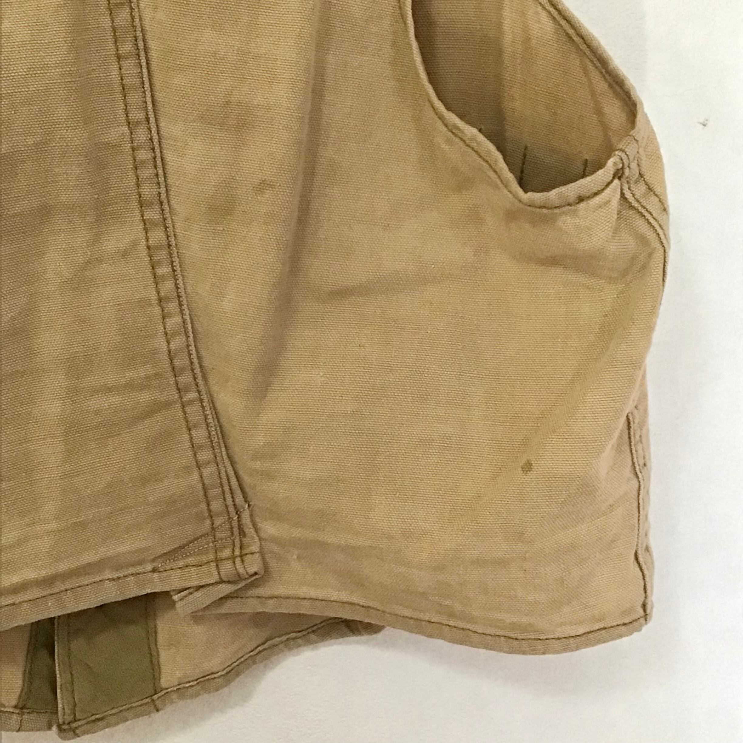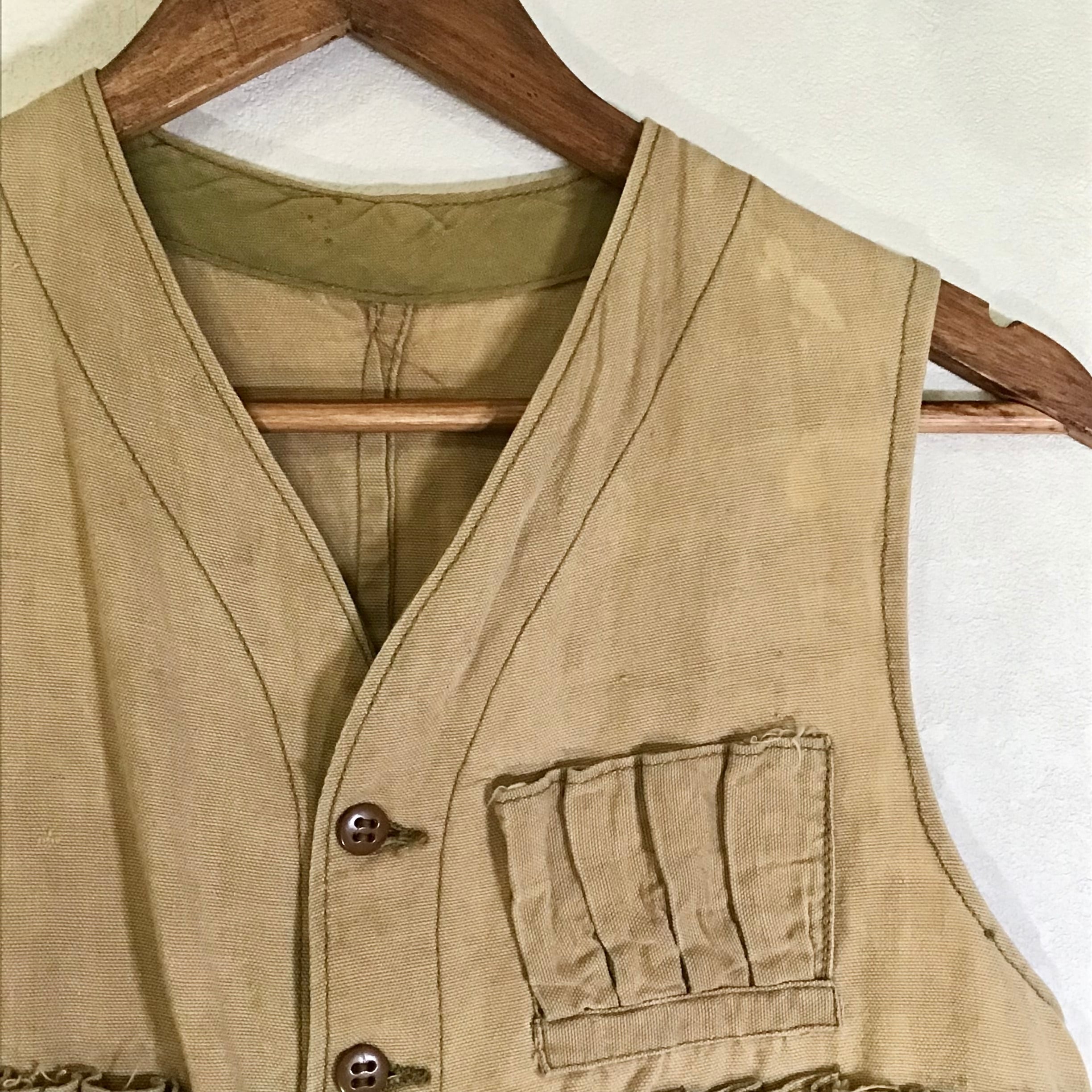 ハンドメイドのハンティングベスト。使い込まれて色褪せた柔らかなコットン地に弾薬ポケットが並ぶシンプルなデザイン◎こちらも裏返すと、ボディのベージュと縁取りのカーキのコントラストや規則正しく並んだポケットの縫い目が面白く、個人的に裏返しもおすすめしたいお品です♡