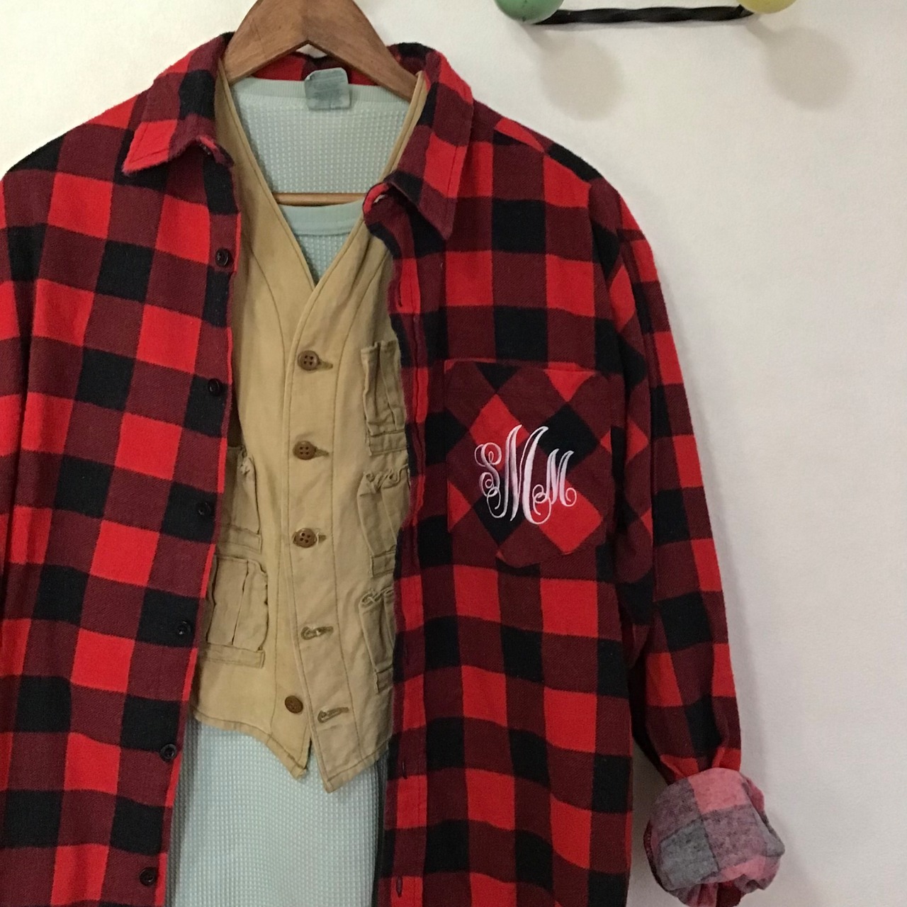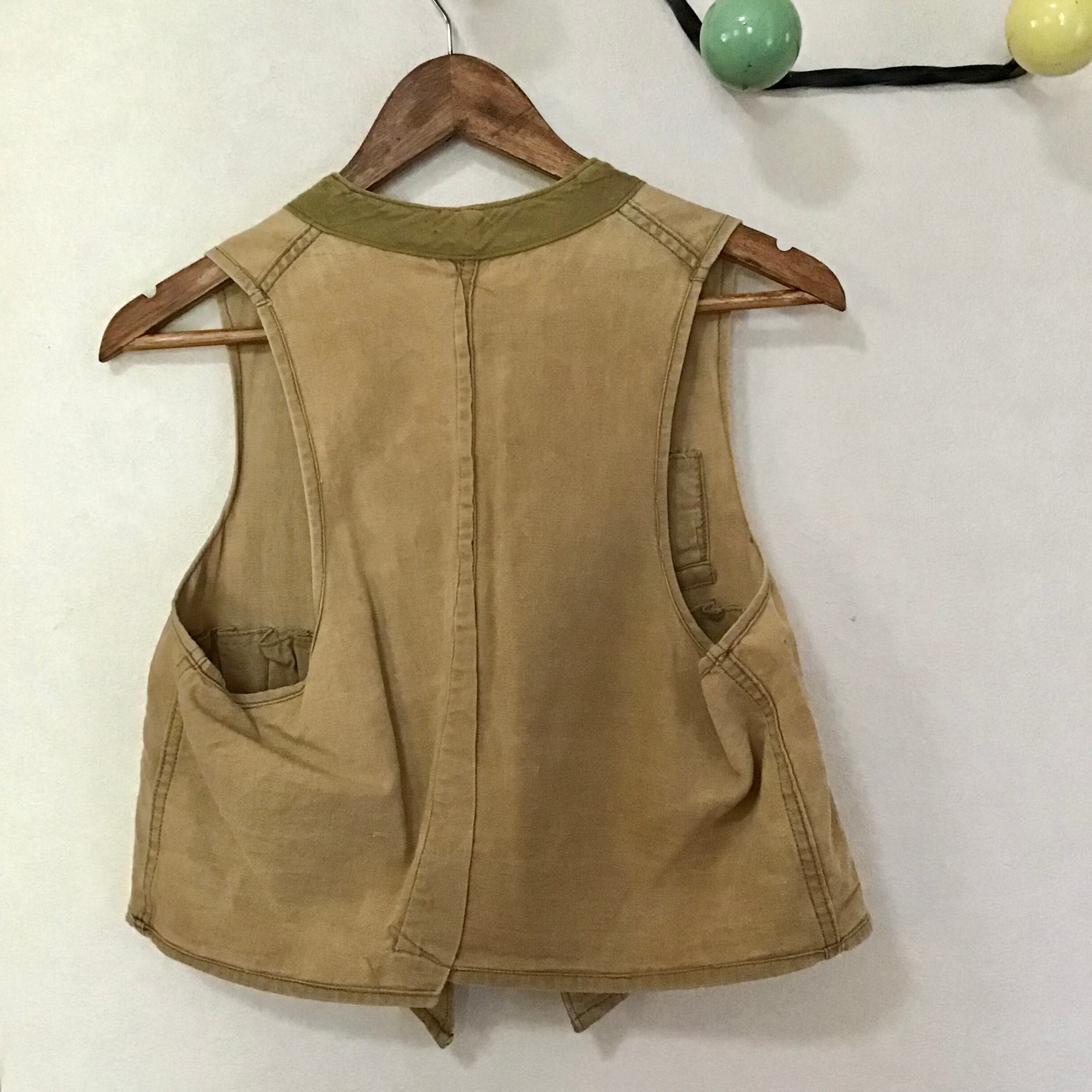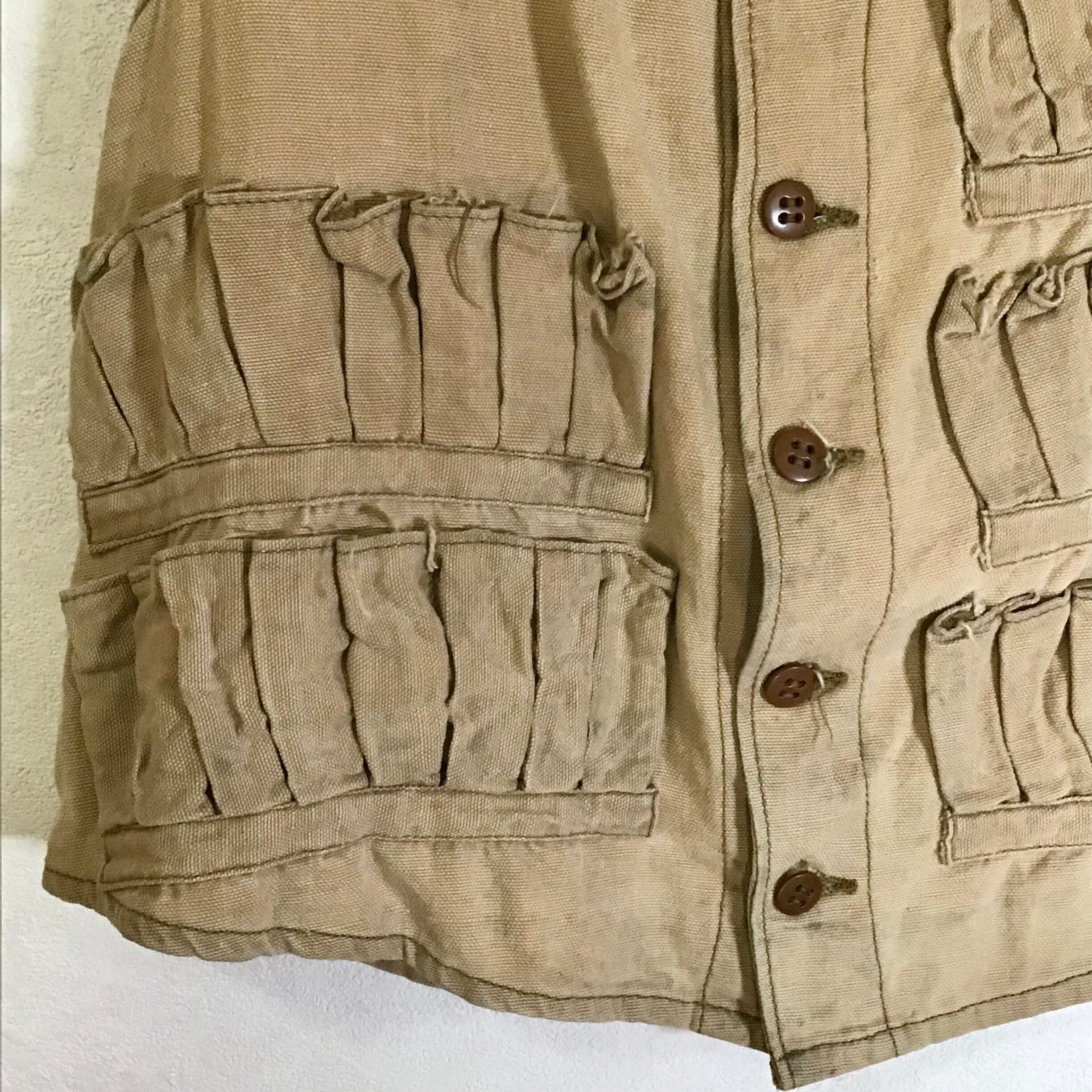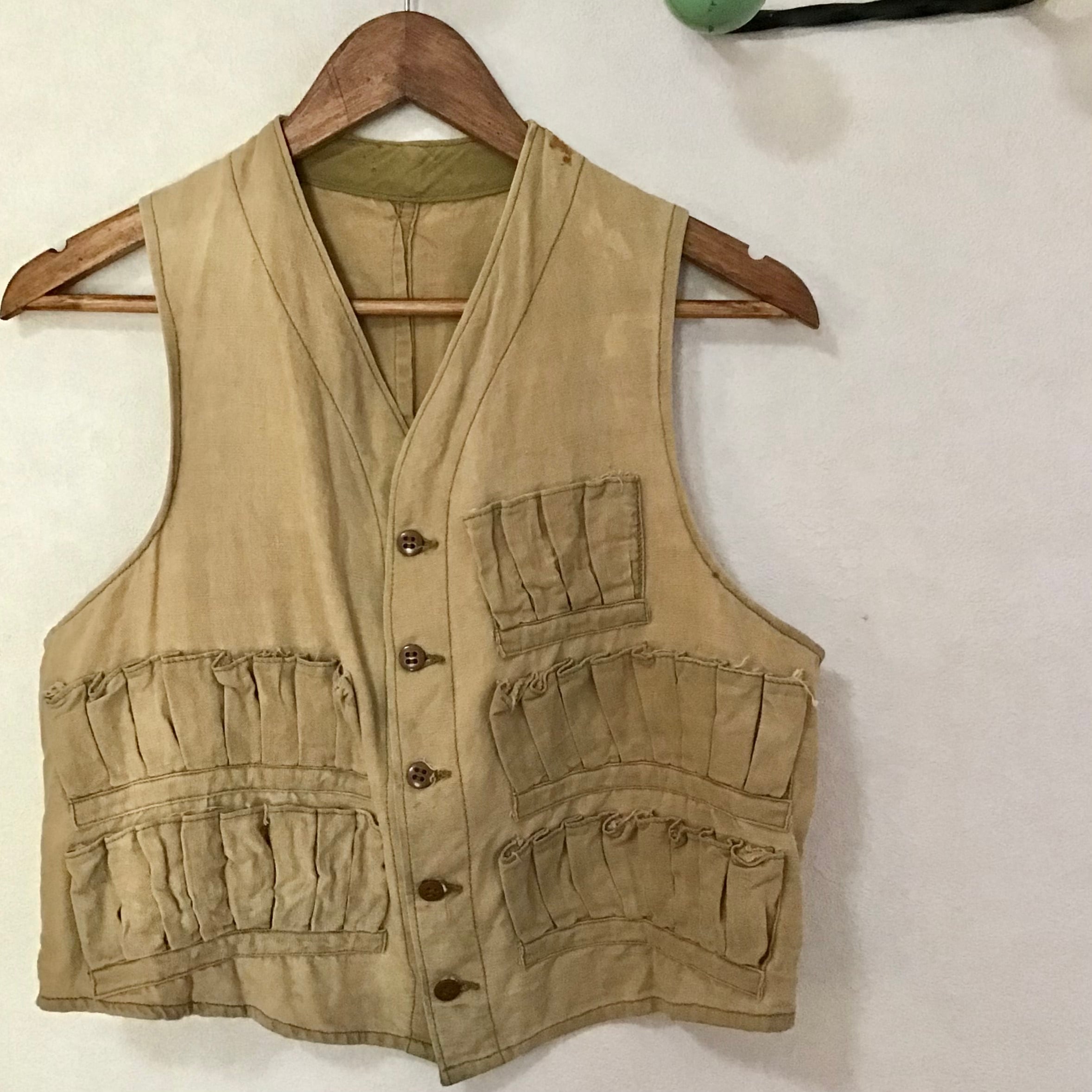 ハンドメイドのハンティングベスト。使い込まれて色褪せた柔らかなコットン地に弾薬ポケットが並ぶシンプルなデザイン◎こちらも裏返すと、ボディのベージュと縁取りのカーキのコントラストや規則正しく並んだポケットの縫い目が面白く、個人的に裏返しもおすすめしたいお品です♡