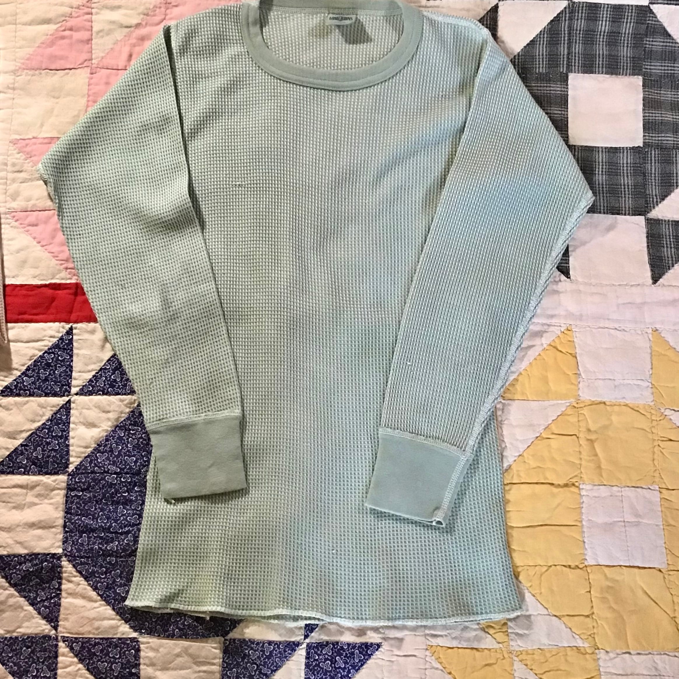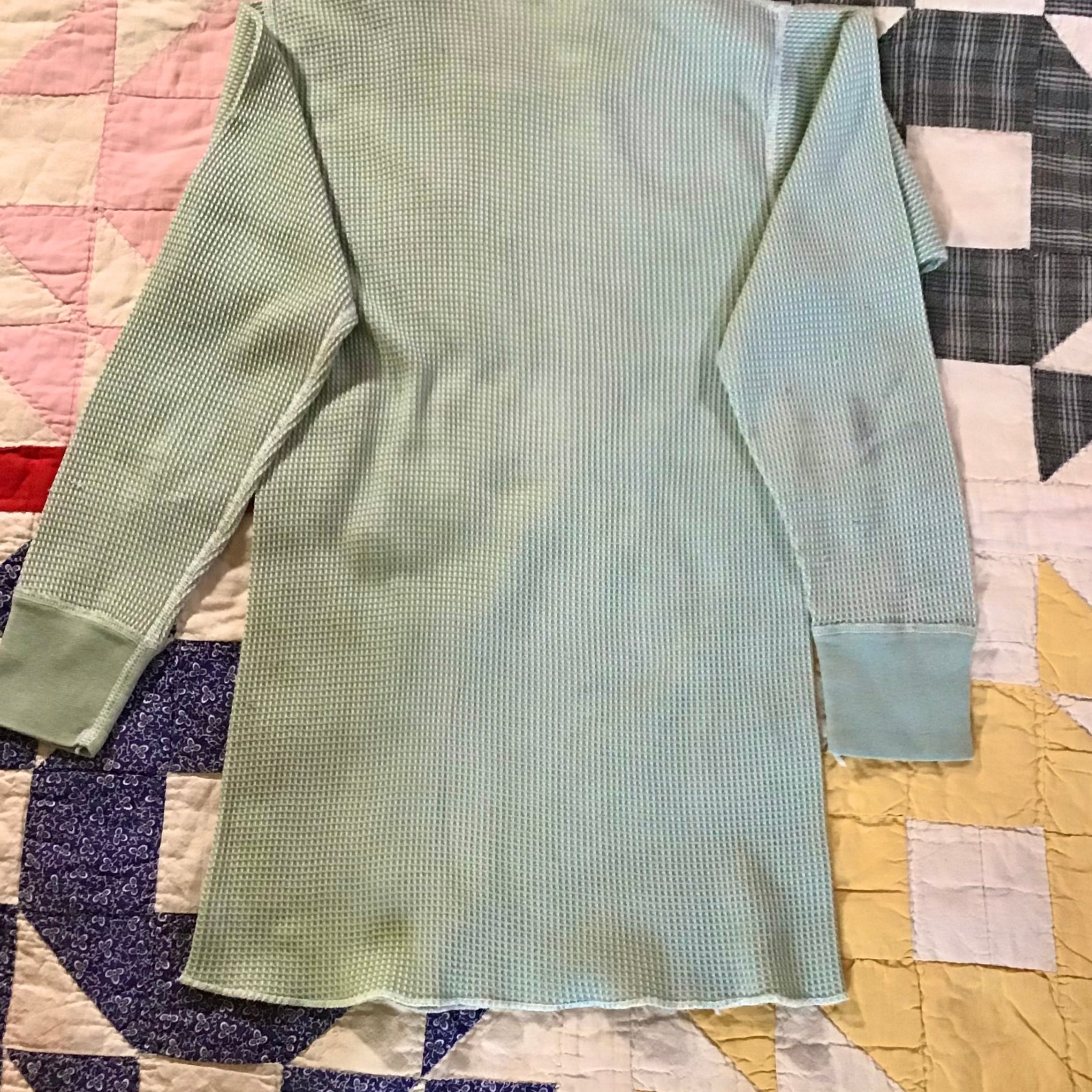 1980〜90年代のサーマルの後染めです。素材はコットンポリのワッフル地、薄いグリーンが柔らかな雰囲気でとても良い色です♡程よくジャストなサイズ感でカジュアルになりすぎず、古いコットンやリネンに合いそうです◎