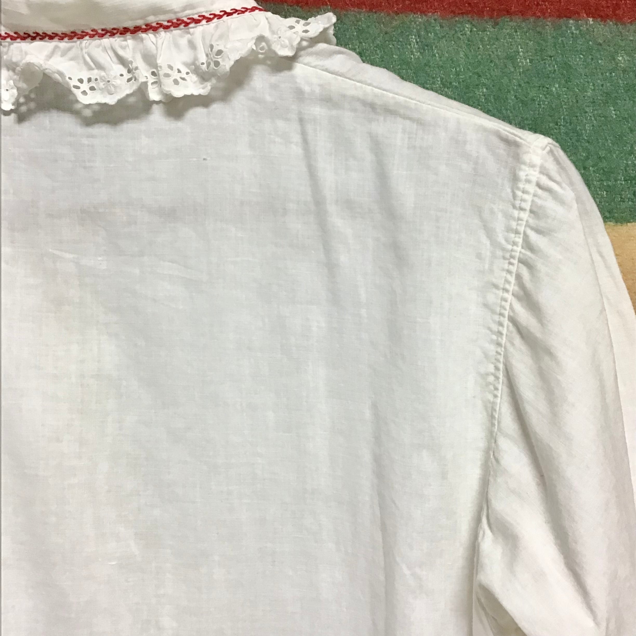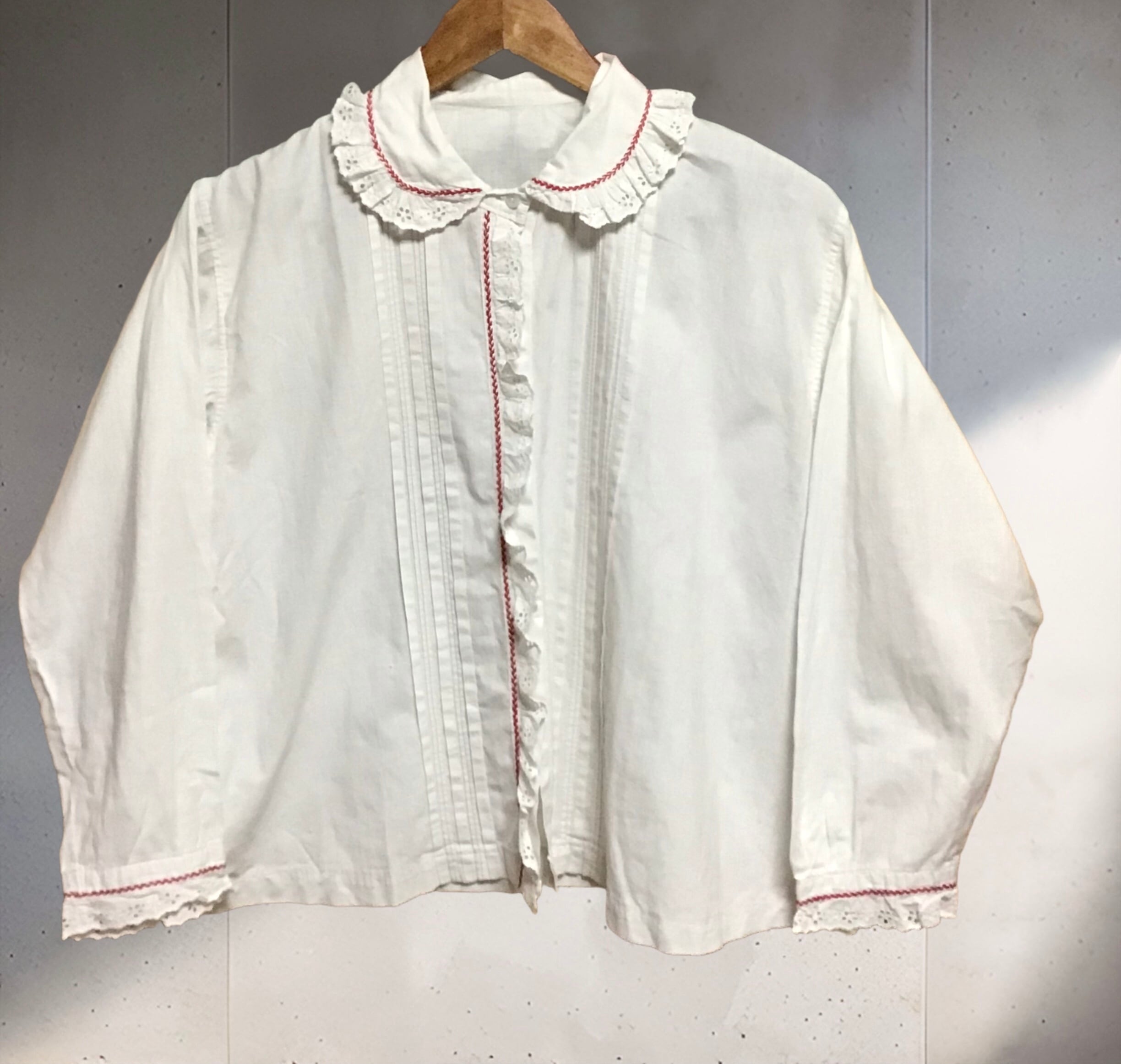 1930年代のコットンブラウス。ほんの少し裾に向かってフレアーになっており、襟や前立てのレースと赤いハンドステッチが可愛らしいお品です♡シンプルに一枚でも良いですし、少し薄手の柔らかいコットン生地が重ね着にも重宝しそうです◎普段使いに気負わず着れるアンティークです!