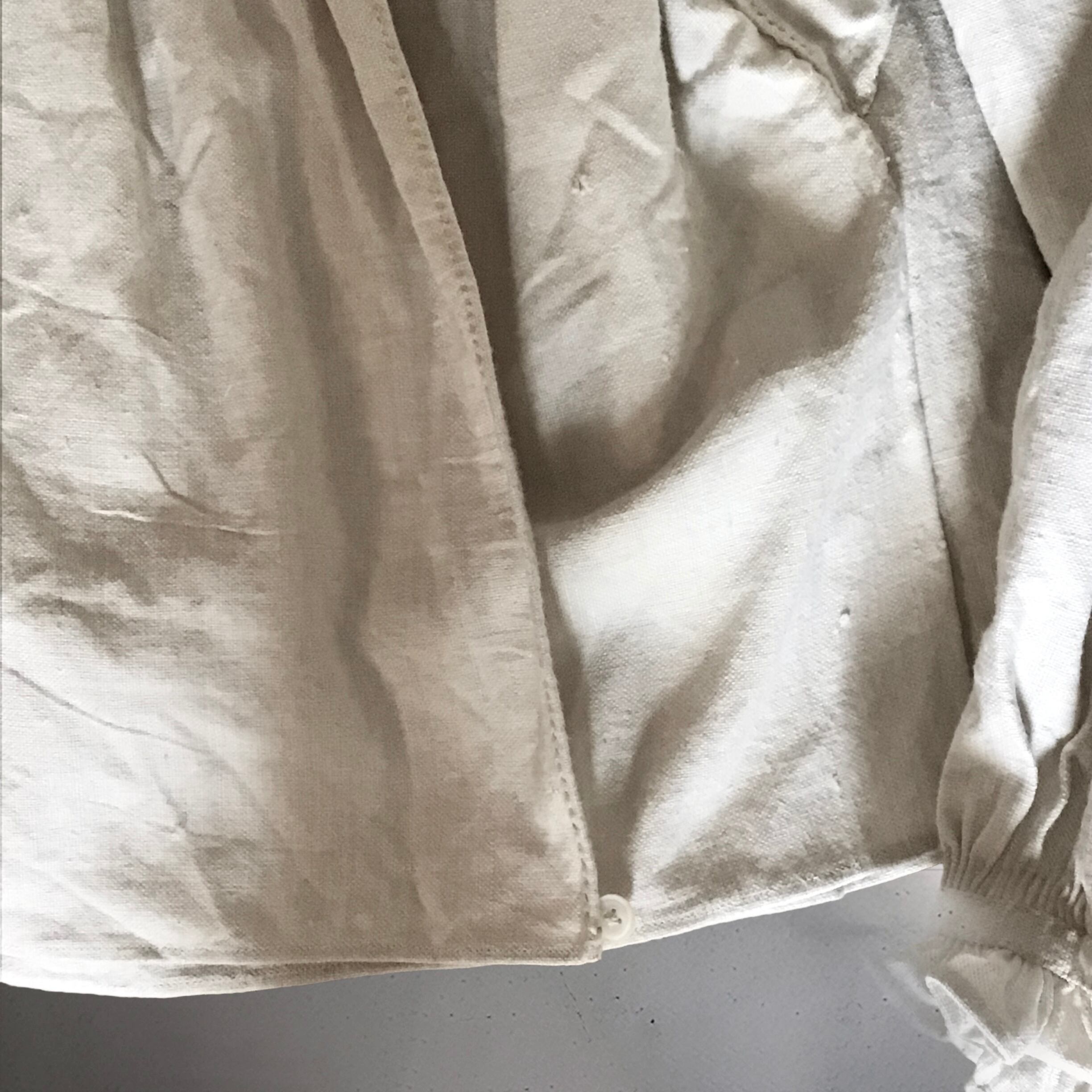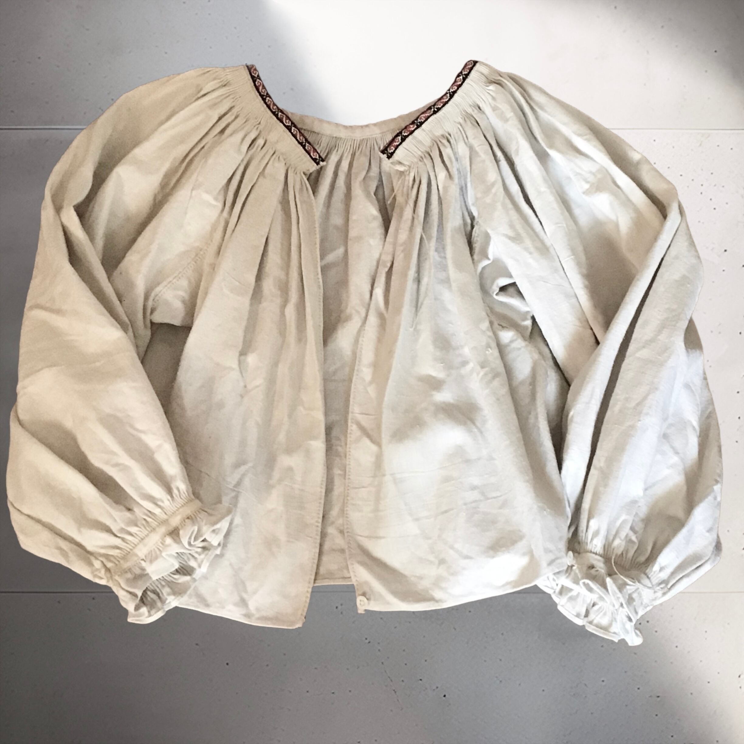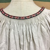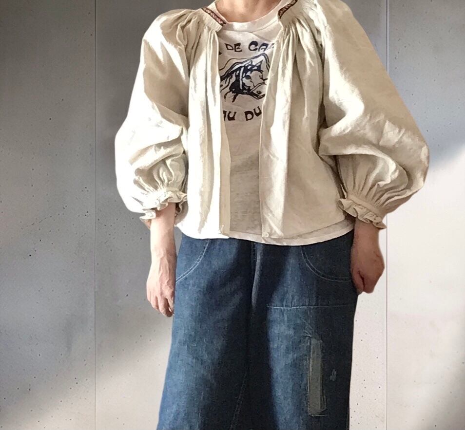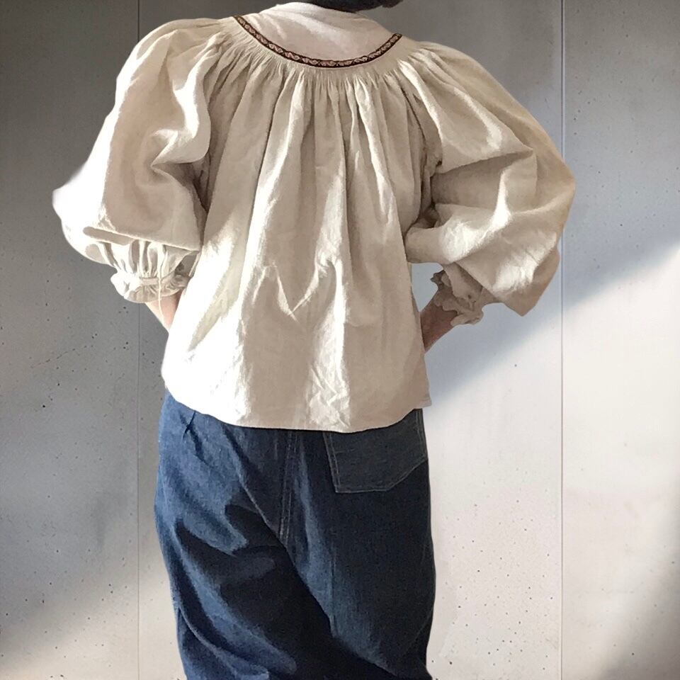 1930〜40年代のウクライナブラウス。こちらはフロントが切られ、カシュクールの様にボタンで留められるようリメイクされたものです◎コットンリネンの生地に細かなギャザーやイエローのハンドステッチが温もりを感じ、ボリュームのあるシルエットも可愛いです♡前は閉じても、開けて羽織っても良いので、被りのブラウスより使いやすいかもしれません◎