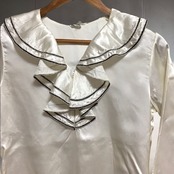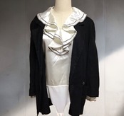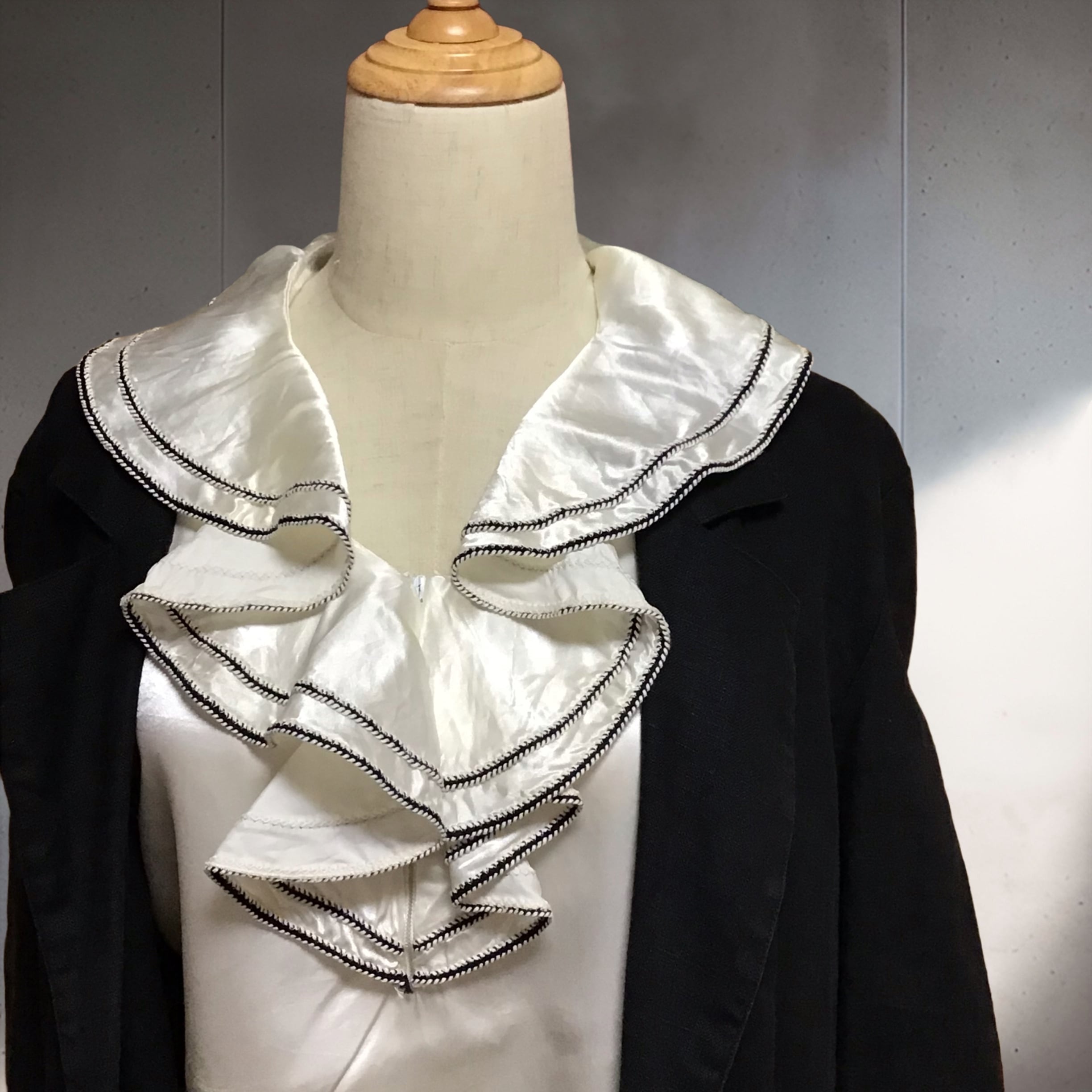 ラッフルカラーのボディスーツ。艶やかなサテン地にラッフルカラーやネイビーのステッチが可愛いらしくも華やかな雰囲気です♡お腹から下はメッシュ素材に切り替えられ、それもポイントになっています◎