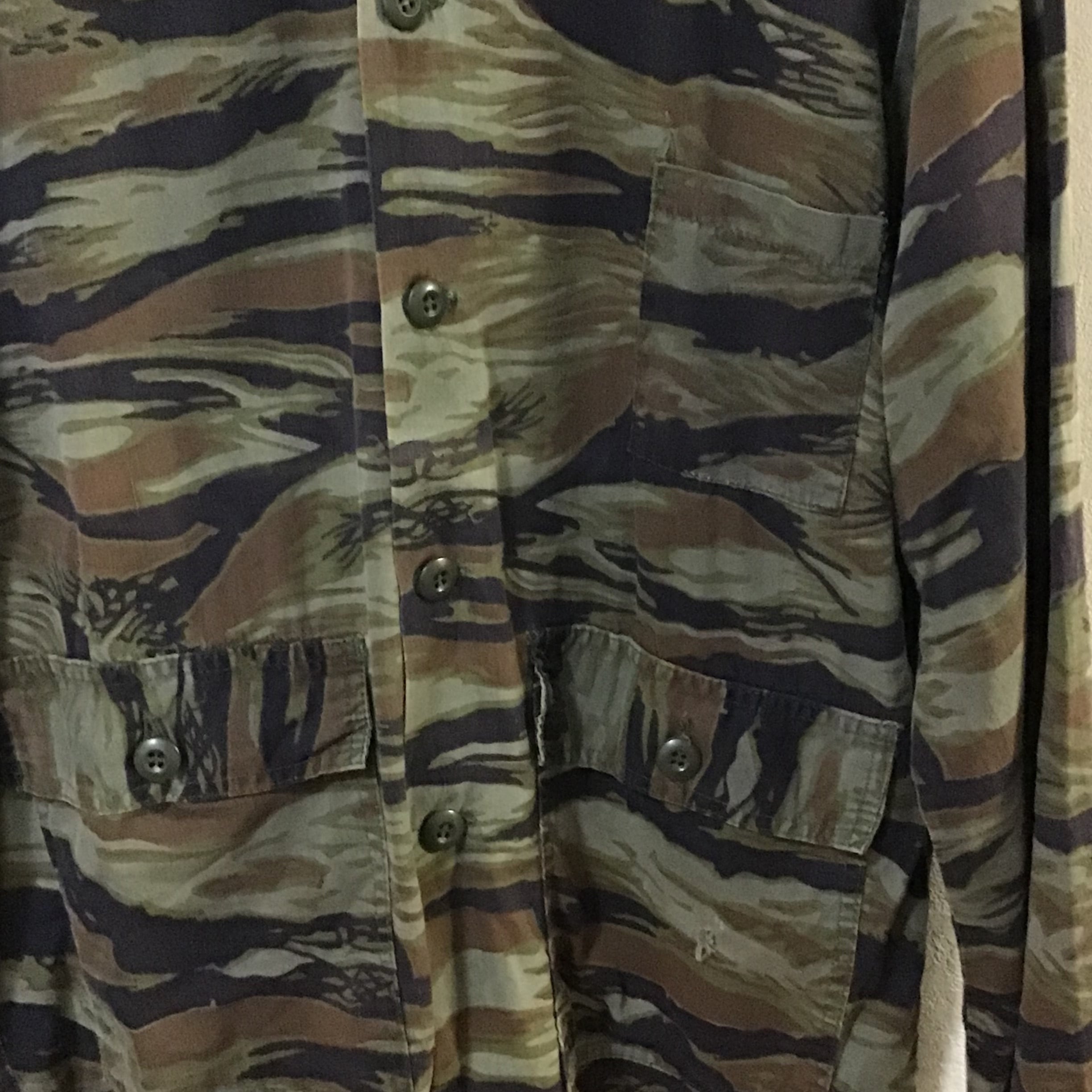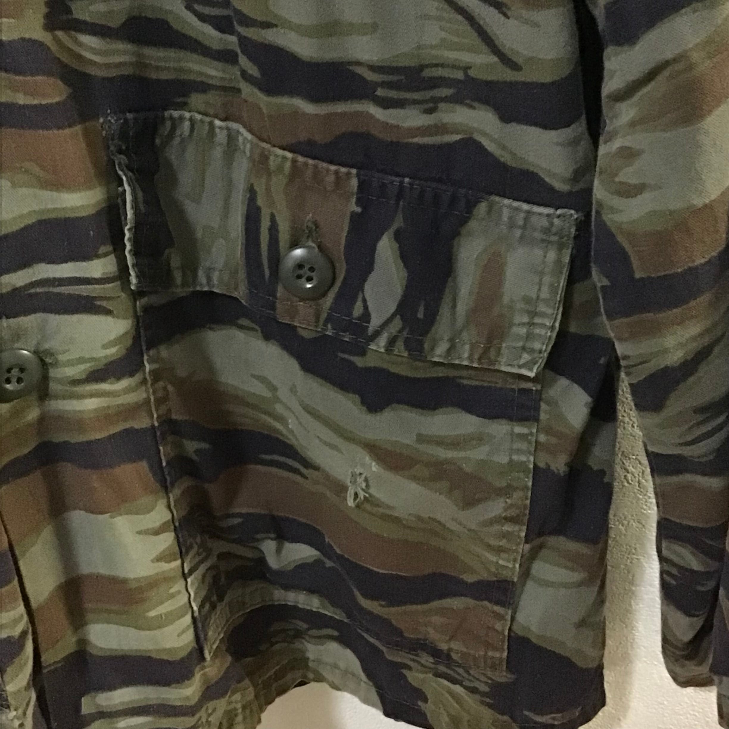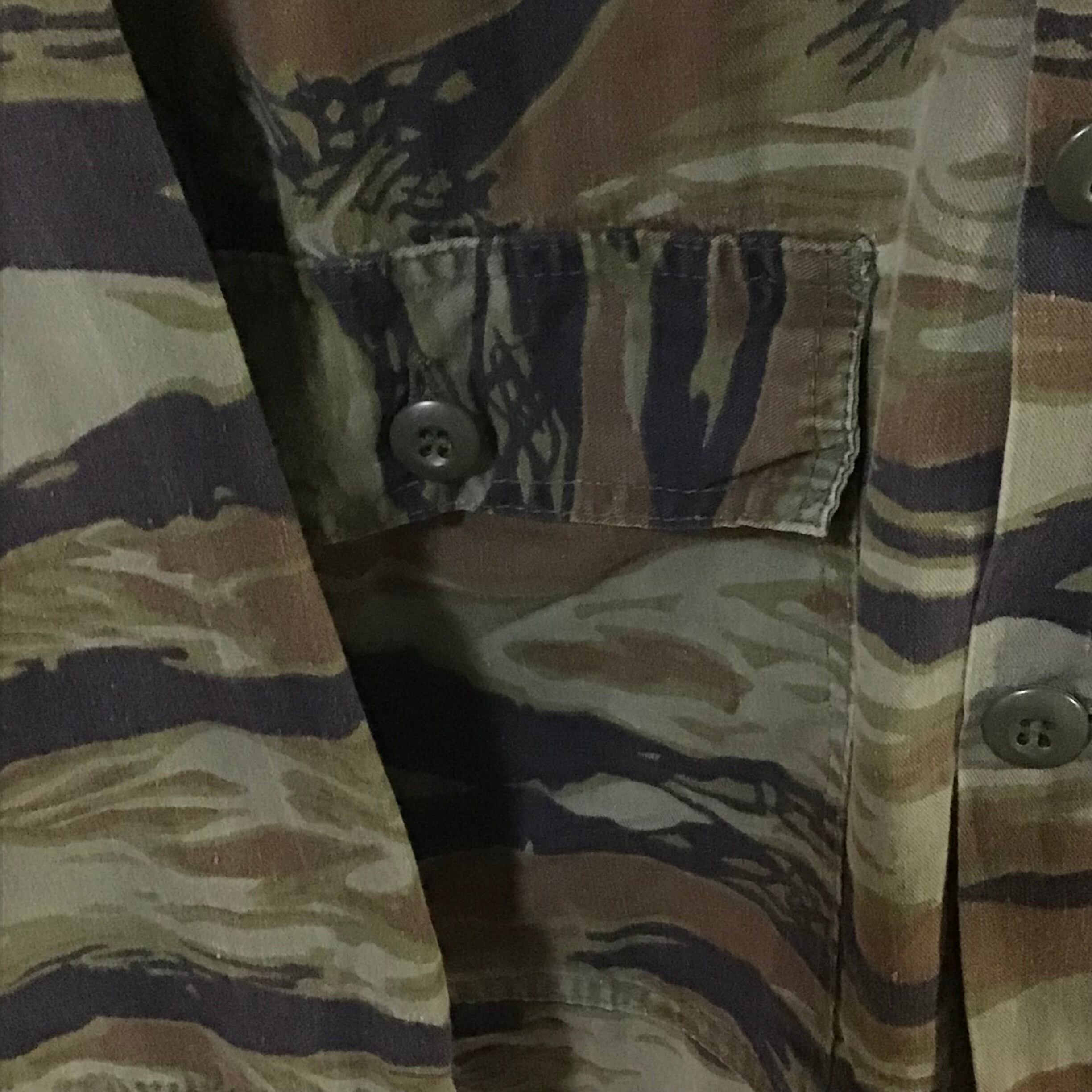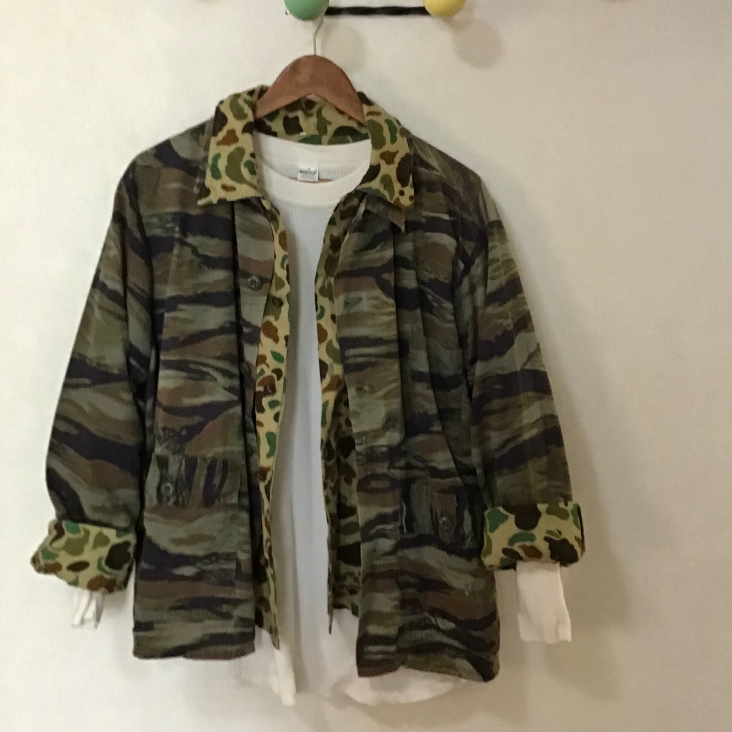 1990年代のタイガーストライプカモのジャケット。少し薄めの素材で軽く羽織るのにちょうど良いです◎タイガーカモはミリタリー感が出過ぎず、すっきりとした印象で、モノトーンで合わせるととてもカッコいいと思います♡