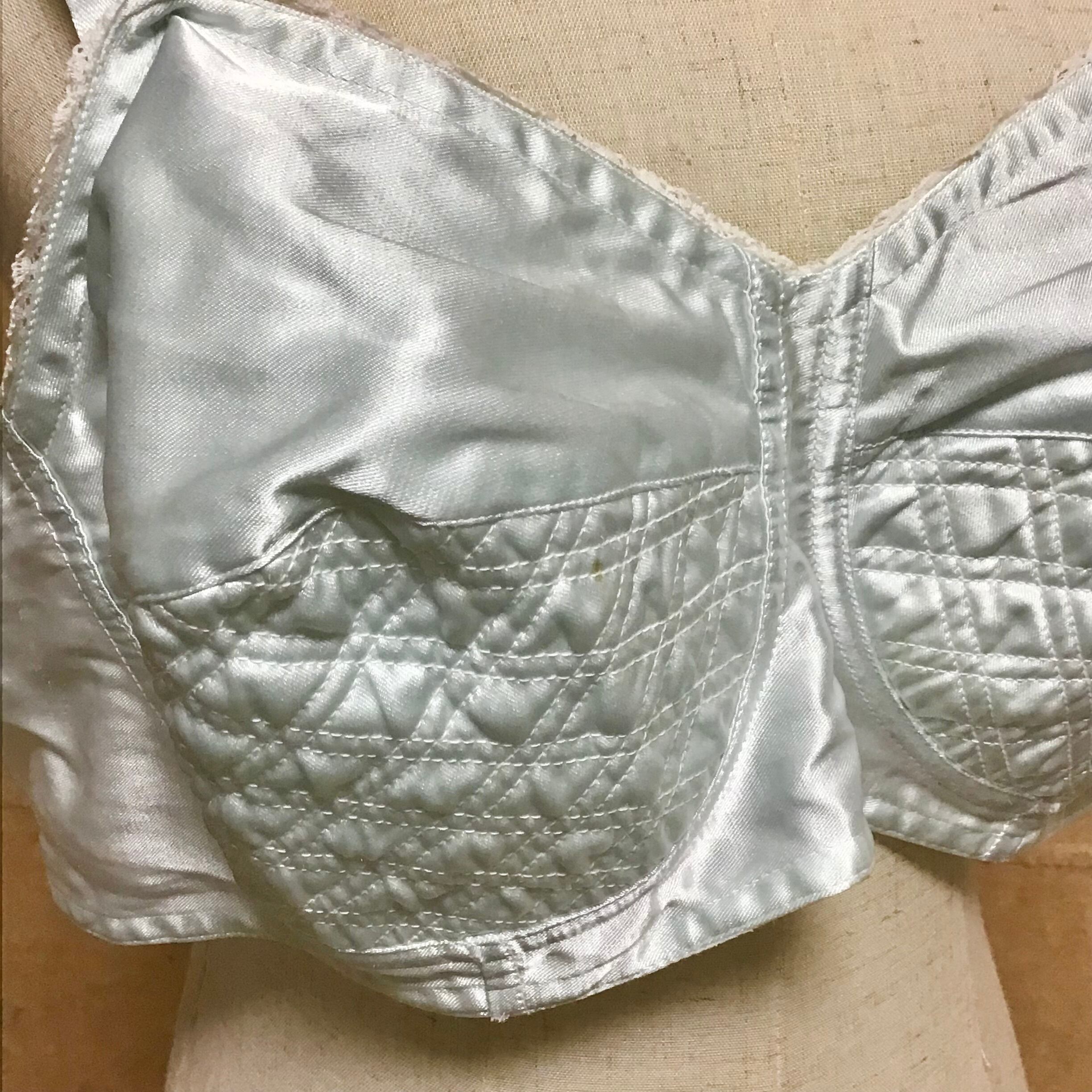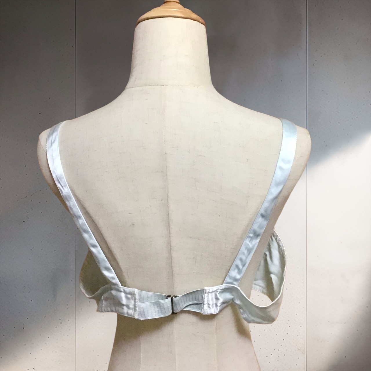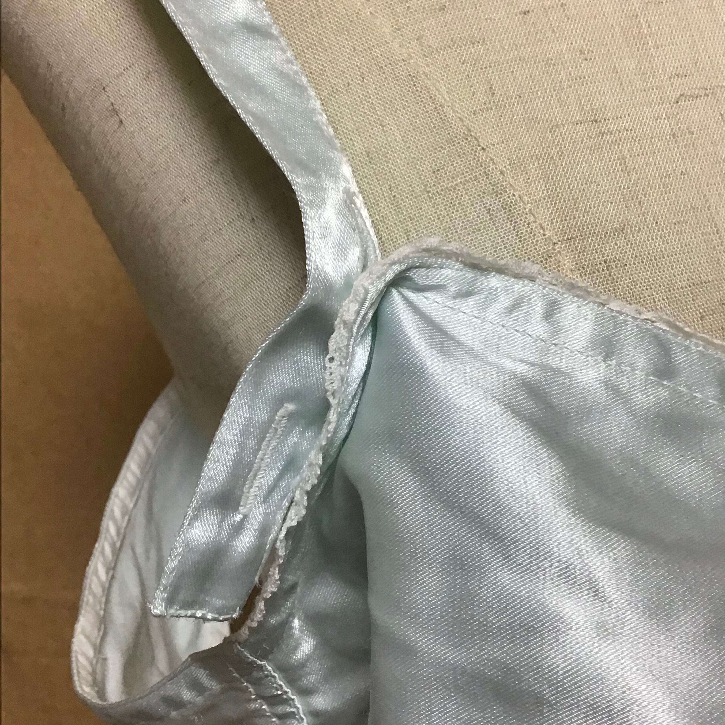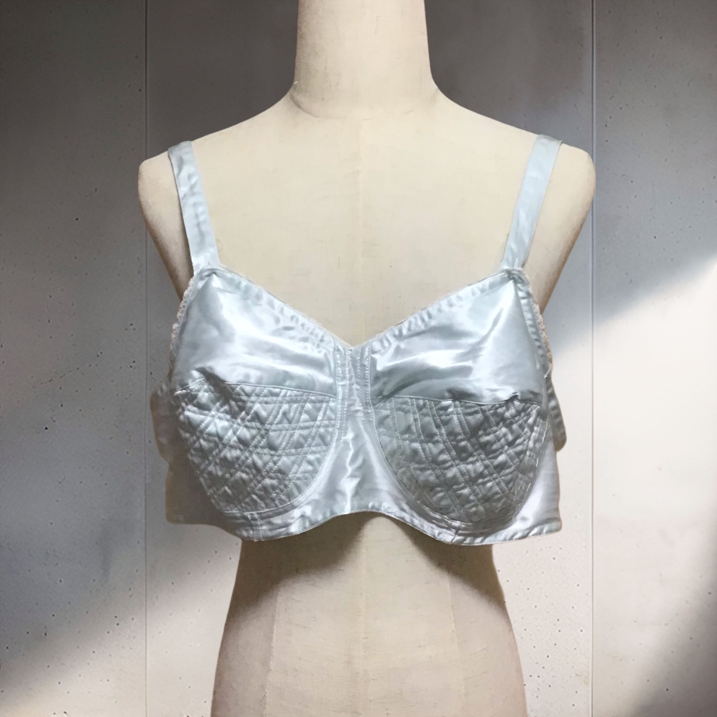 1970年代のコットンサテンブラレット、新古品です◎とても淡いライトブルーに艶のあるサテンが可憐です♡幅があり、アンダーもゆったり目なのでボリュームのあるニットやスウェットに重ねても可愛いです◎ジャケットやニットガウンからチラリと覗かせたり、ポイントに使えるプラスワンアイテムです!