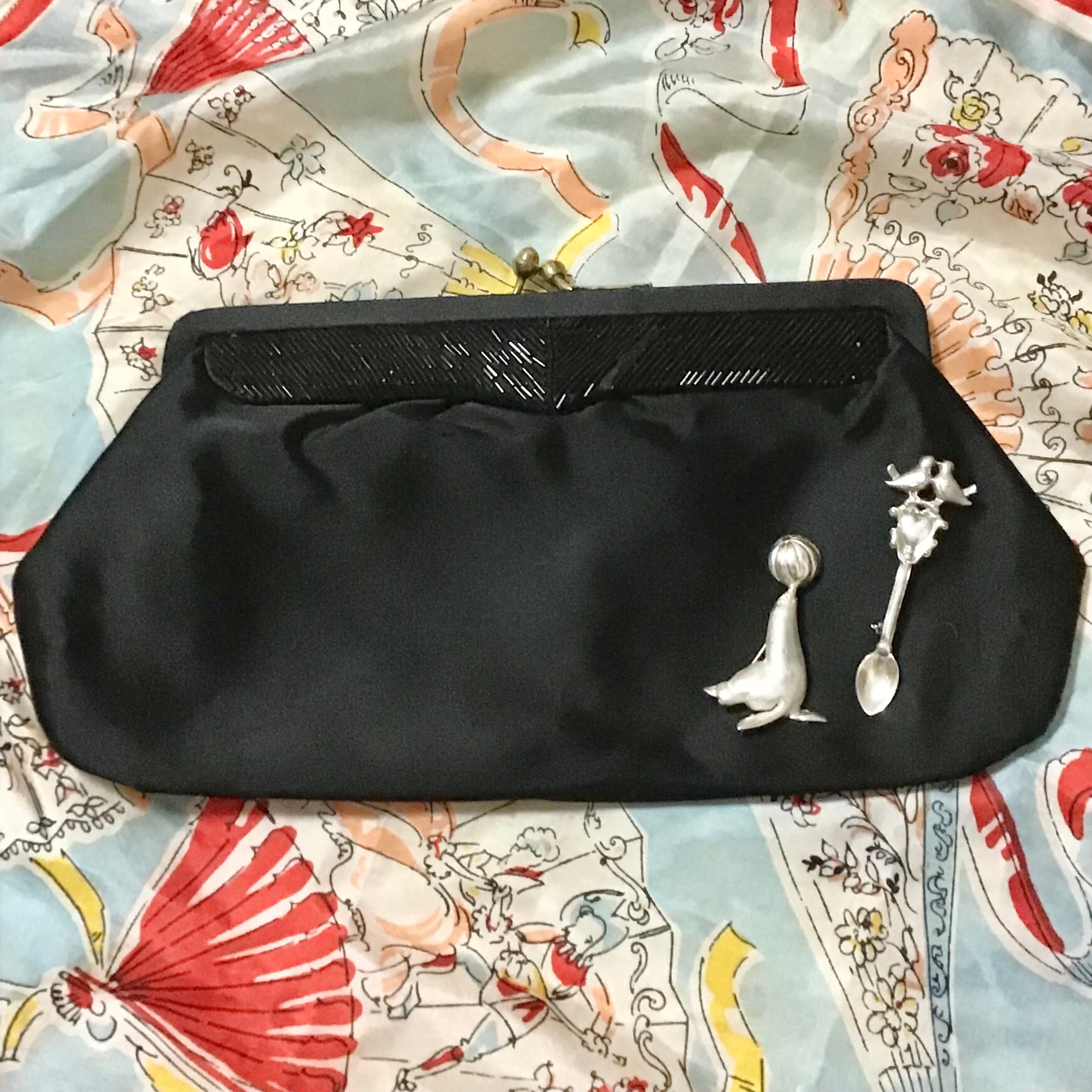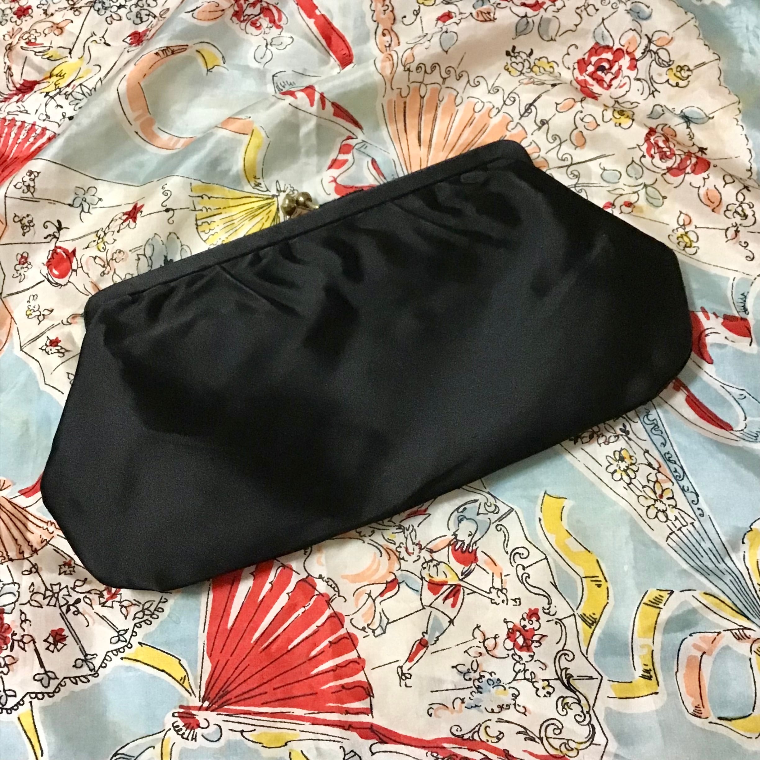 ブラックサテンのクラッチバッグ。程よいサイズにビーズ刺繍が入ったシンプルなデザインがいろいろなシーンで活躍してくれそうです◎ブローチなどで自分流にカスタムしたり、バッグインバッグとして使っても洒落てます♡Zoey オリジナルミニミラーのおまけ付きです!