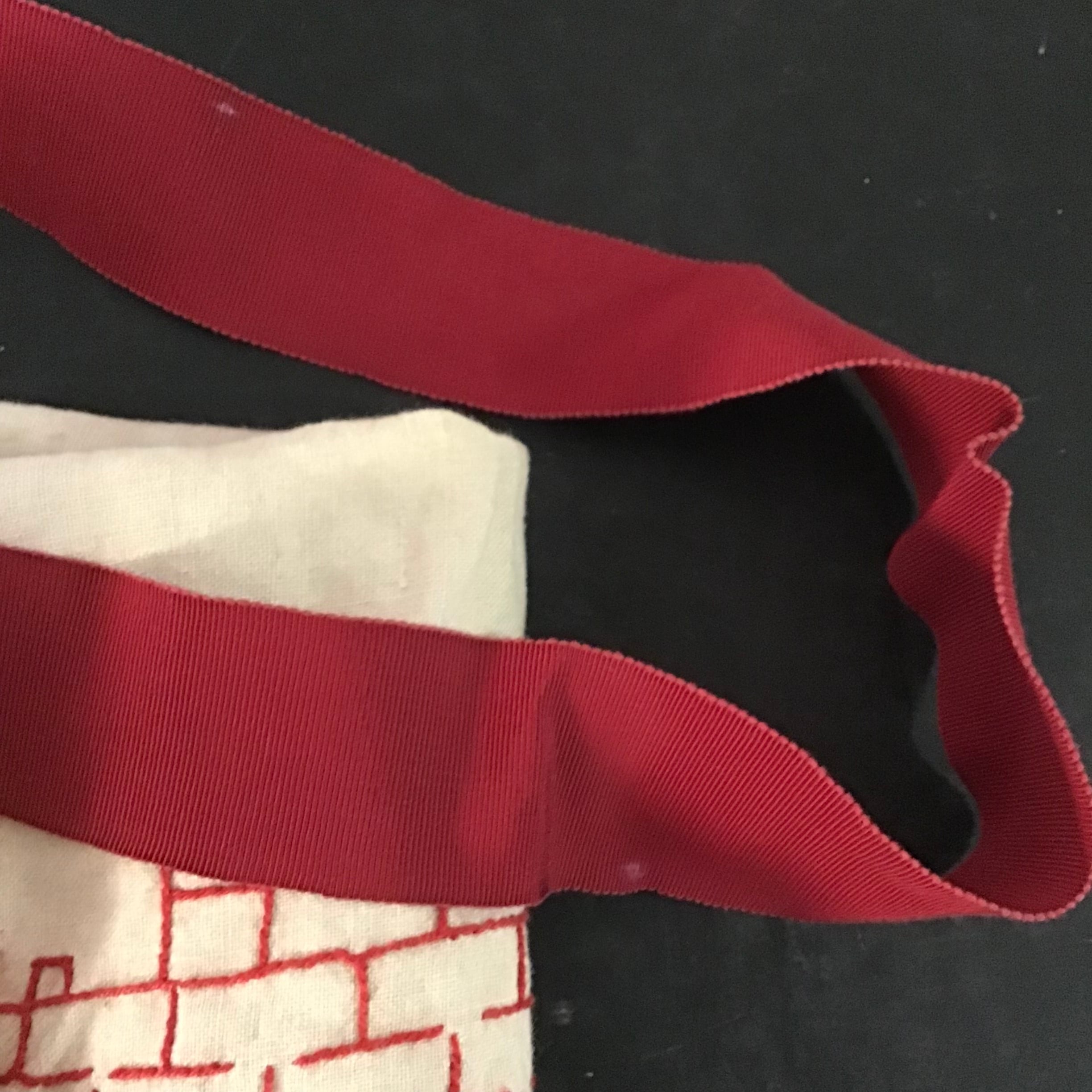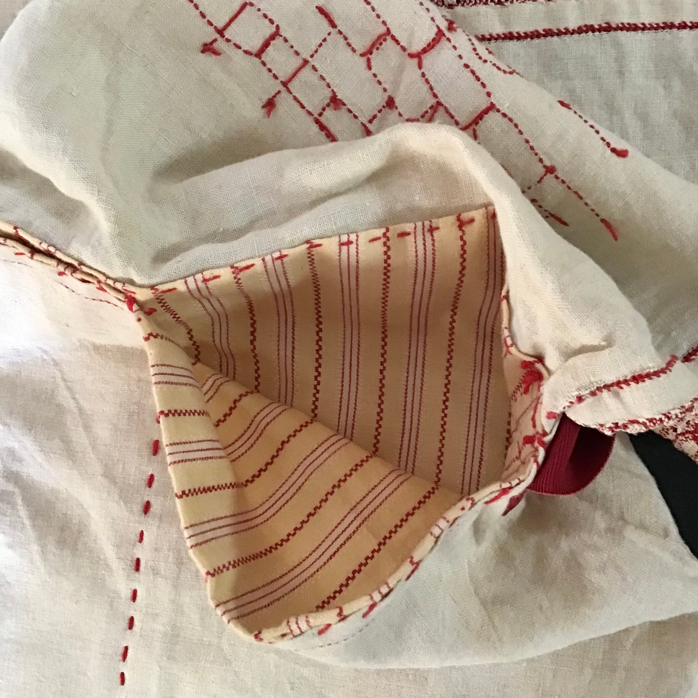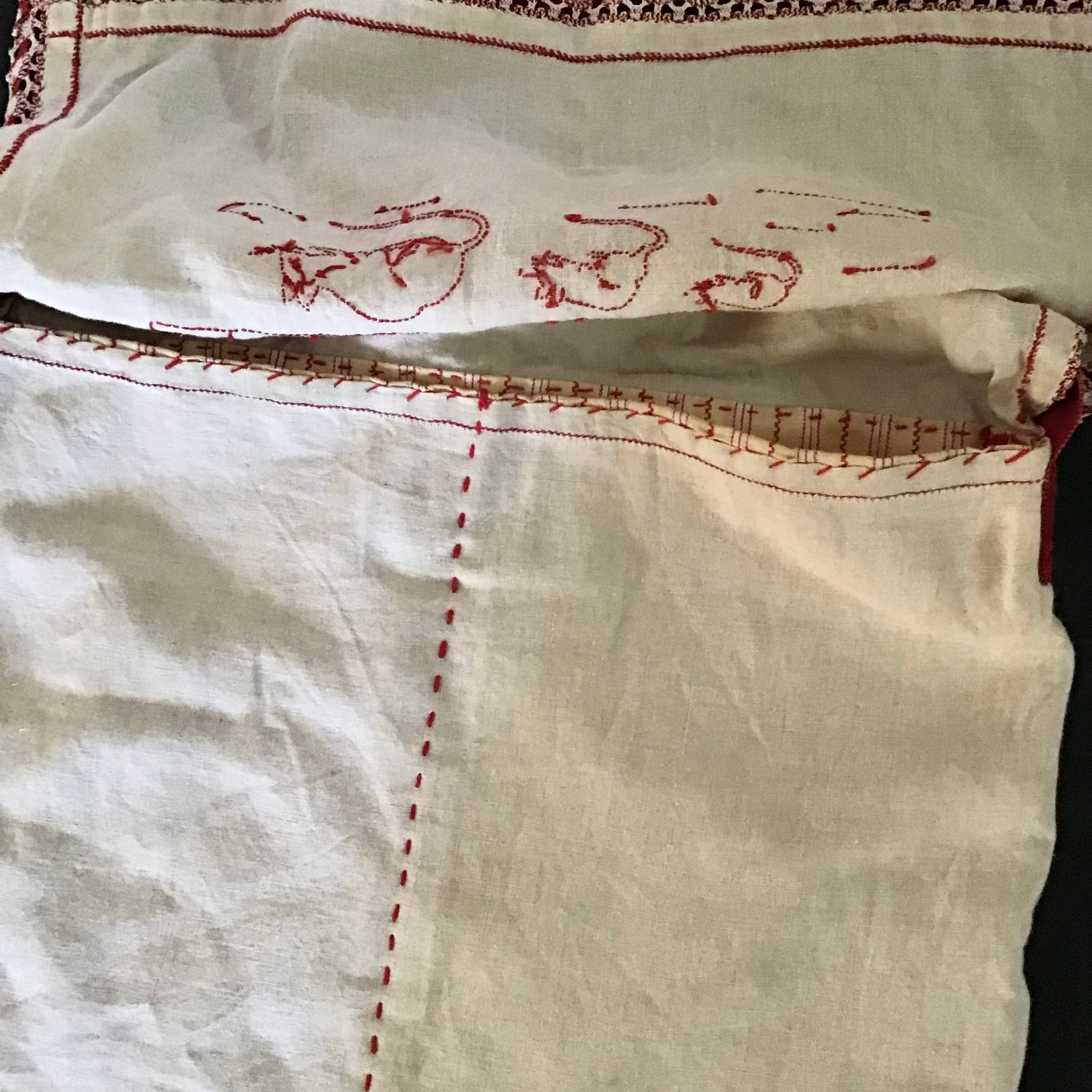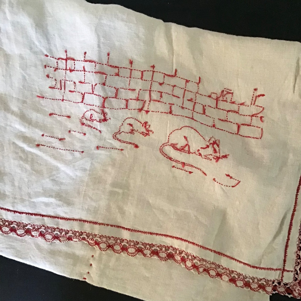 1920年代、枕カバーのリメイクバッグ。柔らかなリネンにネズミの親子の刺繍が可愛いです♡枕カバーの内側に生地が縫い付けられて2つに別れており、リメイクされたのは近年だと思いますが内側の生地も古そうで、素朴なお作りに温かみを感じるお品です♡ストラップは幅広のリボンが使われ、中の生地がしっかりしているので実際に物を入れても形が崩れにくそうです◎