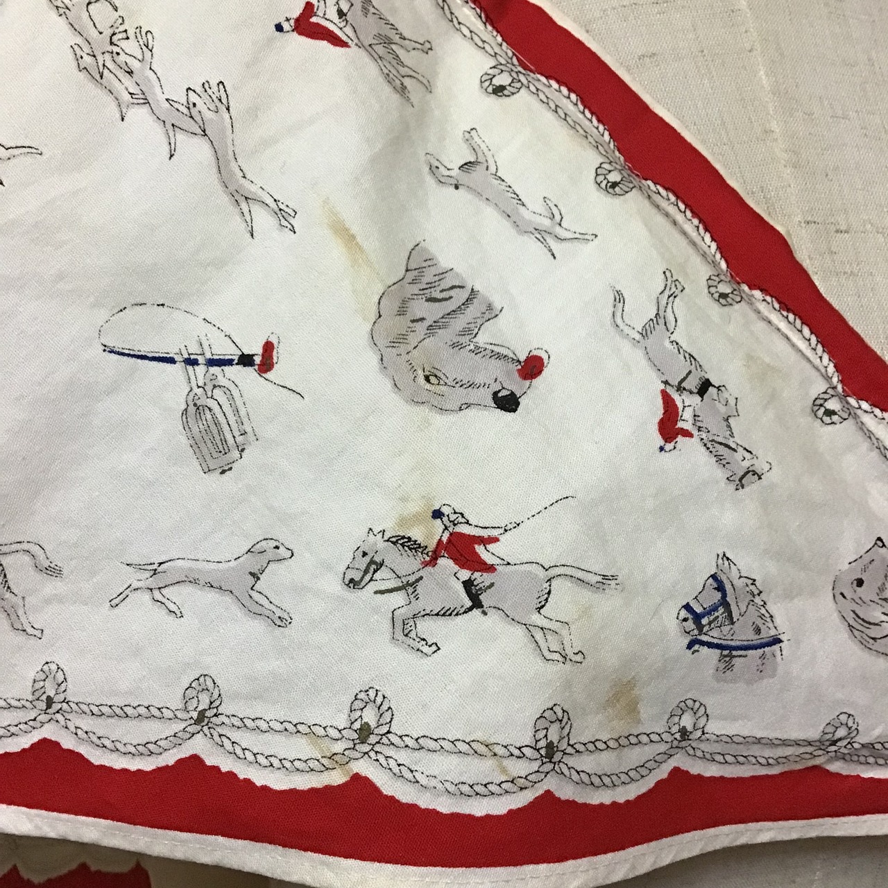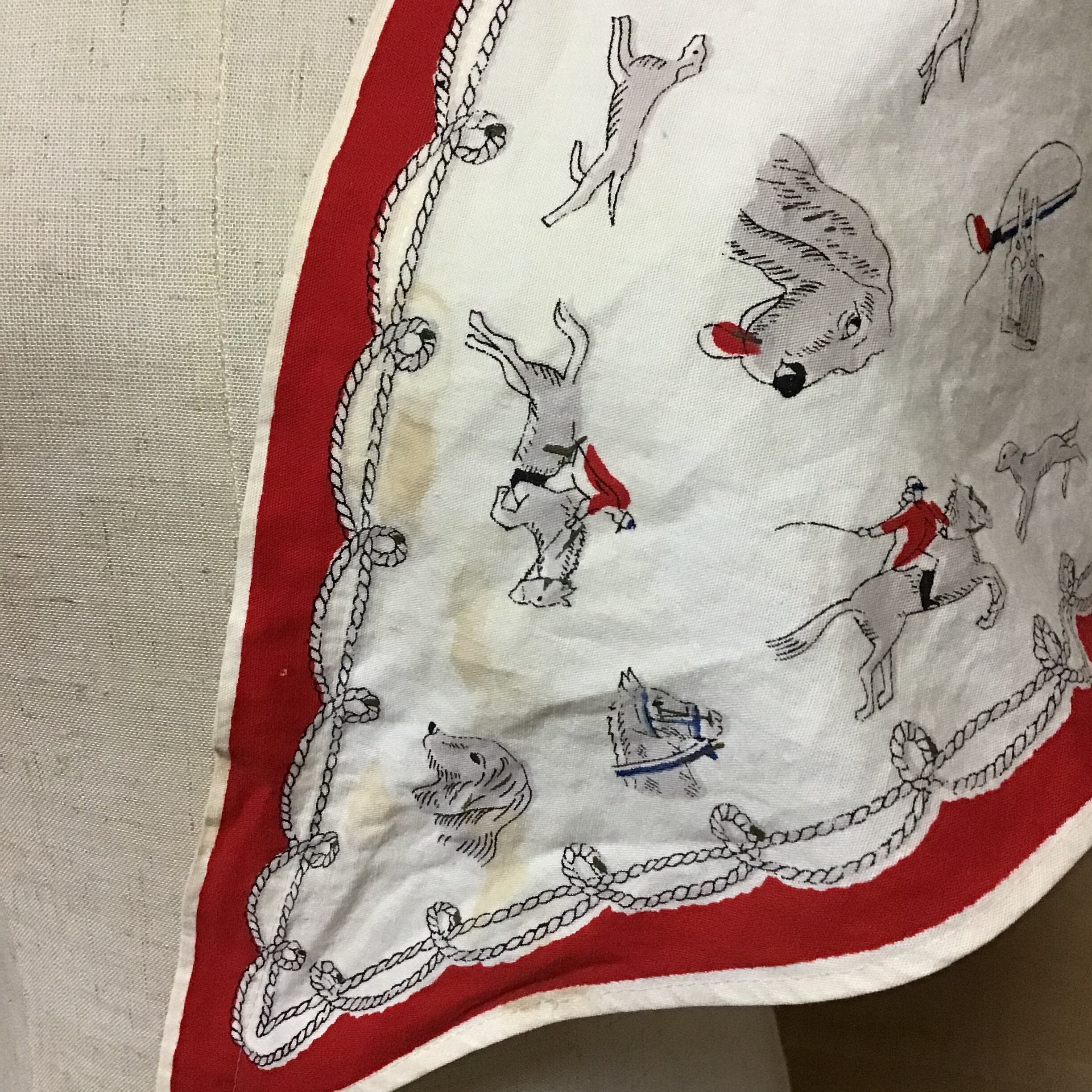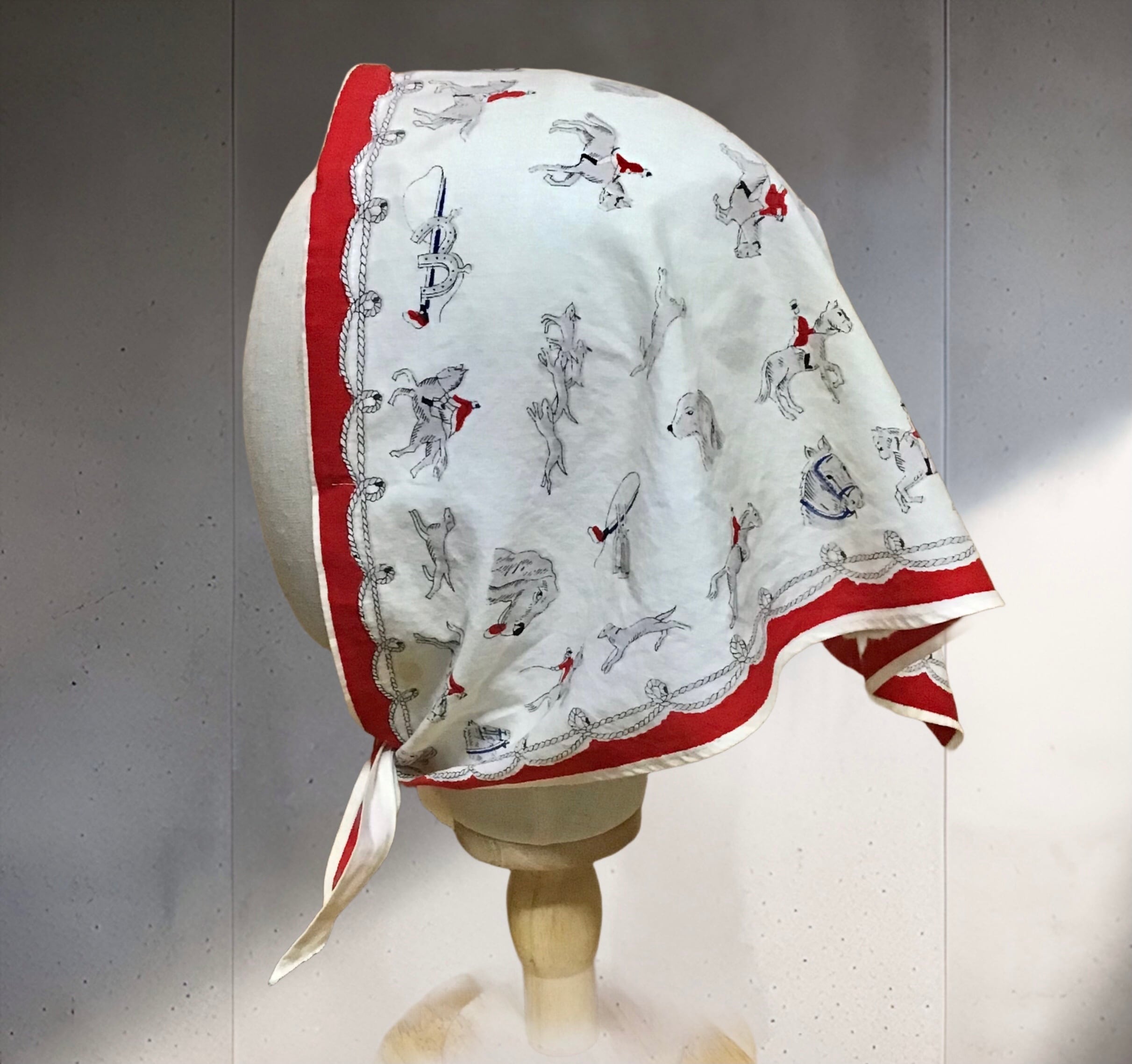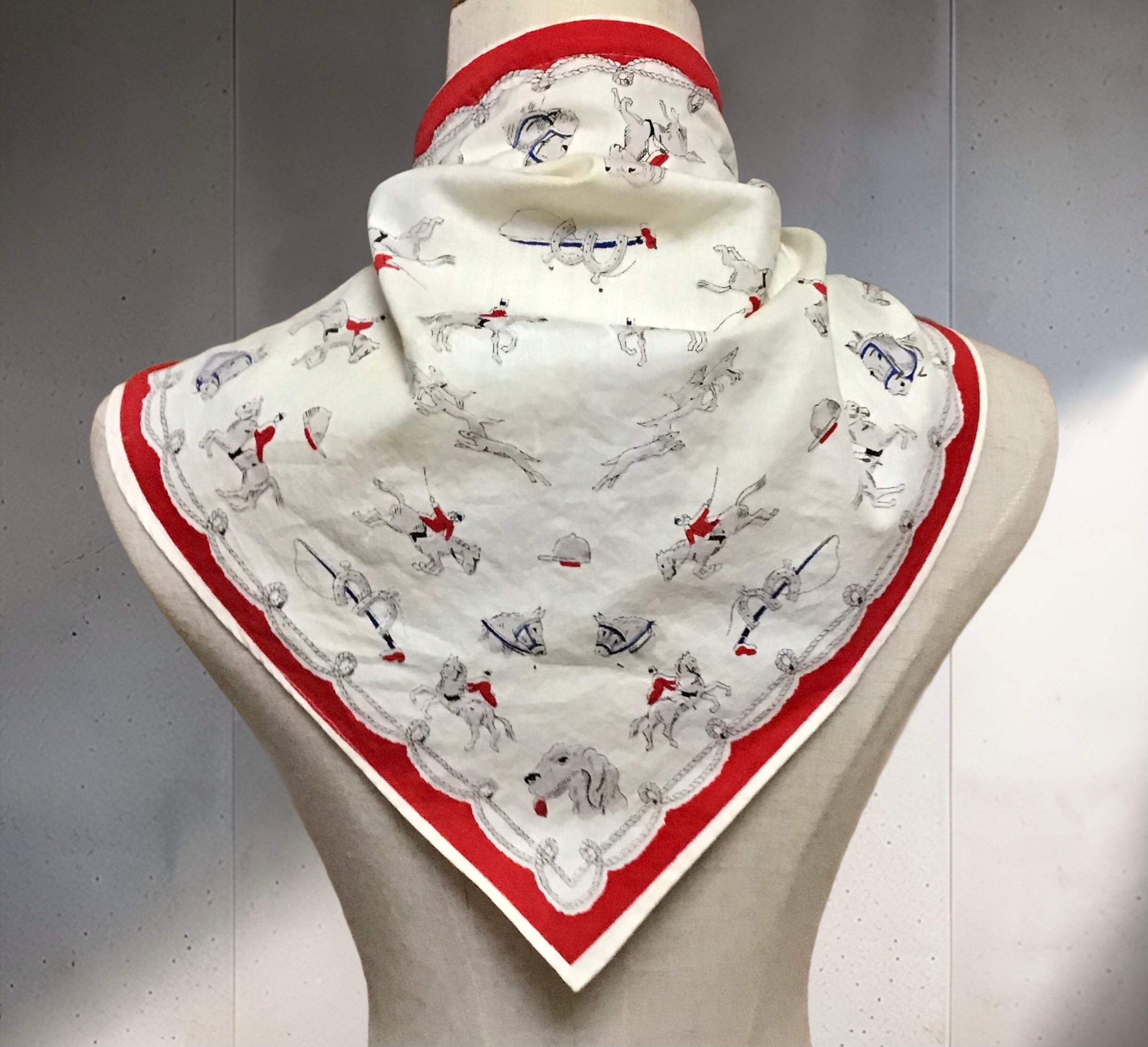 1940年代のコットンスカーフ、三角形のスカーフの端にカチューシャが入っているお品です。質感の良い生地に、ハンティング柄の犬や馬のタッチが良い雰囲気◎縁に入った赤もポイントになってとても可愛いです♡中のカチューシャも柔らかめでつけやすく、スカーフとして首にも違和感なくつけられます!