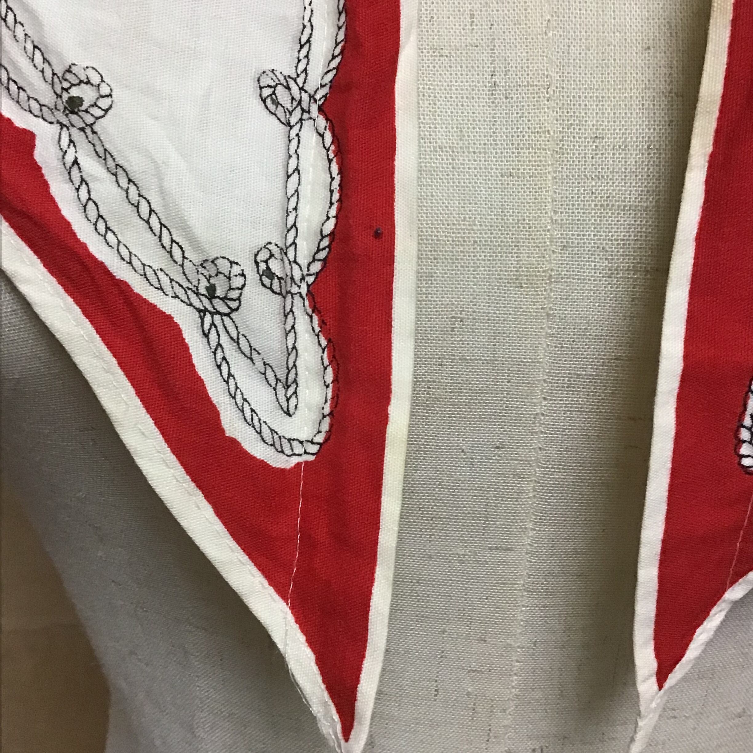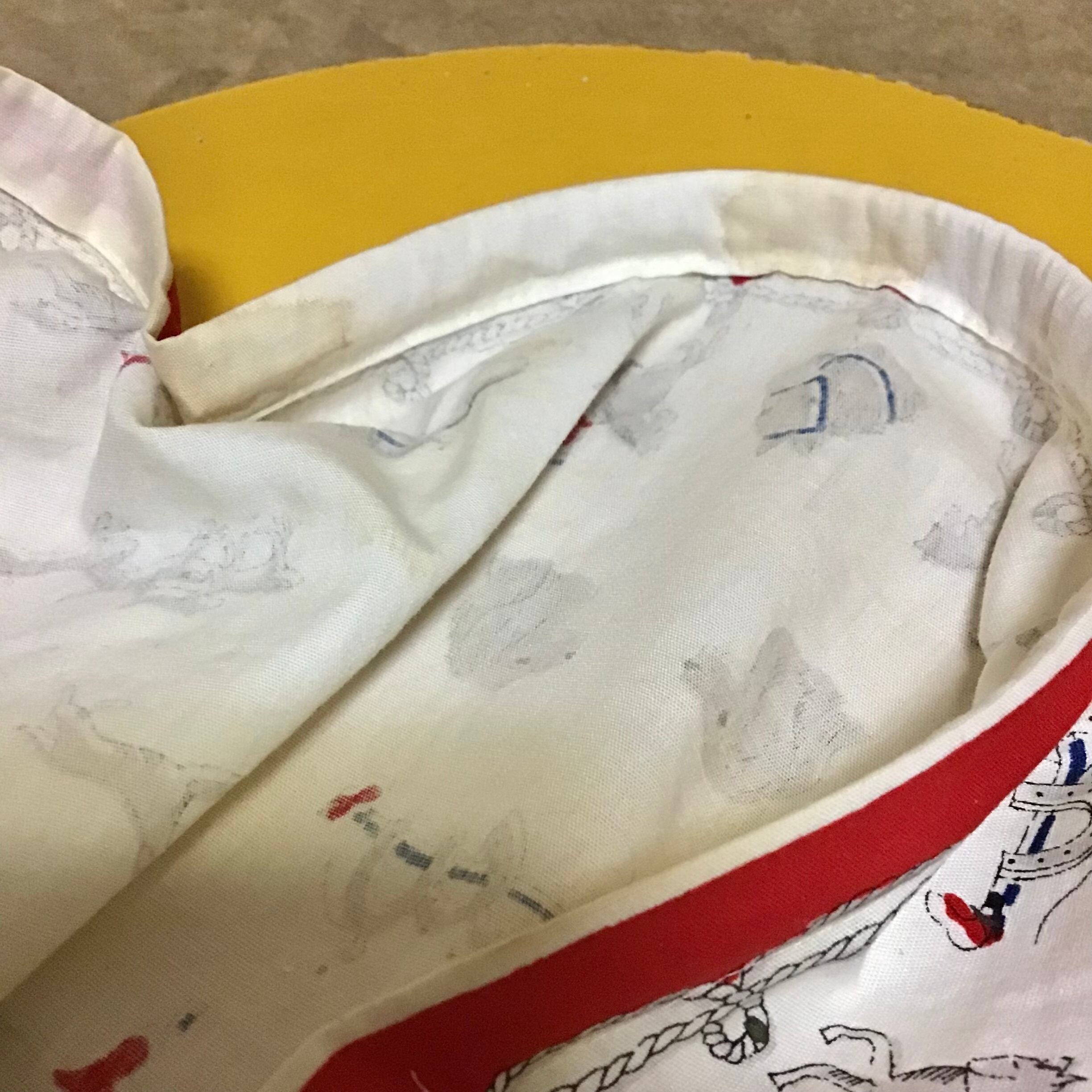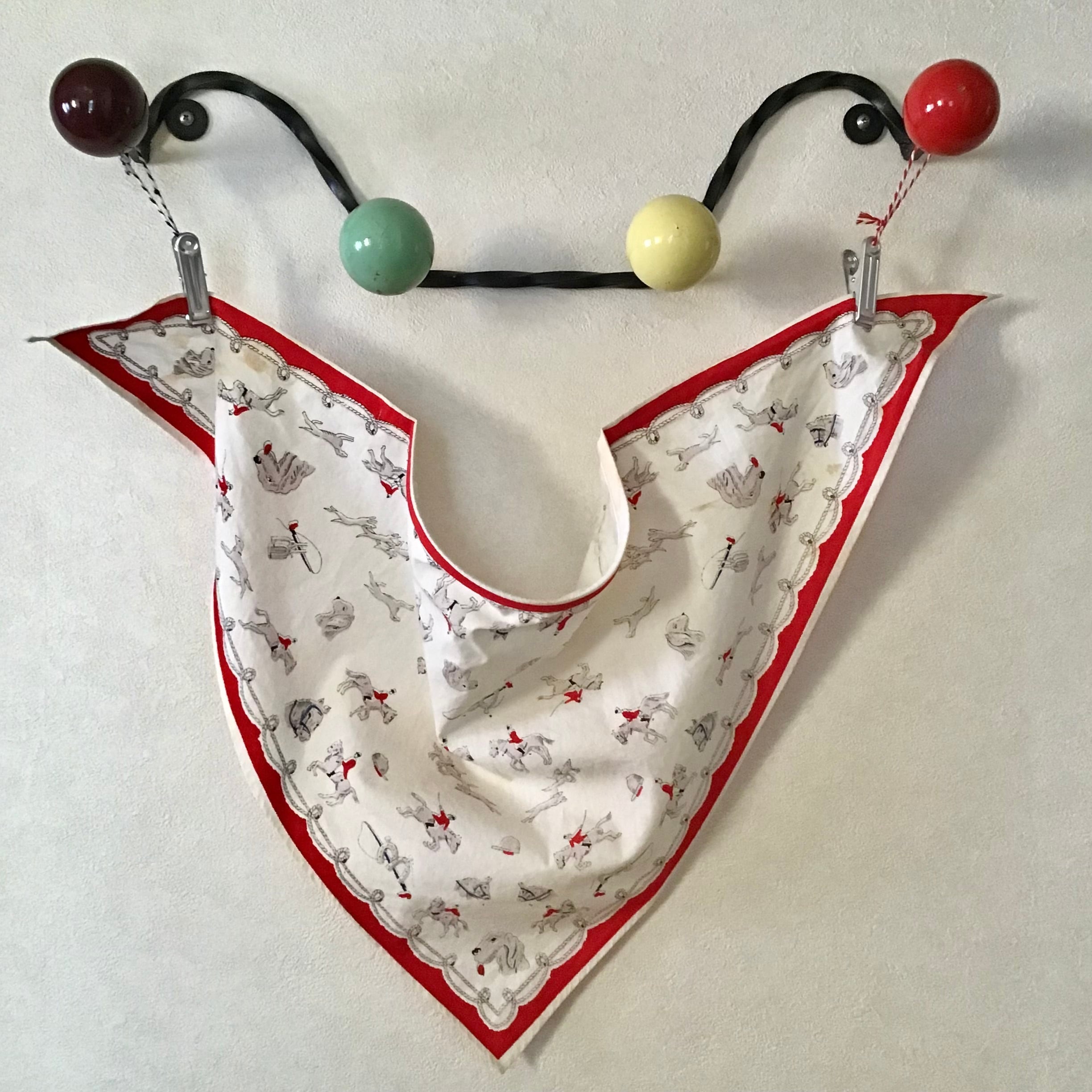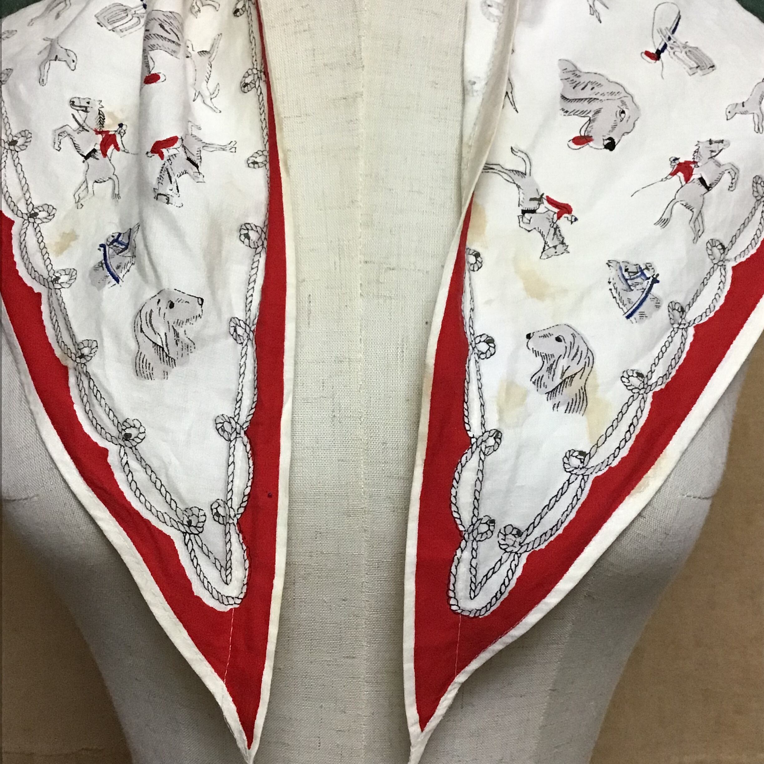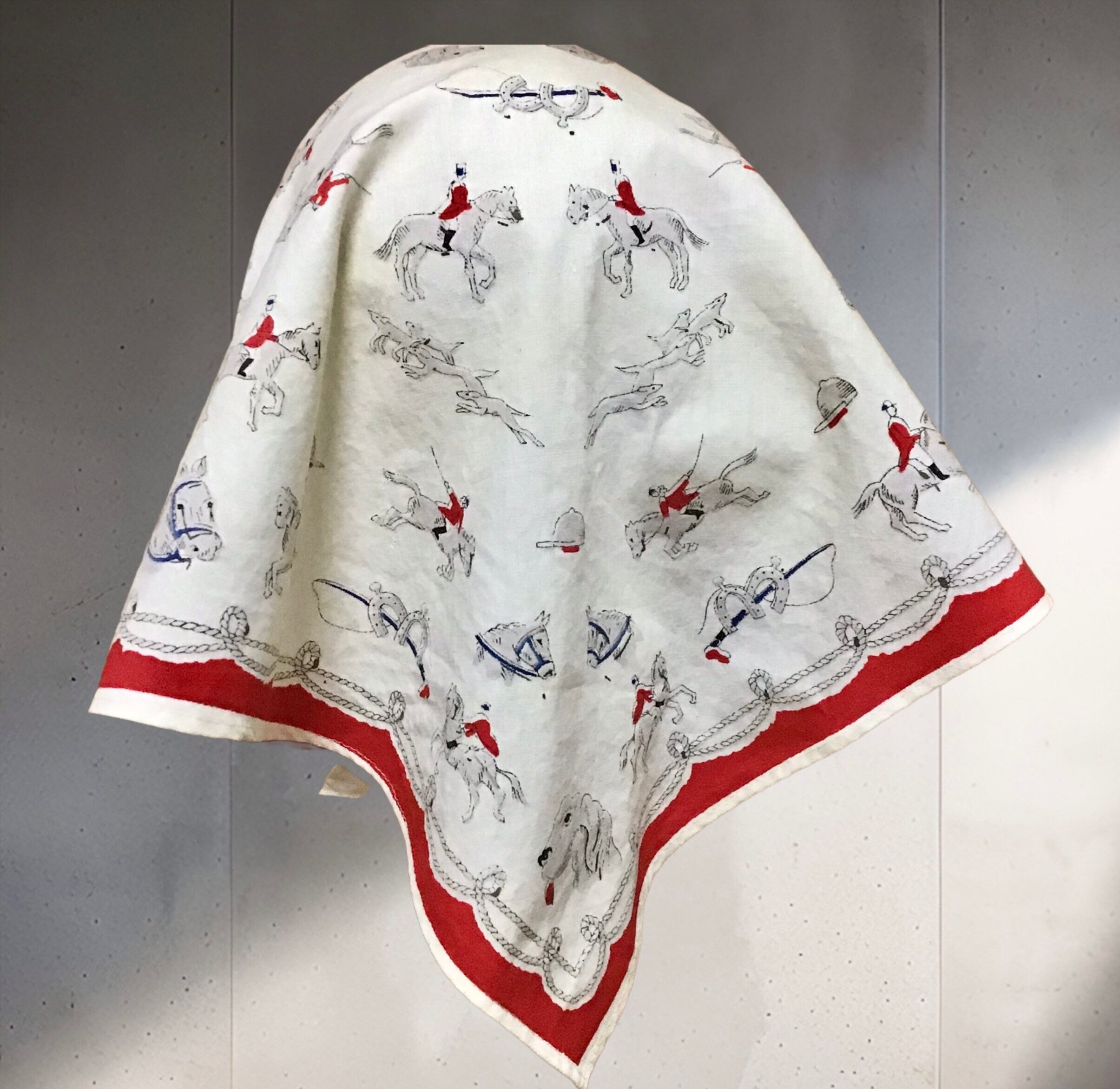 1940年代のコットンスカーフ、三角形のスカーフの端にカチューシャが入っているお品です。質感の良い生地に、ハンティング柄の犬や馬のタッチが良い雰囲気◎縁に入った赤もポイントになってとても可愛いです♡中のカチューシャも柔らかめでつけやすく、スカーフとして首にも違和感なくつけられます!