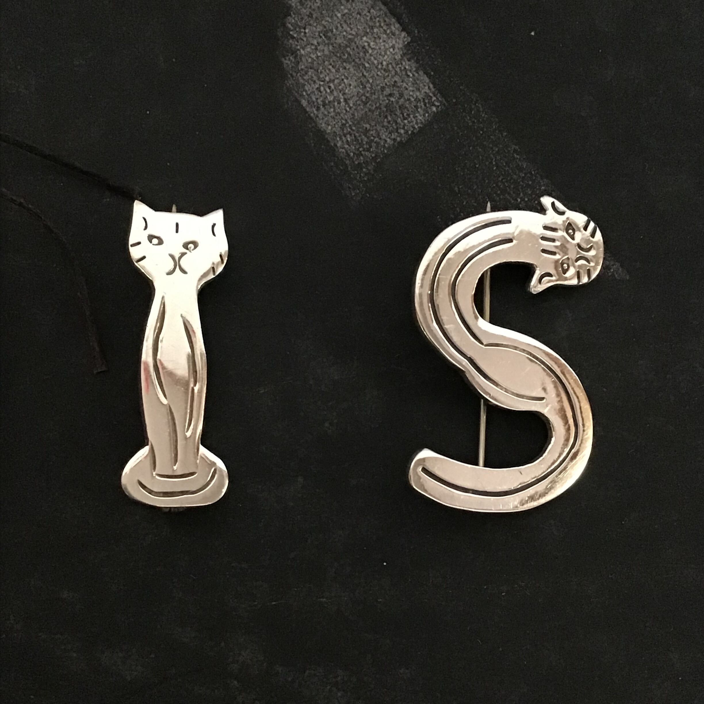 メキシコシルバー925の猫文字ブローチ。今回は7種類ご紹介です!クネっとしたり、ピンとしたり、いろいろな猫ちゃんがとっても可愛いです♡程よいサイズ感なので、重ね付けしてもくどくならず良い感じです◎
