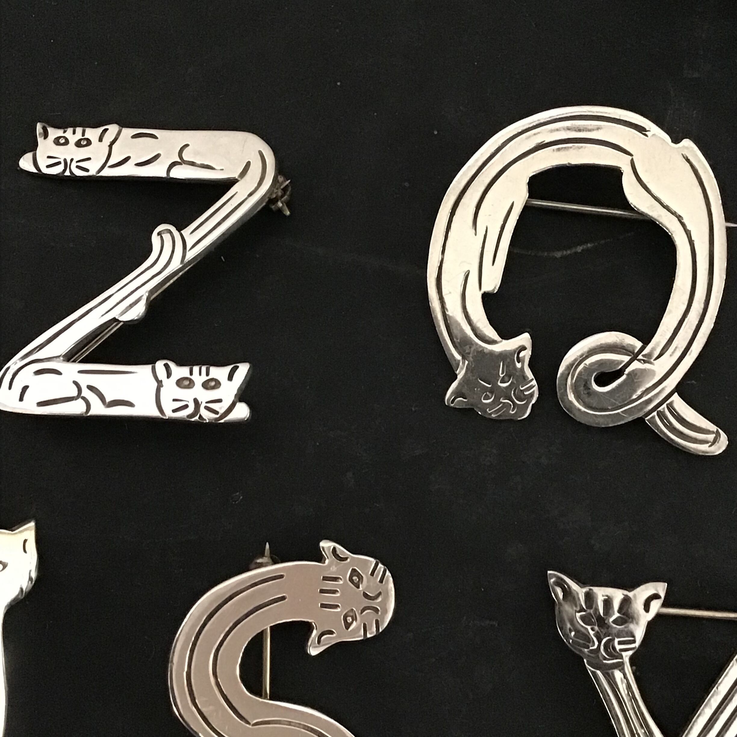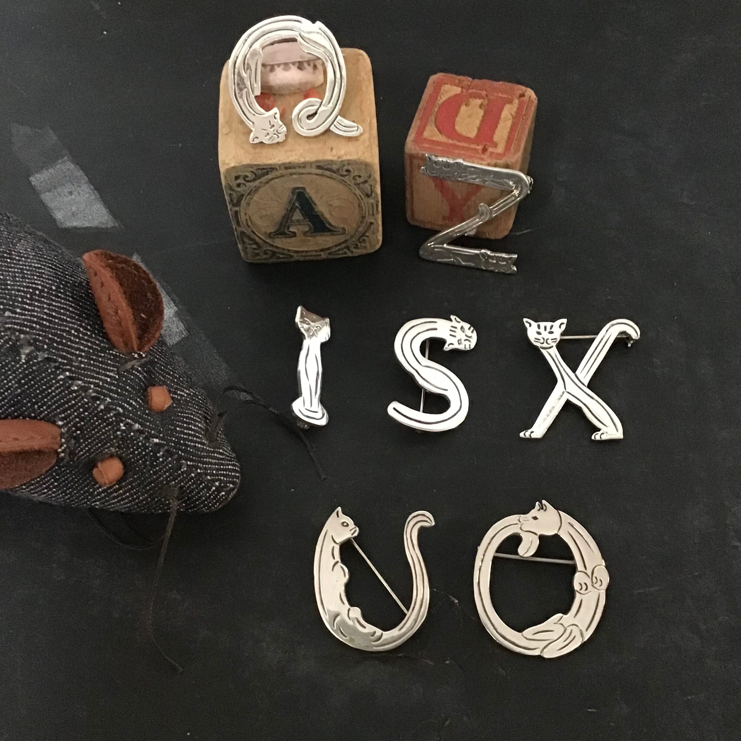 メキシコシルバー925の猫文字ブローチ。今回は7種類ご紹介です!クネっとしたり、ピンとしたり、いろいろな猫ちゃんがとっても可愛いです♡程よいサイズ感なので、重ね付けしてもくどくならず良い感じです◎