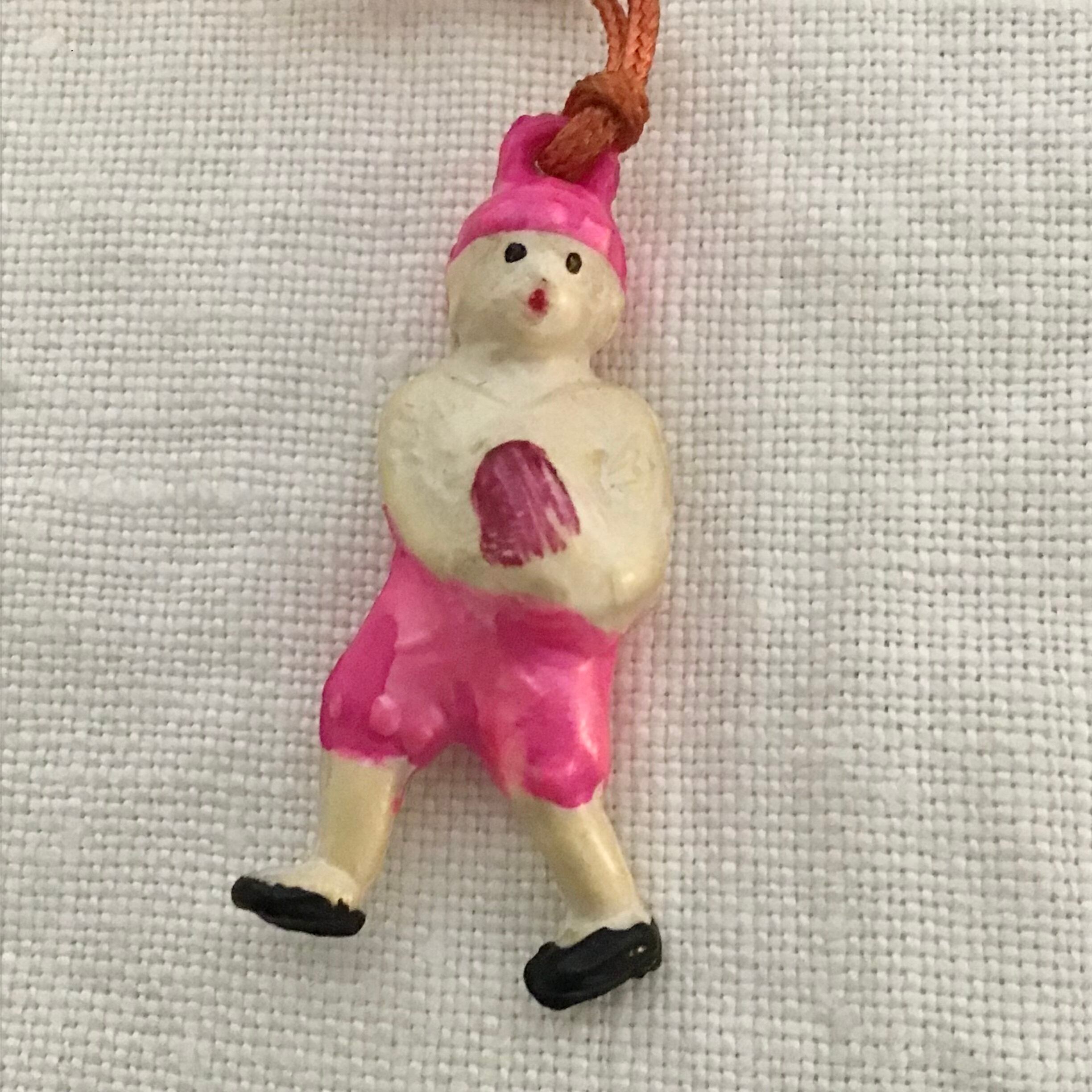 1950年代頃のガムボールのおまけチャーム、ピンクがポイントのフットボール選手。当時の紐がそのまま付いており、ブローチやネックレスにしたり、襟の先やお気に入りのポーチに縫い付けても可愛いです♡ボールチェーンをお付けしますので必要に応じてお使いください◎