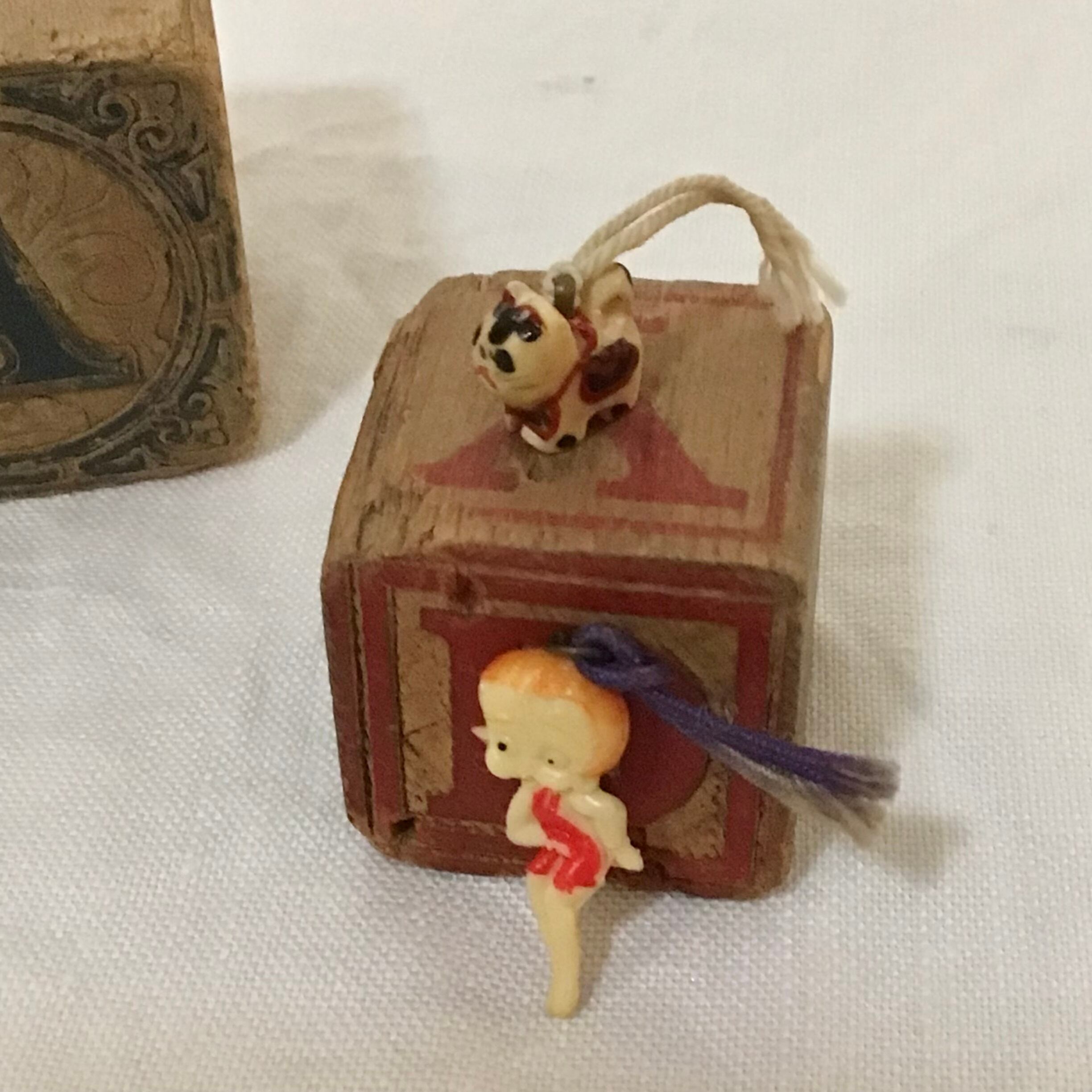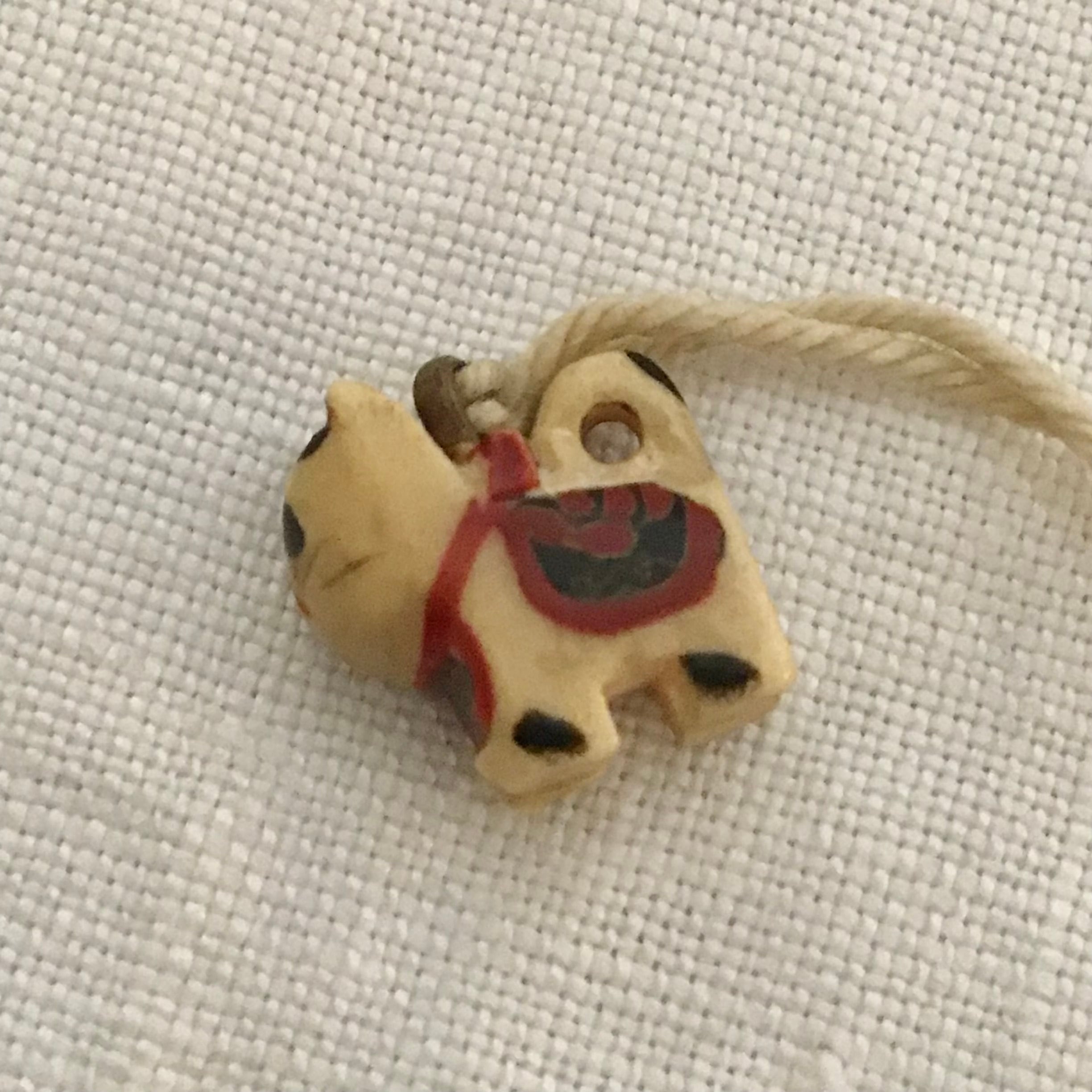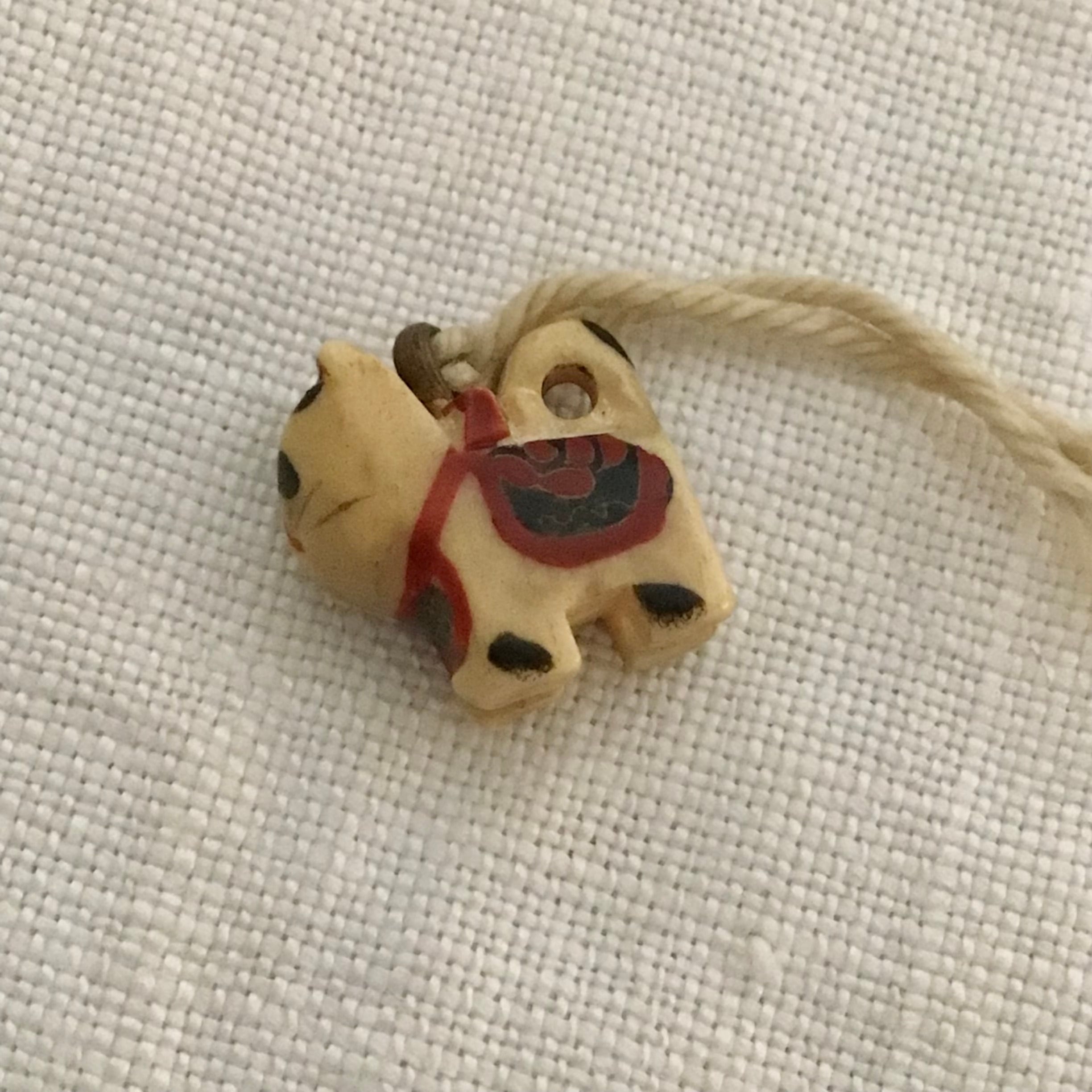 1950年代頃のガムボールのおまけチャーム、小さな狛犬。当時の紐がそのまま付いており、ブローチやネックレスにしたり、襟の先やお気に入りのポーチに縫い付けても可愛いです♡ボールチェーンをお付けしますので必要に応じてお使いください◎